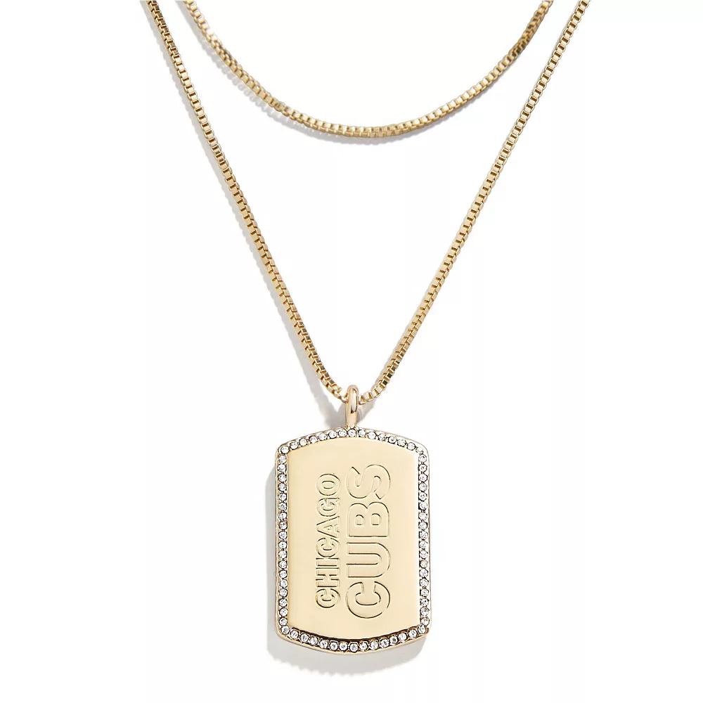 Make your team spirit sparkle and shine with this Chicago Cubs Dog Tag necklace. BaubleBar and WEAR by Erin Andrews collaborated to create this layered set featuring debossed details on both sides of the dog tag pendant and shimmering embellishments. A lobster claw clasp ensures this Chicago Cubs necklace fits just right. Wipe clean with a damp cloth Lobster claw clasp with 3.75 extender Material: 100% Gold-Plated Sterling Silver Glass stones Drop length measures approx. 11.5 Debossed graphics Brand: WEAR by Erin Andrews Dog tag measures approx. 1 Layered Hypoallergenic Imported Double-side design Officially licensed