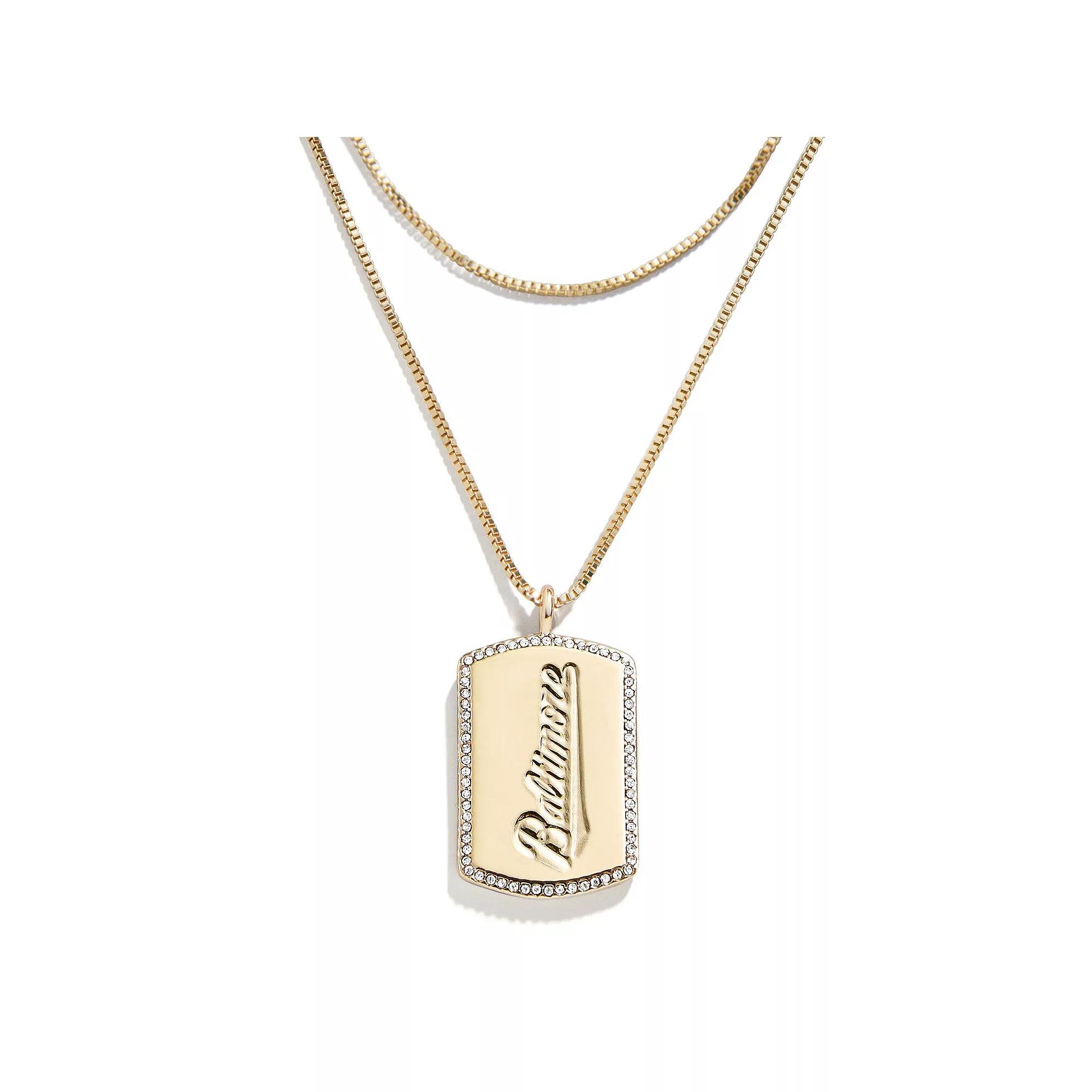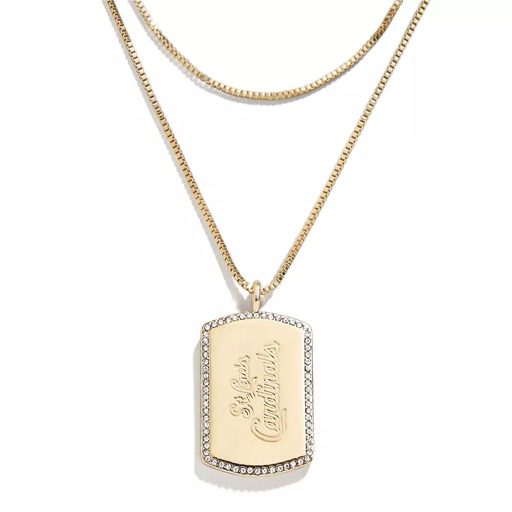 Make your team spirit sparkle and shine with this St. Louis Cardinals Dog Tag necklace. BaubleBar and WEAR by Erin Andrews collaborated to create this layered set featuring debossed details on both sides of the dog tag pendant and shimmering embellishments. A lobster claw clasp ensures this St. Louis Cardinals necklace fits just right. Wipe clean with a damp cloth Glass stones Lobster claw clasp with 3.75 extender Officially licensed Debossed graphics Hypoallergenic Double-side design Dog tag measures approx. 1 Layered Drop length measures approx. 11.5 Brand: WEAR by Erin Andrews Material: 100% Gold-Plated Sterling Silver Imported