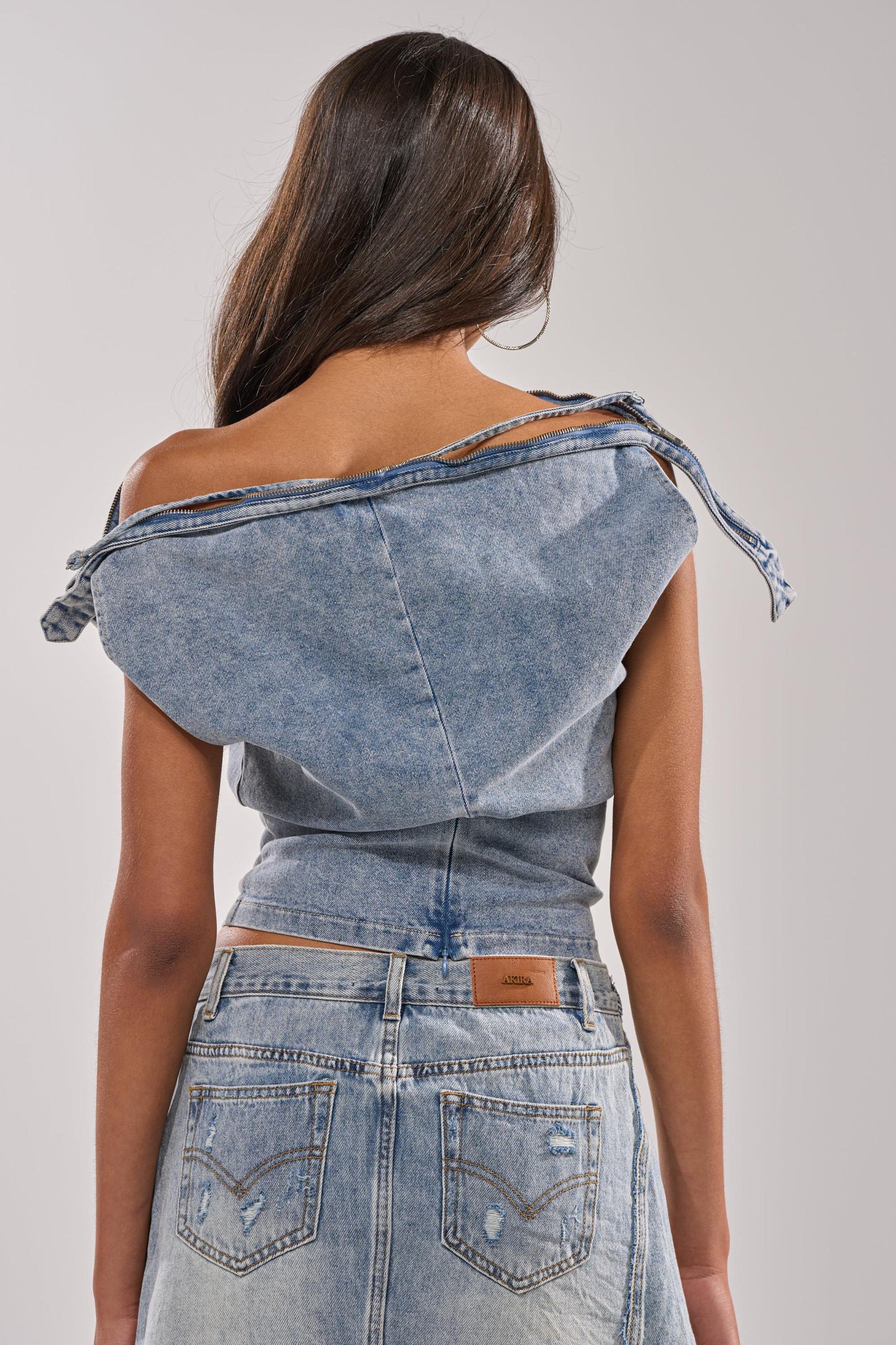 Trendy and body-contouring denim off-the-shoulder top designed for streetwear with a modern, fashion-forward edge. Crafted from soft, stretch denim, this fitted piece features a wide double-zippered neckline with drape tie detailing for a customizable, slouched off-shoulder look. The structured seams and cropped length with a back zipper enclosure create a flattering, waist-defining shape while maintaining comfort and flexibility. Perfect for pairing with high-waisted jeans, skirts, or statement bottoms, this chic denim top is ideal for elevated casual wear, night-out styling, or contemporary streetwear looks. - 68% Cotton 30% Polyester 2% Spandex- Slight Stretch- Imported (all measurements are approximate from size small)- 20” Shoulder to Hem- 18” Shoulder to Shoulder- Model is 5’10” and wearing size smallProduct ID: 1077110 (all measurements are approximate from size 1X)- 22” Shoulder to Hem- 22” Shoulder to ShoulderProduct ID: 1077114