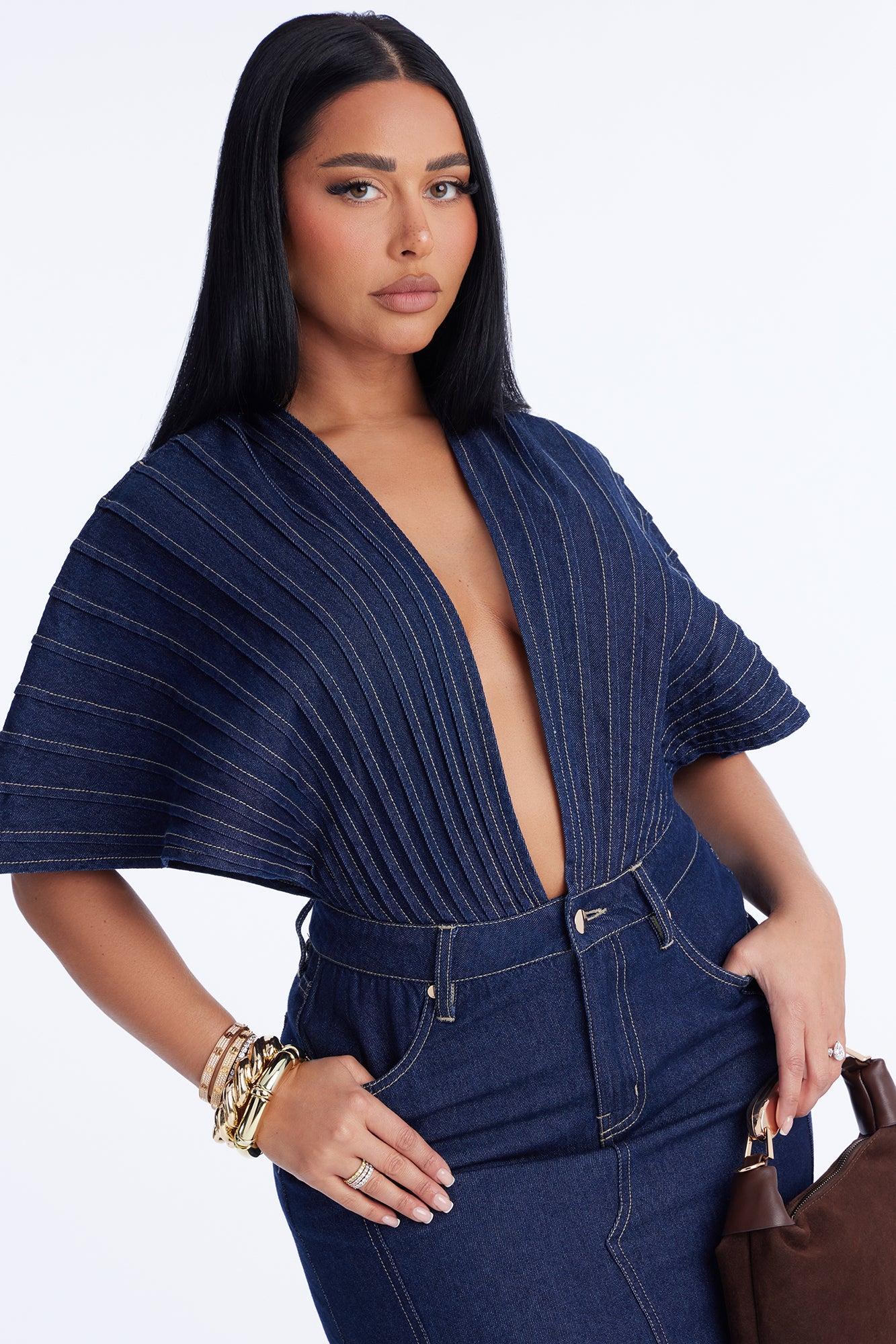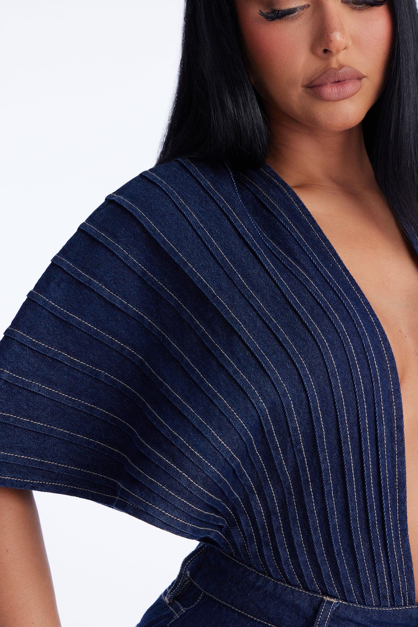 Available In Dark Denim. Denim Maxi Dress Short Sleeve Pleated Detail V- Neckline Belt Loops Pockets Backless Tie Back Front Slit Front Button And Zipper Closure Non Stretch Self: 100% Cotton Imported
