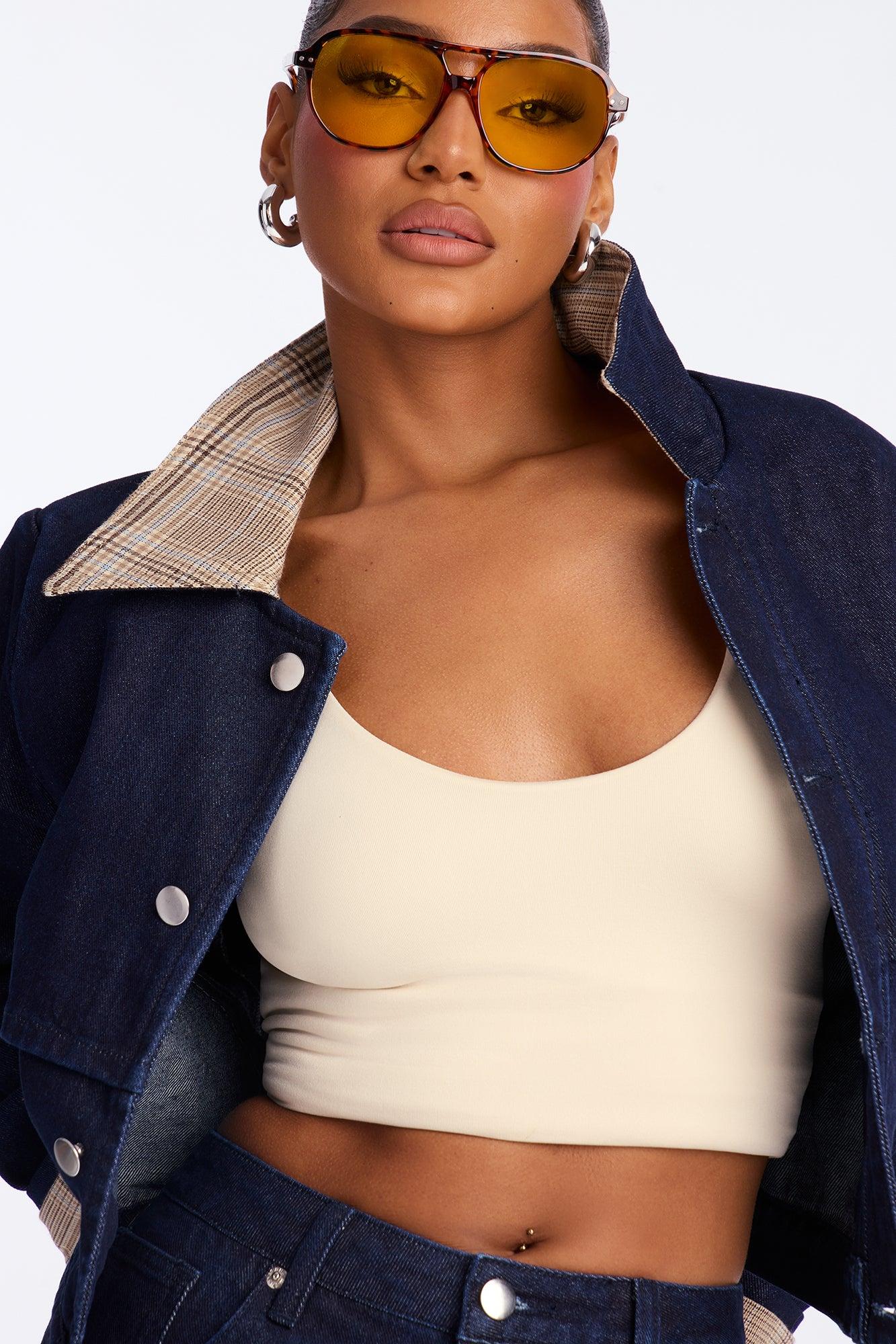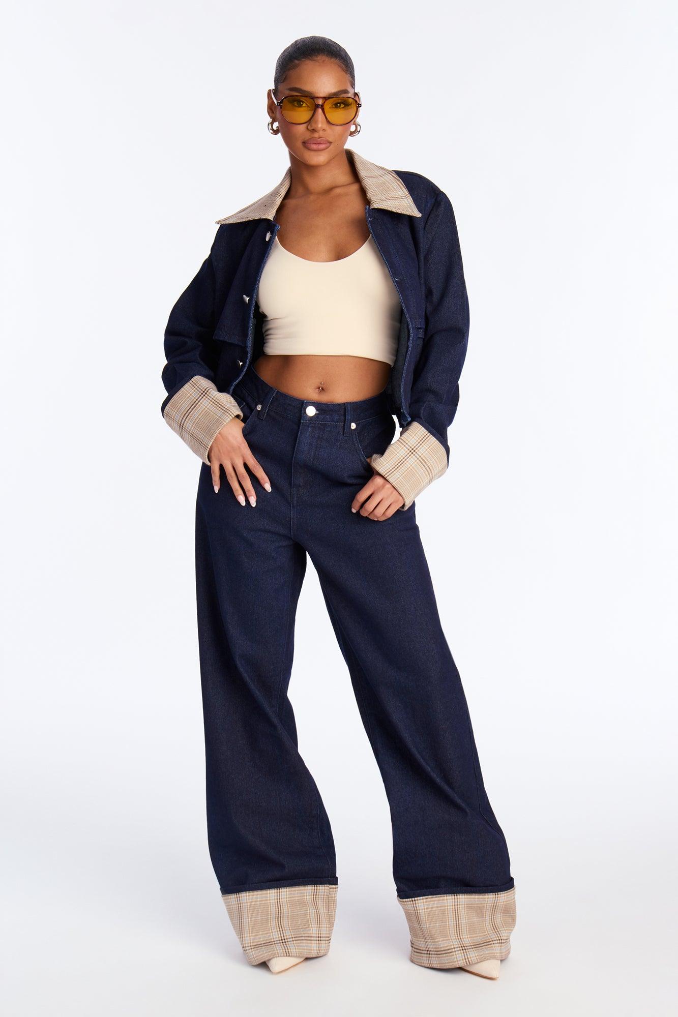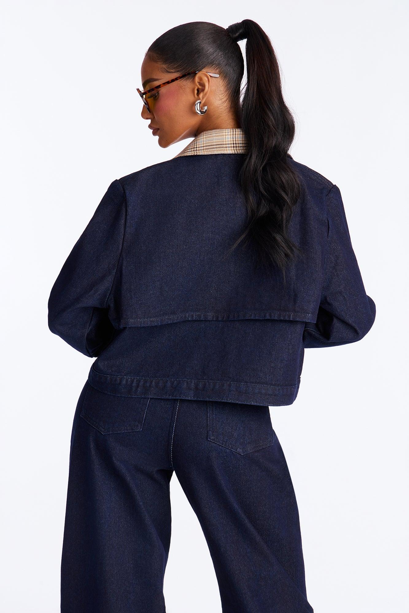 Available In Dark Wash. Pair With Well Read Gal Cuffed Wide Leg Jeans Denim Jacket Plaid Trim Collar Button Closure Cropped Functional Pockets Denim Rigid Disclaimer: Due the To The Specialized Dye Process, Loose Dye Can Stain On Contact. Do Not Wash with Other Garments Self: 86% Cotton 7% Polyester 7% Rayon Trim: 99% Polyester 1% Spandex Imported California Proposition 65WARNING: Cancer and Reproductive Harm - www.P65Warnings.ca.gov.