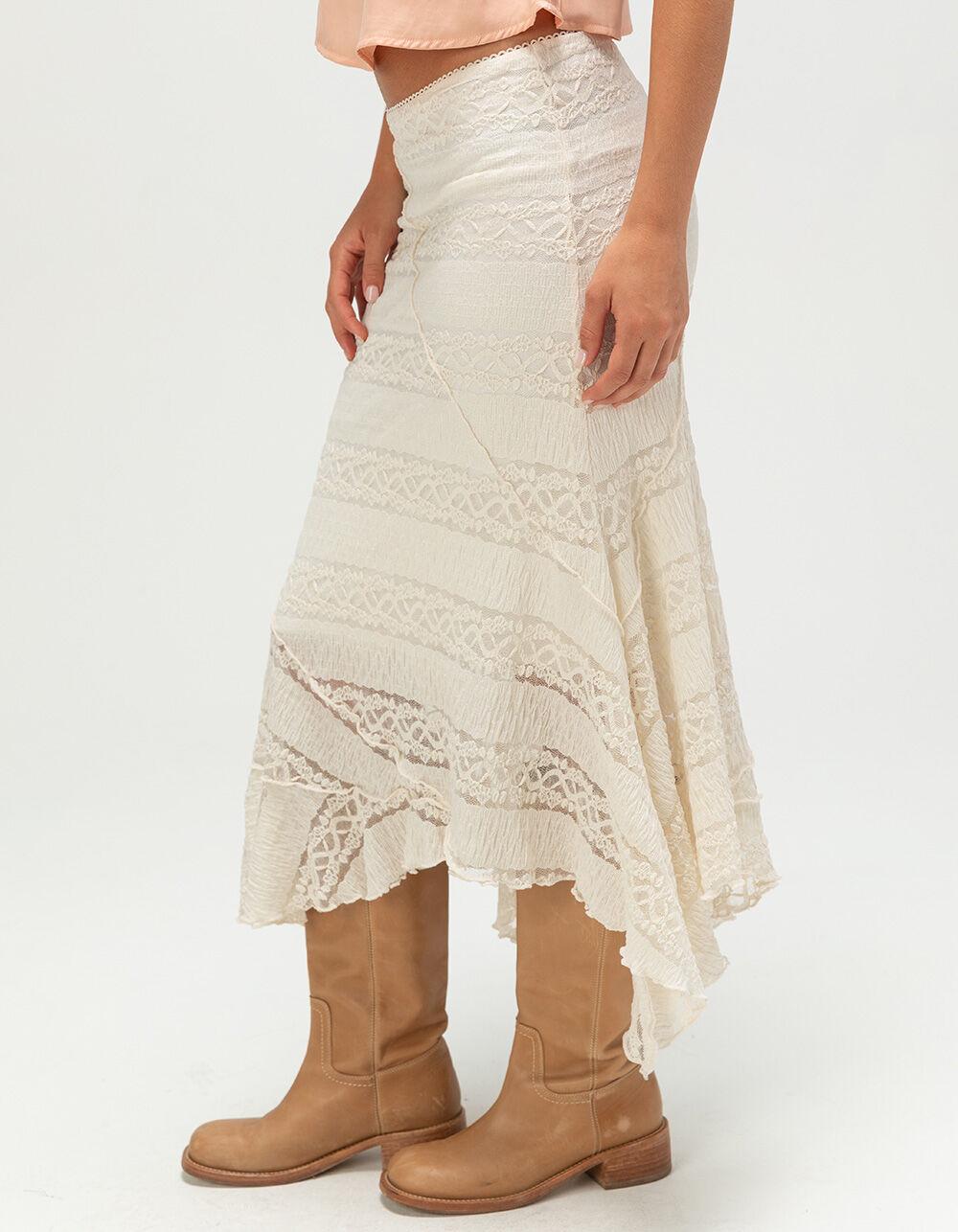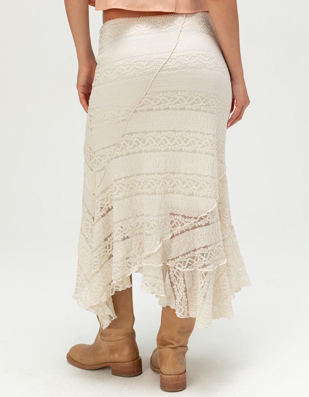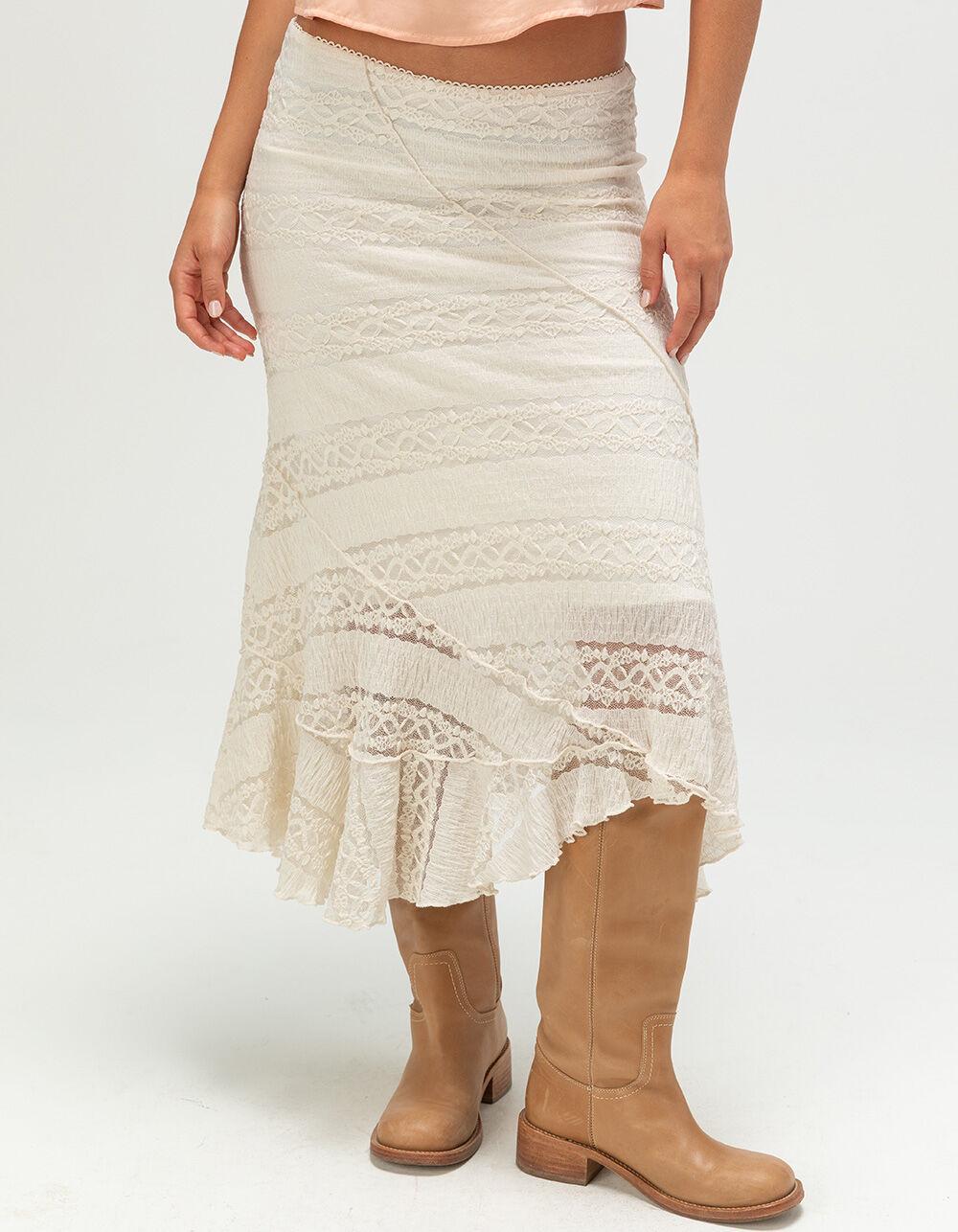 West Of Melrose Lace Asymmetrical Midi Skirt. Add a touch of romance and edge to your wardrobe with the West Of Melrose Lace Asymmetrical Midi Skirt. Featuring a slightly sheer lace and mesh design, this skirt brings elegant texture and movement to any outfit. The asymmetrical hemline adds a modern twist, while the elastic waist with delicate picot trim ensures a comfortable and flattering fit. Fully lined for easy wear, this midi skirt falls to an approximate length of 33 inches, making it perfect for dressing up with heels or down with boots. A versatile statement piece that effortlessly blends femininity with a fashion-forward silhouette. 92% Polyester 8% Spandex. Lining: 95% polyester 5% Spandex. Hand wash. Imported.