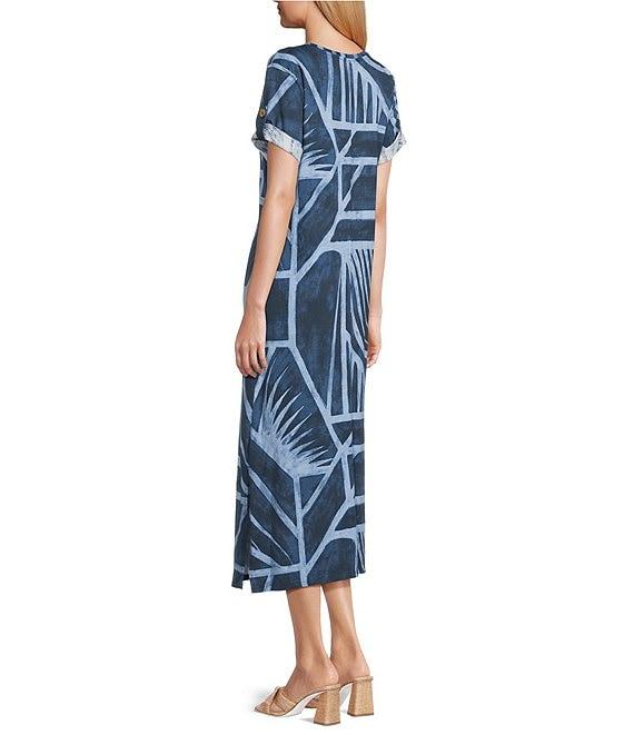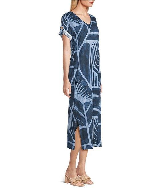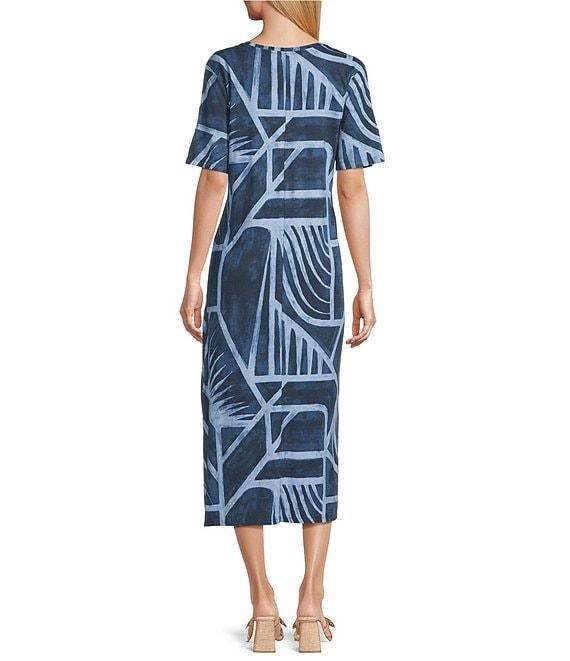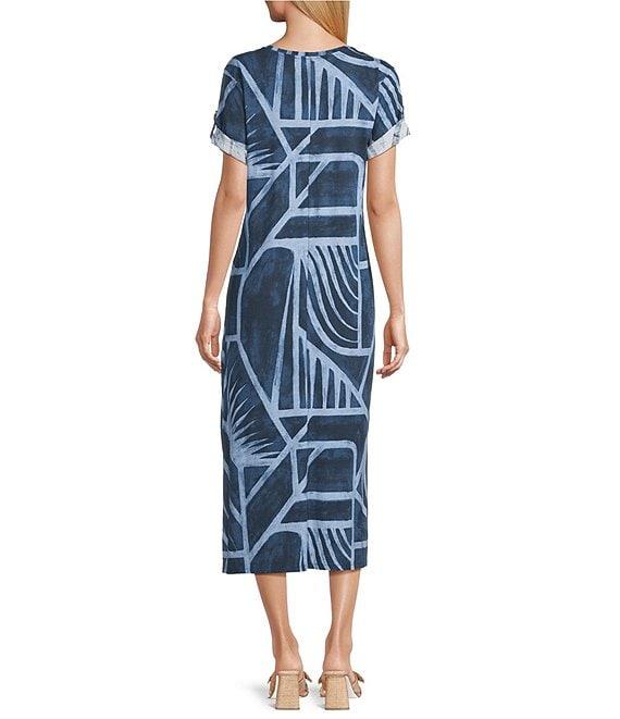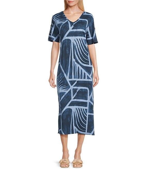 Westbound Blue Geo Tex Short Sleeve V-Neck Midi Dress