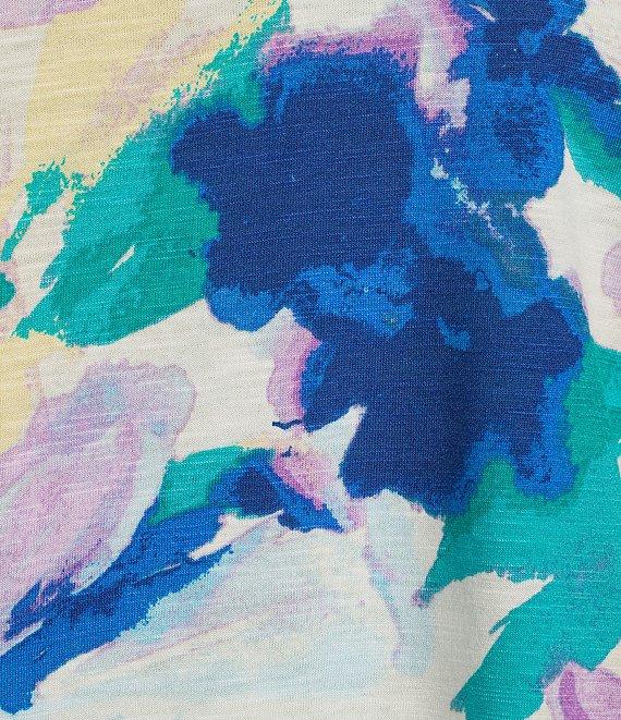 Westbound Petite Size Watercolor Dahlia Knit 3/4 Sleeve Crew Neck Ribbed Detail Multi Print Top