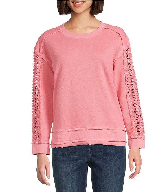 From Westbound, this top features: Knit fabrication Long sleeves Pullover construction Crew neckline Lace insets on arm Raw edge details Ribbed collar, hem, and cuffs Catskill terry Cotton/polyester Machine wash/tumble dry Imported.