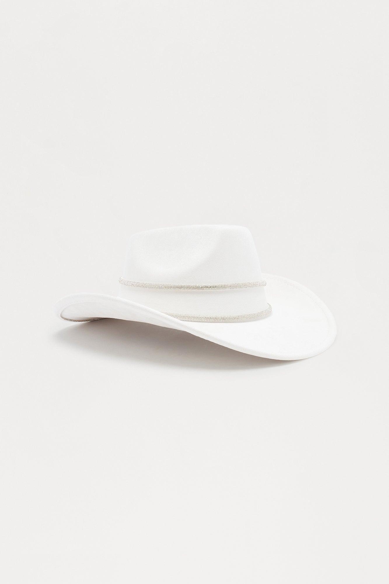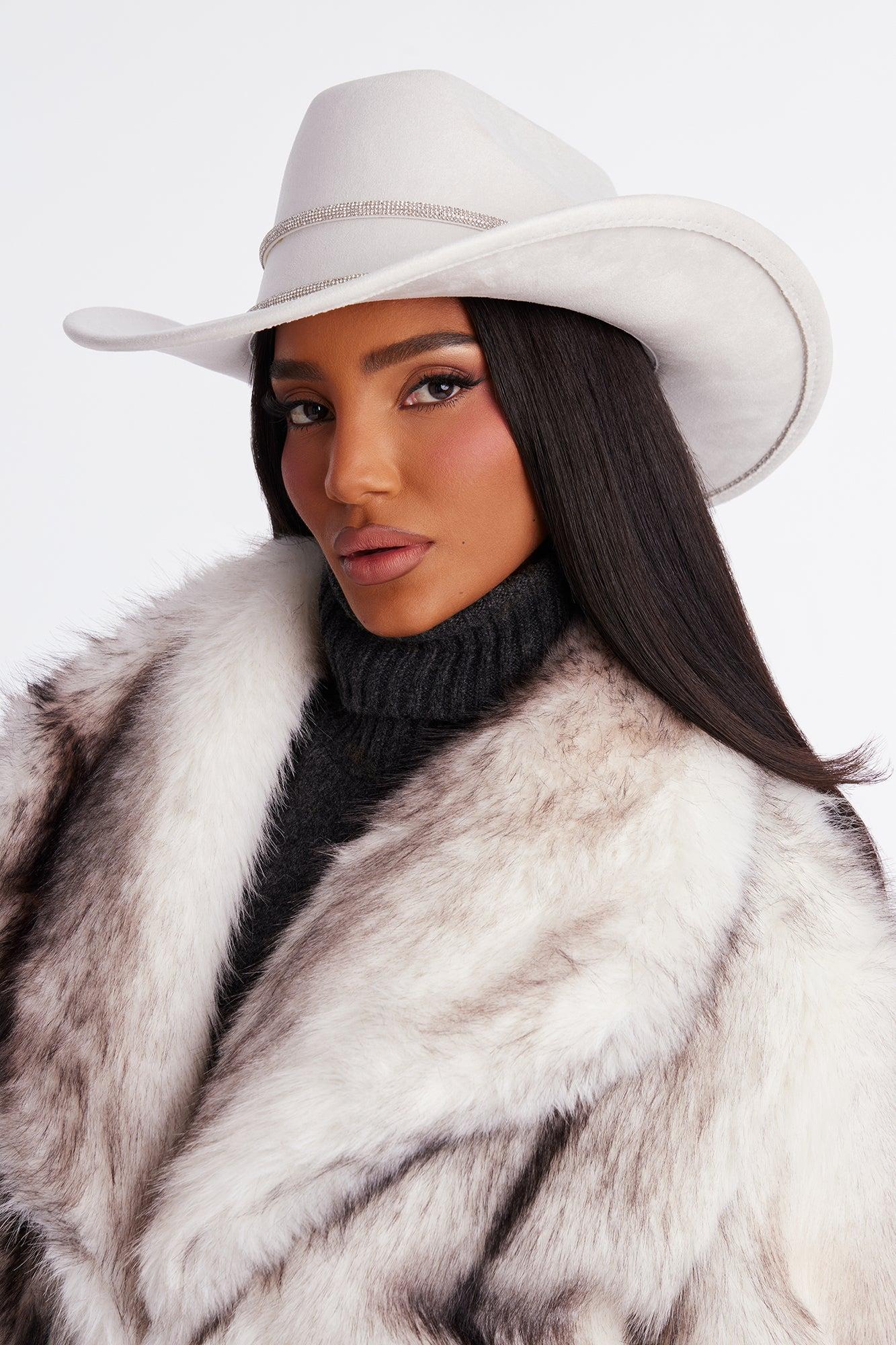 Available In Beige And Black. Cowboy Hat Layered Rhinestone Trim Detail Faux Suede Material 100% Polyester Imported California Proposition 65WARNING: Cancer and Reproductive Harm - www.P65Warnings.ca.gov.