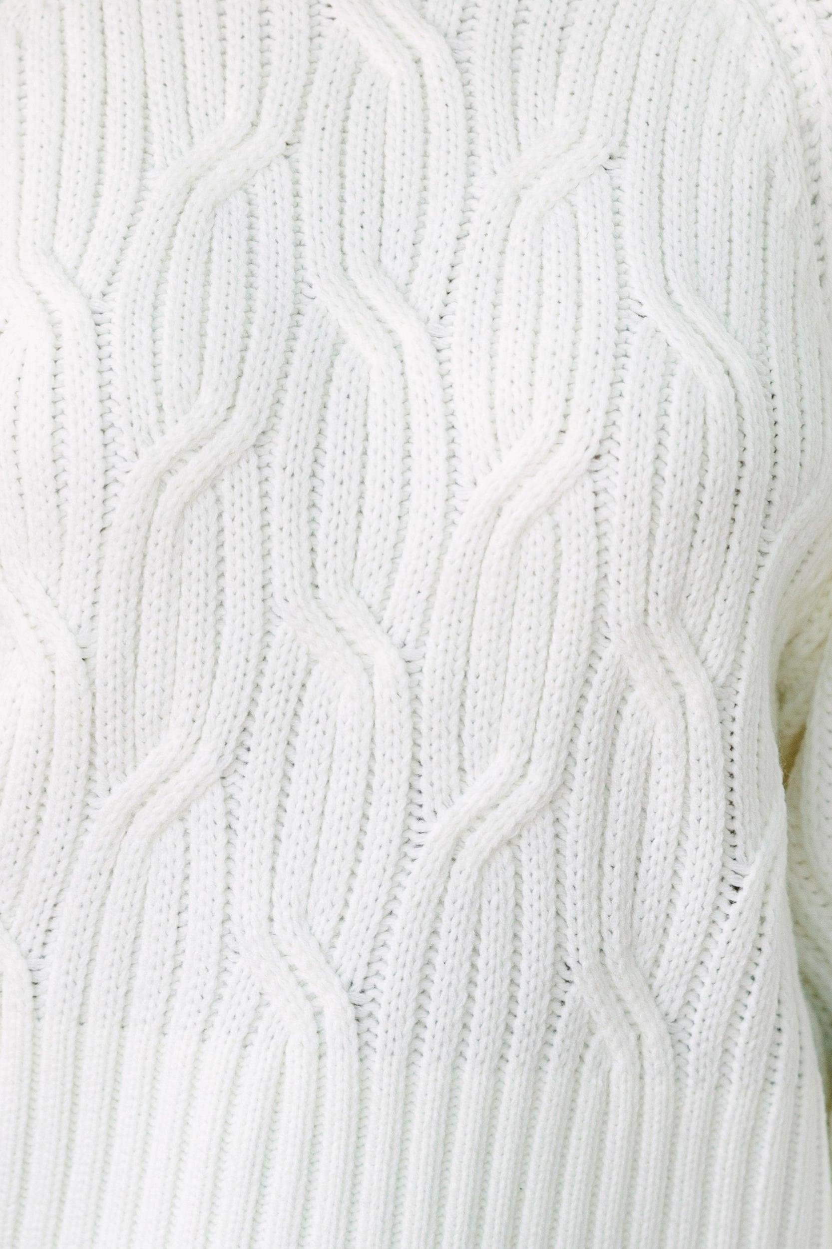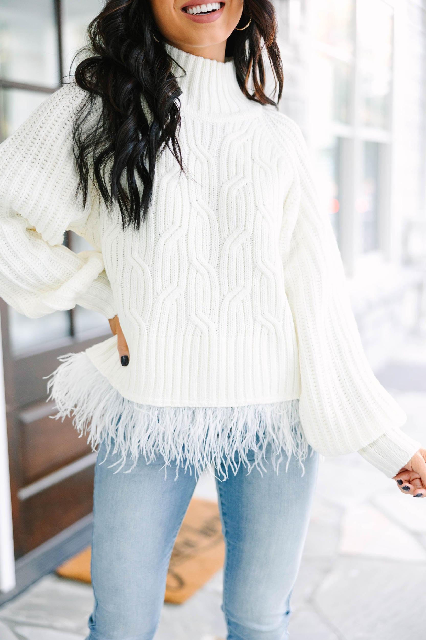 This sweater is so cute! We are obsessed with that feather trim! It's so sassy and fun! This mock neck sweater is going perfectly dress up a classic pair of jeans but will also look fab with a skirt. Mock neckline Long bubble sleeves Cable knit fabric Feather trim Fair stretch Cindy is wearing the small.