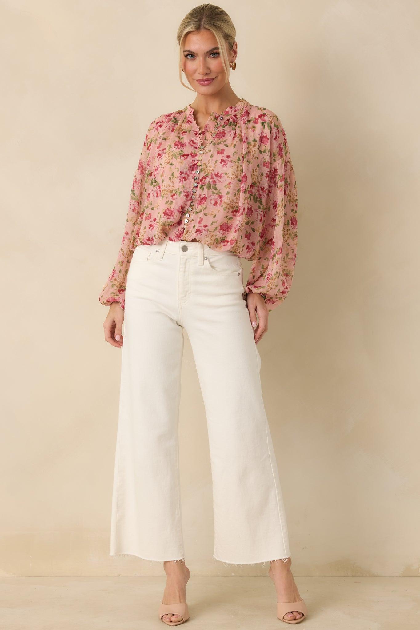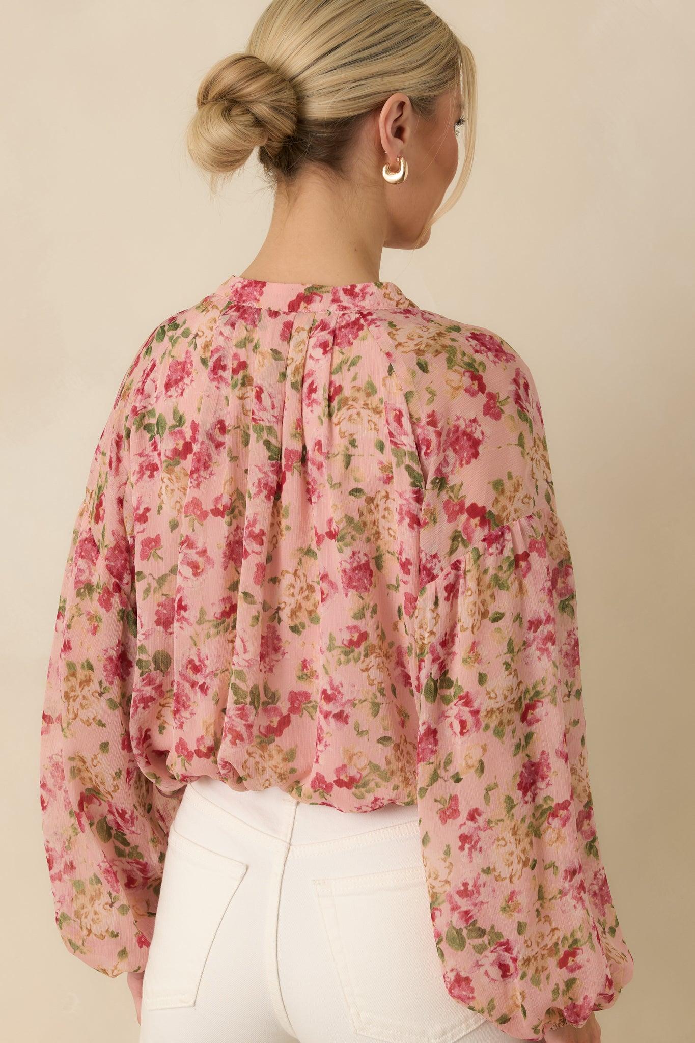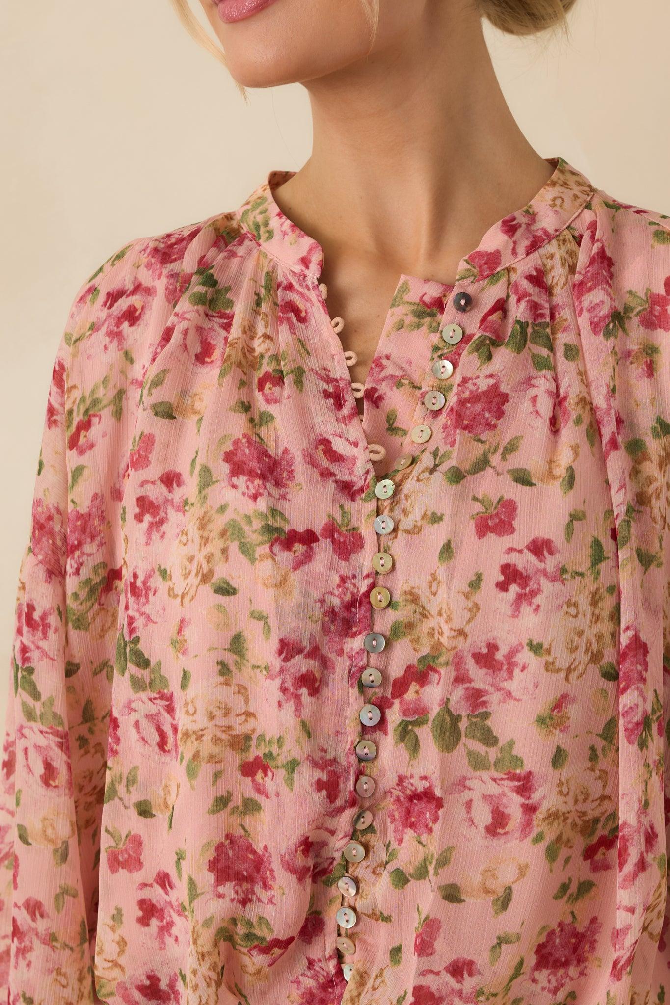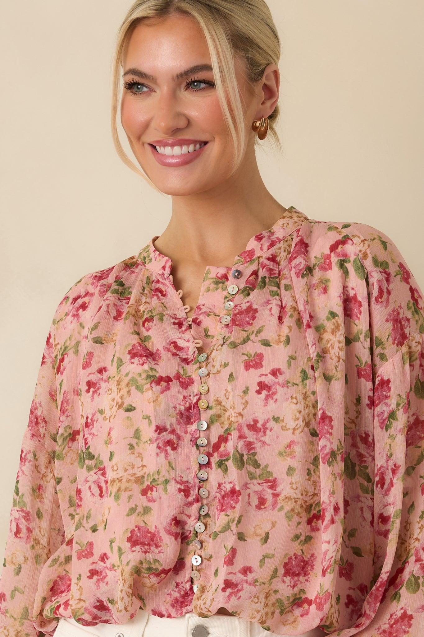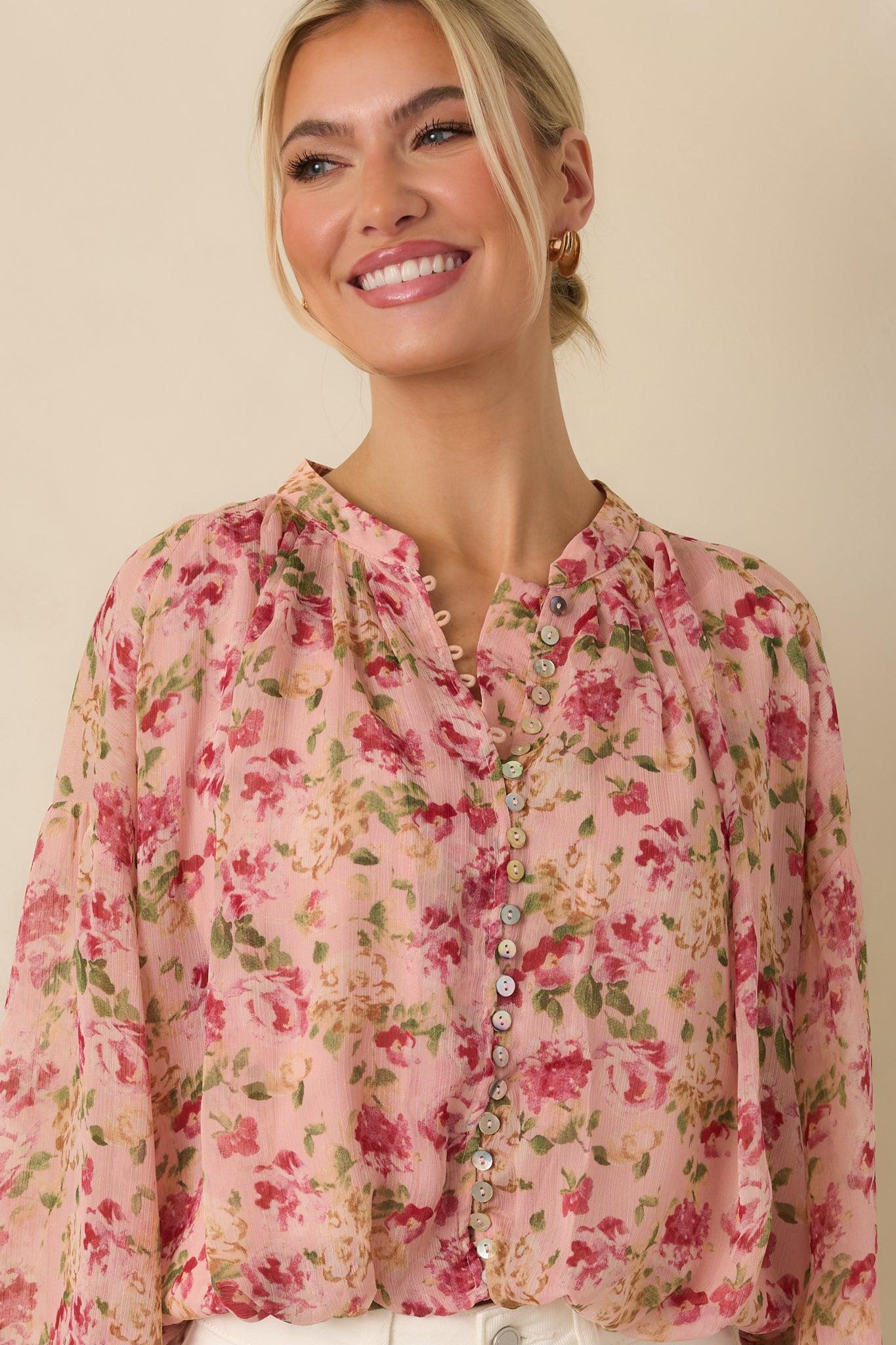 Where Roses Drift Blush Pink Multi Floral Sheer Blouse feels like a quiet moment suspended in time—soft florals floating across sheer fabric with an effortlessly romantic ease. The airy silhouette moves gently with you, while delicate details like abalone shell buttons and billowy sleeves give it a vintage-inspired, dreamlike charm. It’s the kind of blouse that elevates even the simplest denim, inviting softness, light, and a little poetry into your everyday. This blush pink sheer blouse features a button-front design with abalone shell buttons and loop closures. Designed with fully sheer long sleeves, front and back paneling, and an elasticized, gently ballooned waist and cuffs for a flattering, bloused fit. Lightweight and flowy throughout with a soft drape and romantic movement. 100% Polyester Lining: 100% Polyester Hand Wash Cold Manufactured in China Designed in the USA Model is 5'6" and wearing size small, clipped, model is a true x-small