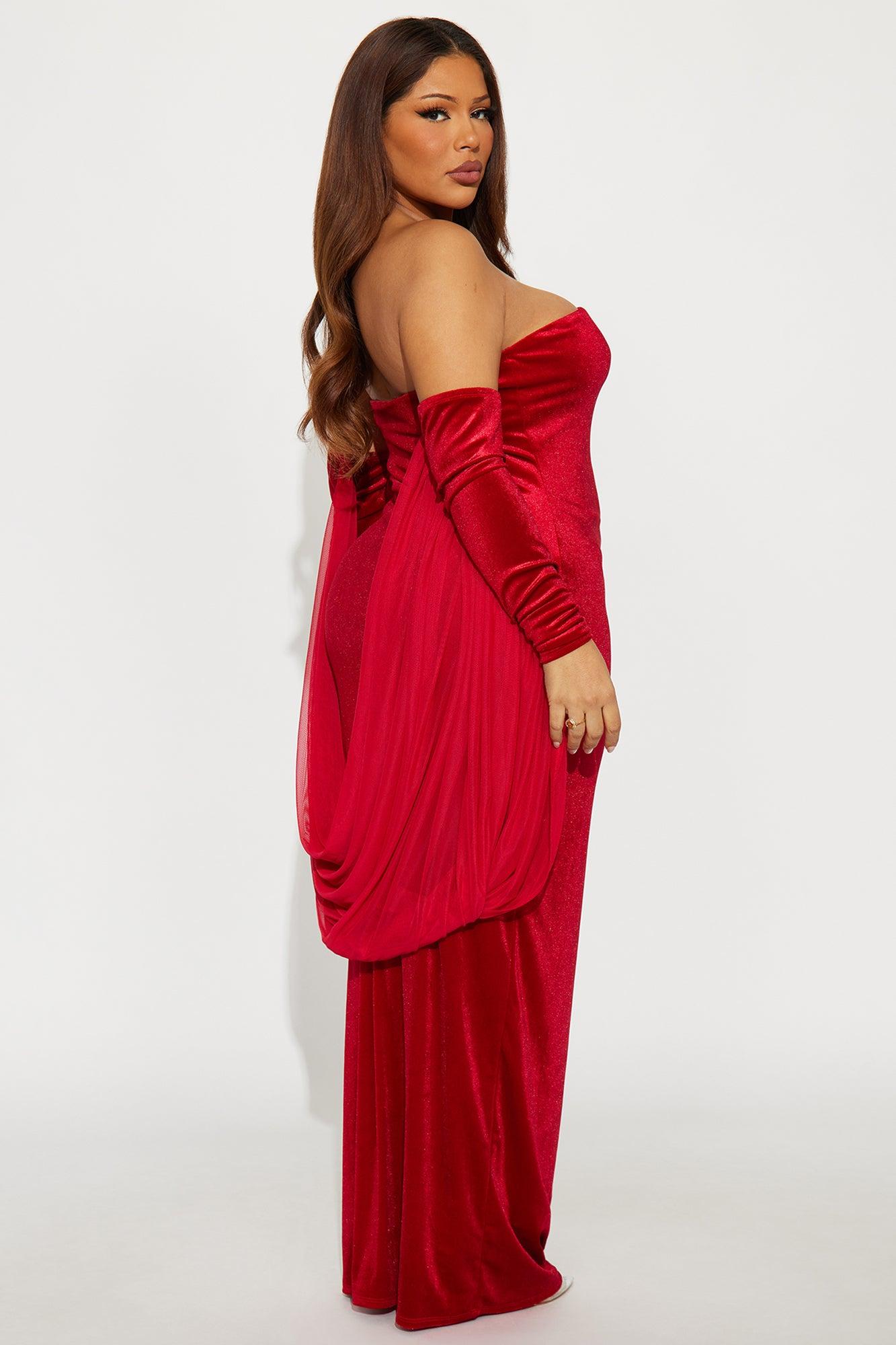 Available In Black And Red. Velvet Gown Detached Sleeves Draped Detail Straight Neckline Lined Stretch Top Self: 95% Polyester 5% Spandex Contrast: 95% Polyester 5% Spandex Dress: 95% Polyester 5% Spandex Lining: 100% Polyester Imported