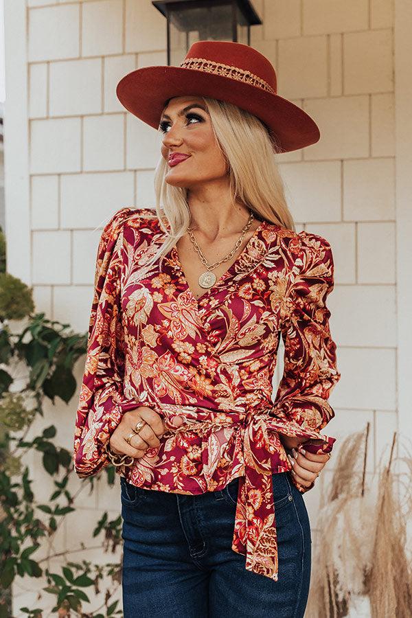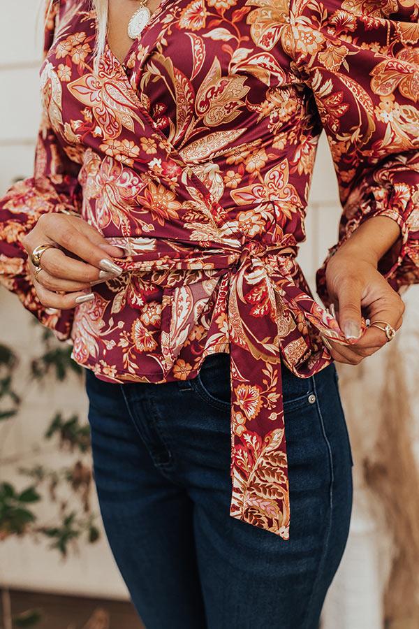 Stay gorgeous for a night out on the town in this trendy new top! Features lightweight wine colored satin fabric with a rust, pink, and sage hued abstract floral pattern, a wrap bodice with side tie closure, a v-cut neckline with hidden snap closure, long loose sleeves with elastic cuffs, and a flirty silhouette that ends in a rounded hemline. Measurements S : Bust 34", Hip 34", Length 21.5", Sleeve Length 23.5", Waist 32". M : Bust 36", Hip 36", Length 22", Sleeve Length 24", Waist 34". L : Bust 38", Hip 38", Length 22.5", Sleeve Length 24", Waist 36".