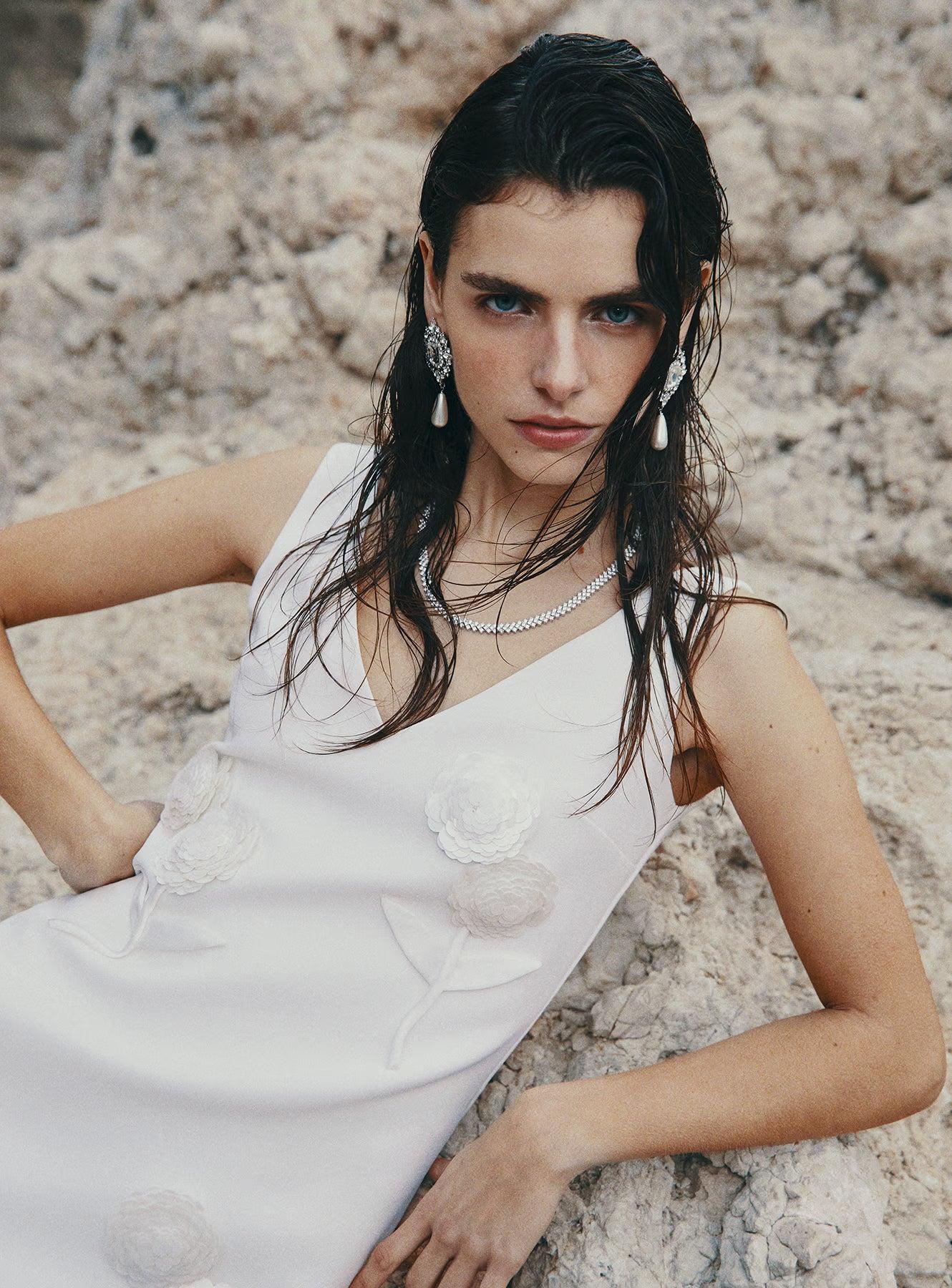 Cut to perfection, this white crepe mini dress channels minimalist sophistication with its shift silhouette. Sculptural sequin floral paillettes add romantic flair — perfect for saying ‘I do’.Fitted styleThis style has minimal stretchConcealed zip closure at backShift silhouetteFloral motifsModel is 5ft10/178cm and wears a size UK 6