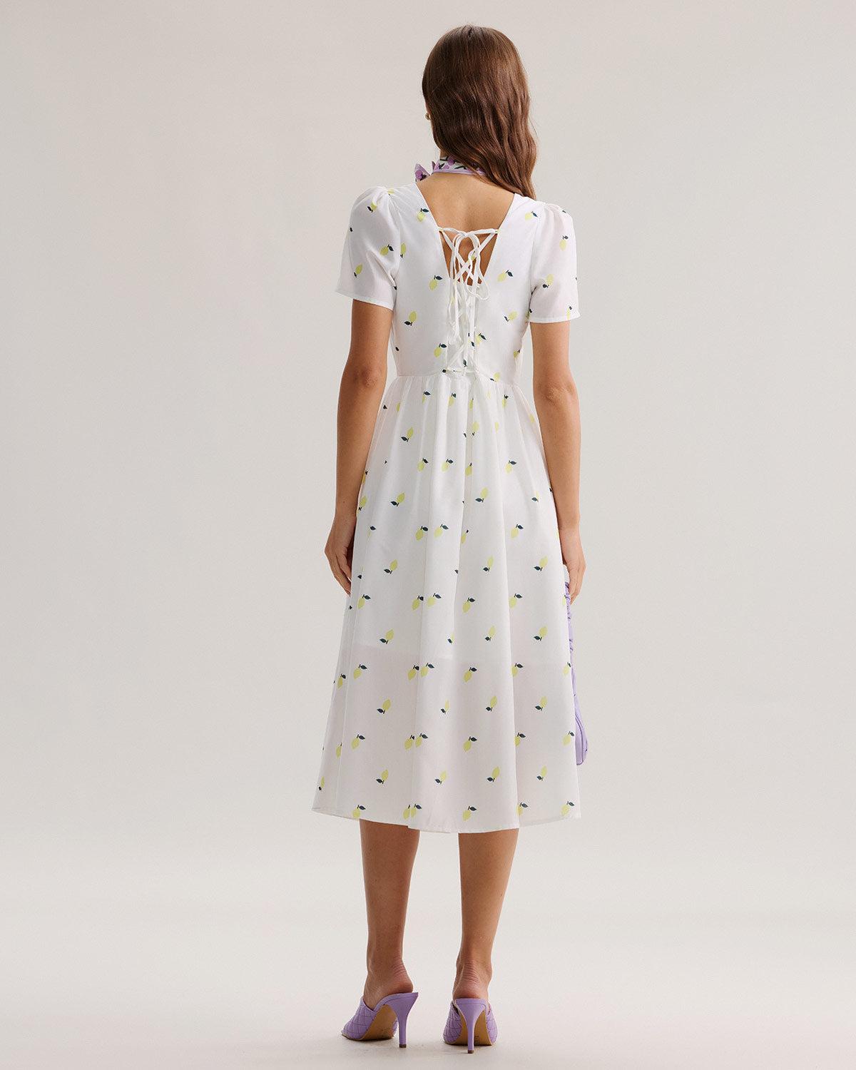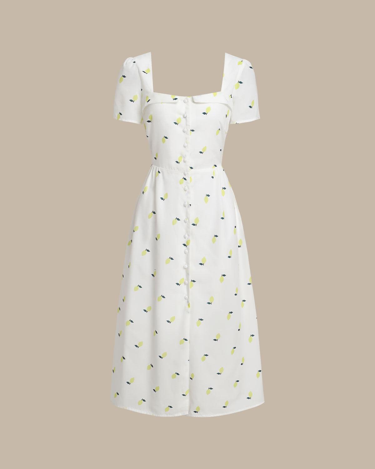 Fabric:This Square Neck Midi Dress is made of Polyester. Polyester is an artificial fiber that feels soft, looks lustrous, and dries fast. It's also durable, with good resistance to wrinkles, stains, and sunlight. Description:Featuring a flattering square neckline, delicate puff sleeves, and a fitted bodice that flows into a graceful midi-length skirt, this dress is adorned with a whimsical fruit print that adds a fresh, seasonal touch. Perfect for picnics, garden parties, or casual strolls, its breathable fabric ensures all-day comfort and effortless style. Details:- Occasion: Daily- Style: Elegant- Fabric Stretch: No Stretch- Waist: High Waisted- Sleeve Type: Puffed Sleeve- Pattern Type: Fruit- Embellishment: Ruched, Tie, Button, Splicing- Neckline: Square Neck- Silhouette: A-Line- Fabric: Polyester- Lining: Polyester