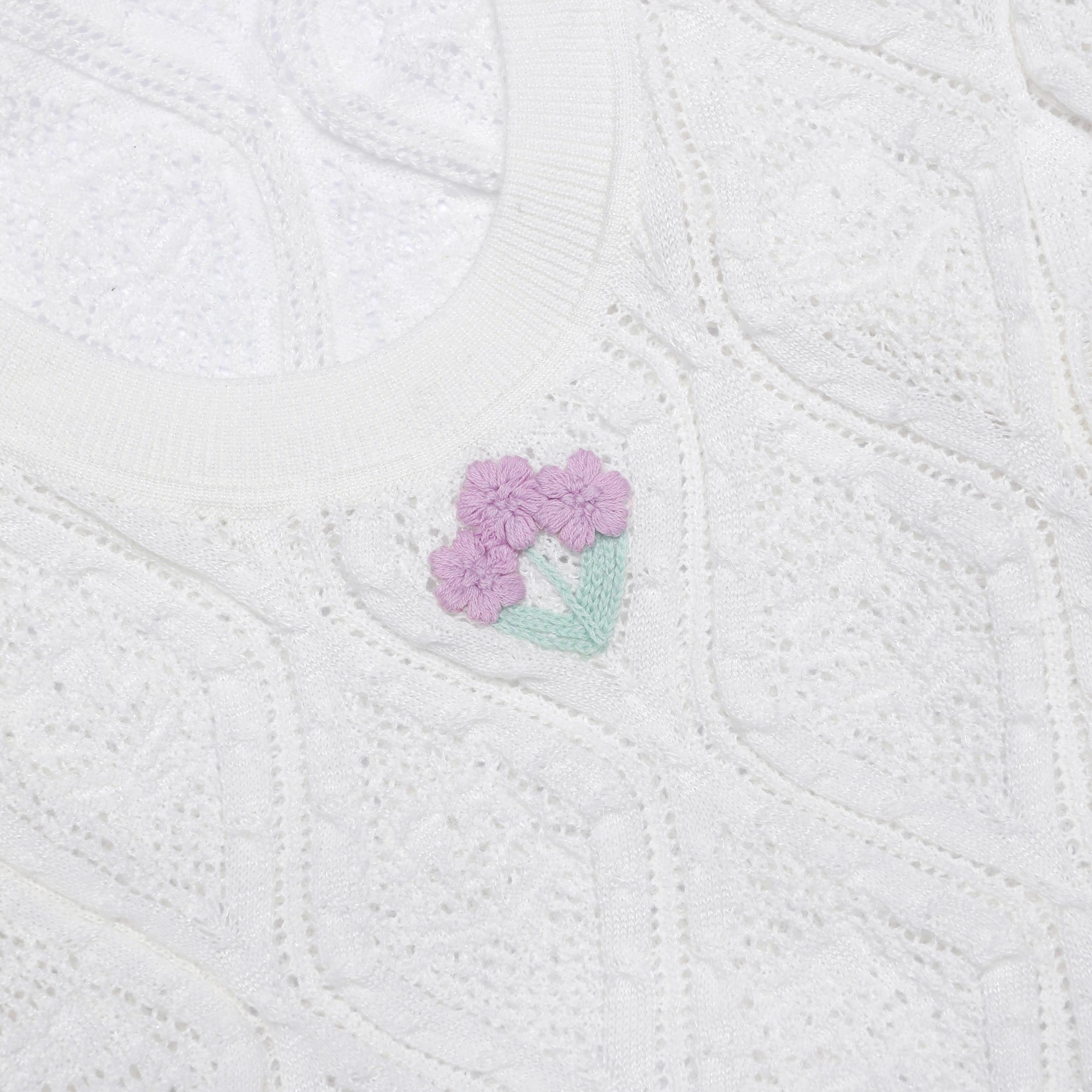 Channel playful sensuality in this white knit mini dress, framed by chic contrast trims. Crafty embroidered floral motifs and a cursive logo add romantic accents – wear with flats and heels alike. True to sizeFabric has stretch Embroidery detailingContrast trimsScalloped hemModel is 5ft10/178cm and wears a size S