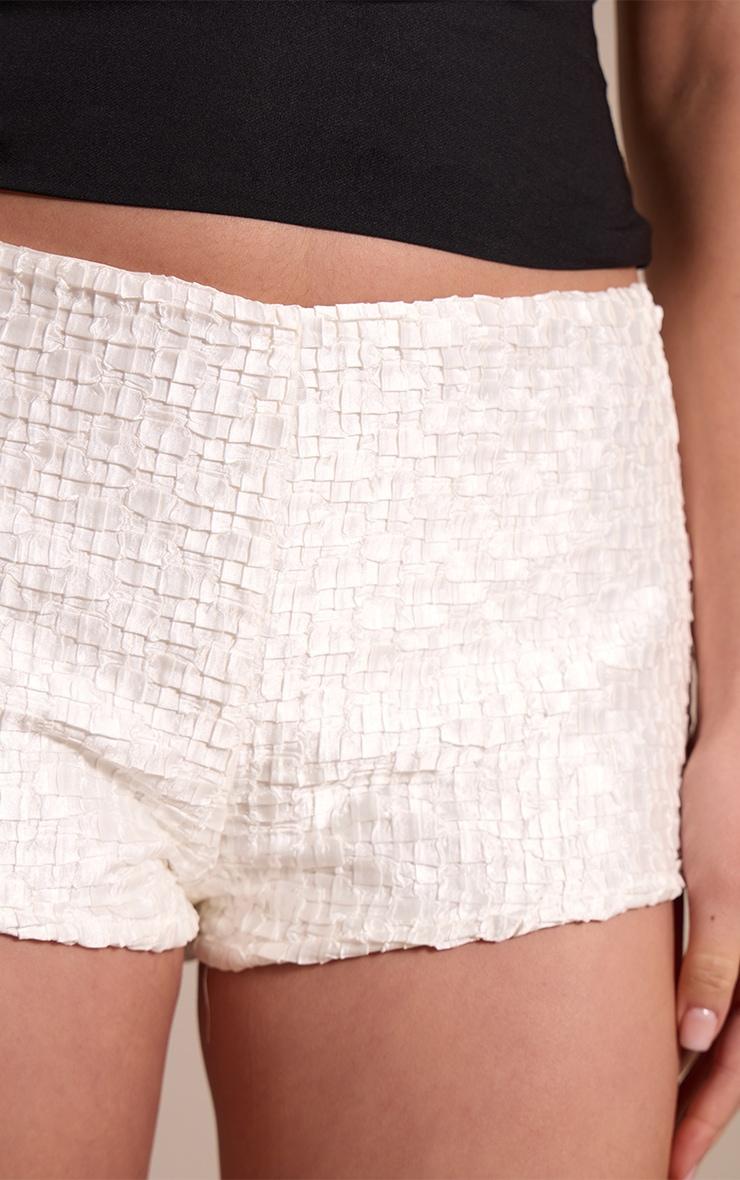 Step into the night with assured presence. The white textured satin hot pants unveil a streamlined, mini-length silhouette with a confident high-waisted cut, their distinctive textured finish catching the light for after-dark impact. Pair these essential bottoms with a sleek bustier top or a crisp tailored shirt for an assured ensemble. Elevate the look with sharp black heels for an intentional stride and finish with a simple gold ring to complete your polished aesthetic. This is how you curate a self-aware statement that truly owns the moment.Length approx 33cm/13inch (Based on sample size US 4)Model wears size UK 8/ EU 36/ AUS 8/ US 4Model Height - 5ft 10inchp]:!mb-4inch>Brand: PrettyLittleThingCategory: BottomsProduct type: Hot PantColor: WhiteMaterial: SatinOccasion: Evening