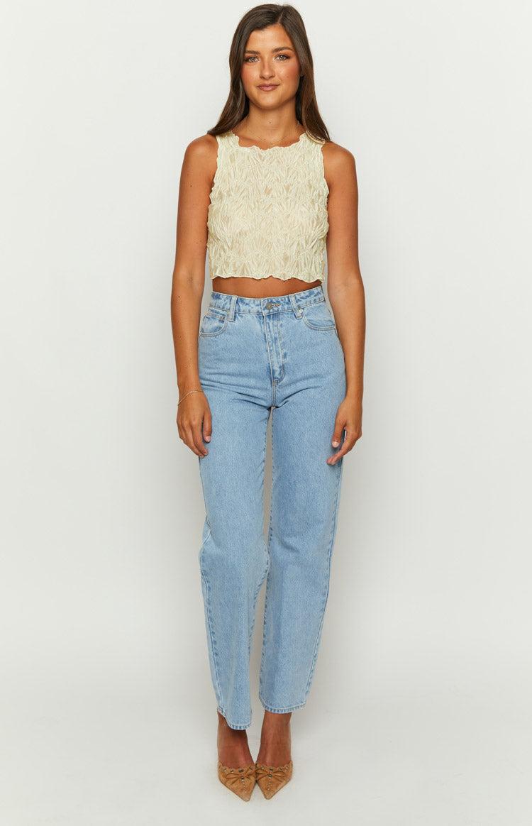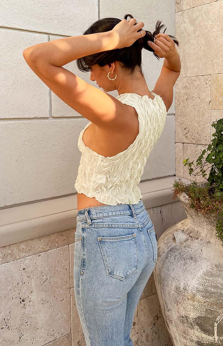 Cream Crop Top HOW TO STYLE: The crop top you didn't know you needed until now! The perfect go to staple that will spice up your next outfit. Pair with denim jeans and cream heels and your set! FEATURES: Crinkle textured fabric Lots of stretch Light weight Unlined Sheer material High neckline Cropped length Thick straps
