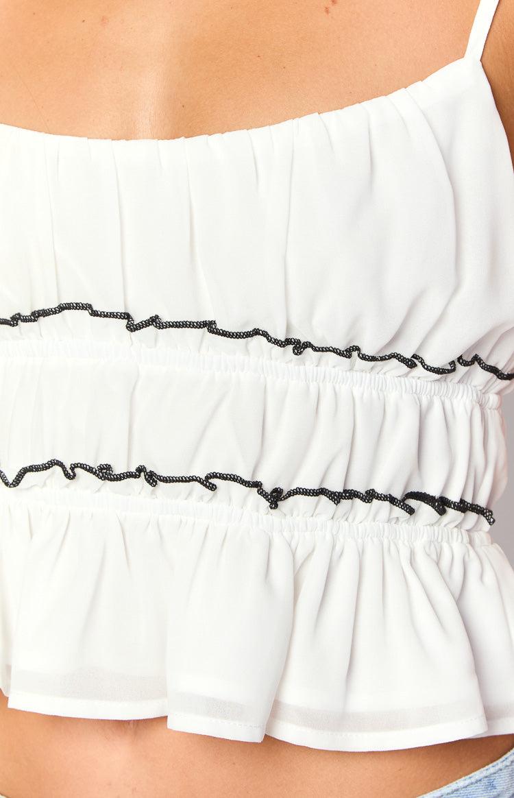 White Crop TopHow to style:Our Wiatt White Top is a timeless staple, perfect for everyday wear or a relaxed brunch with friends! The contrast detailing, lightweight chiffon material, and flattering gathered bodice make this top a must-have. Pair it with a denim skirt and strappy leather sandals for an effortlessly cool look!Features: Lightweight material Chiffon outer Fully lined Pull-on style Gathered bodice Elasticised bands at waist Adjustable straps Black contrast details Cropped length Perfect for casual outfits and summer days!