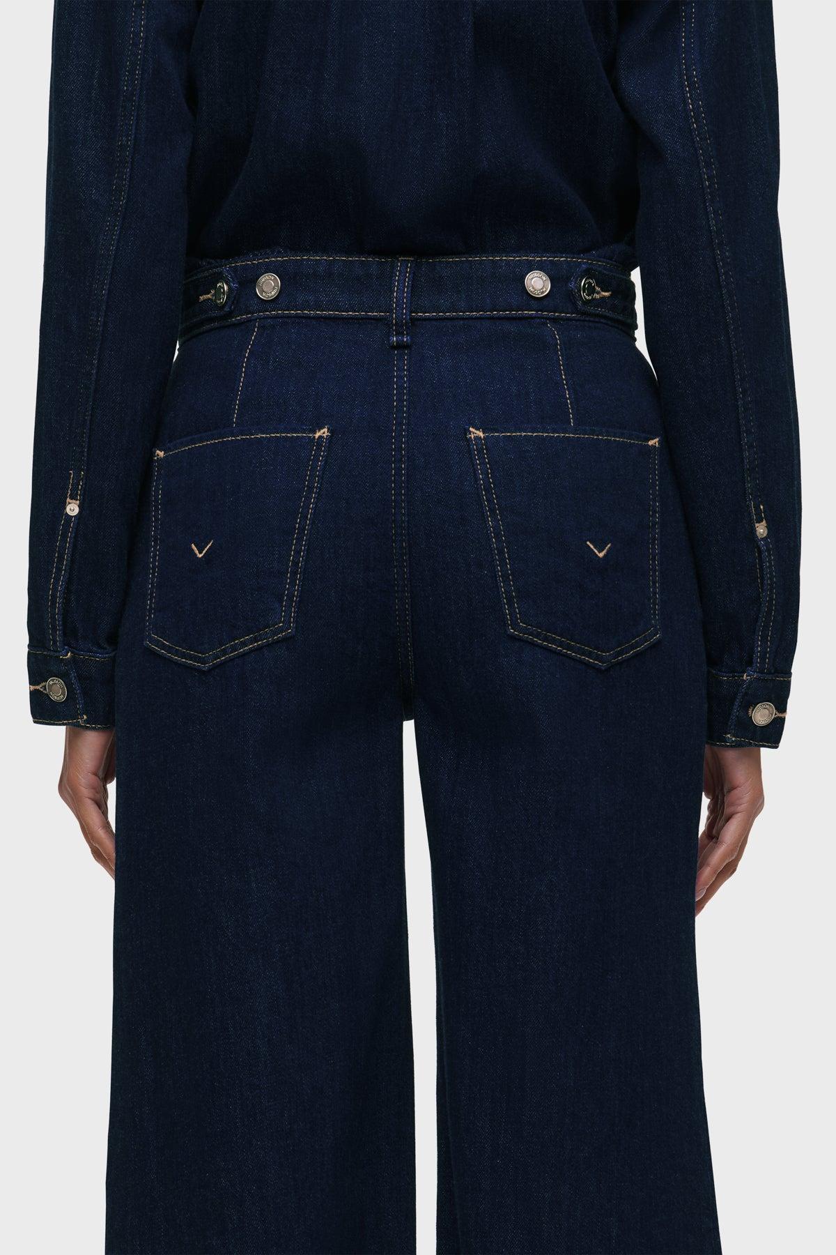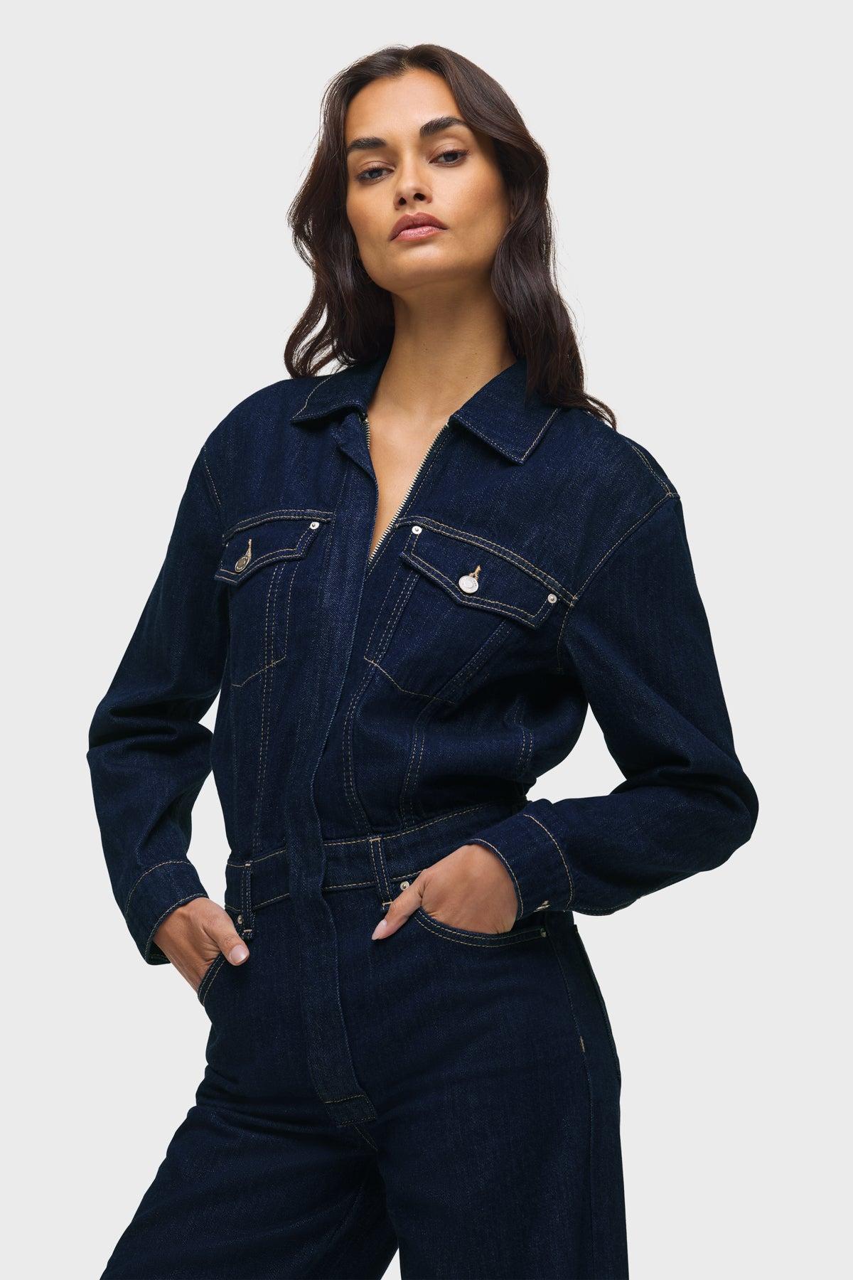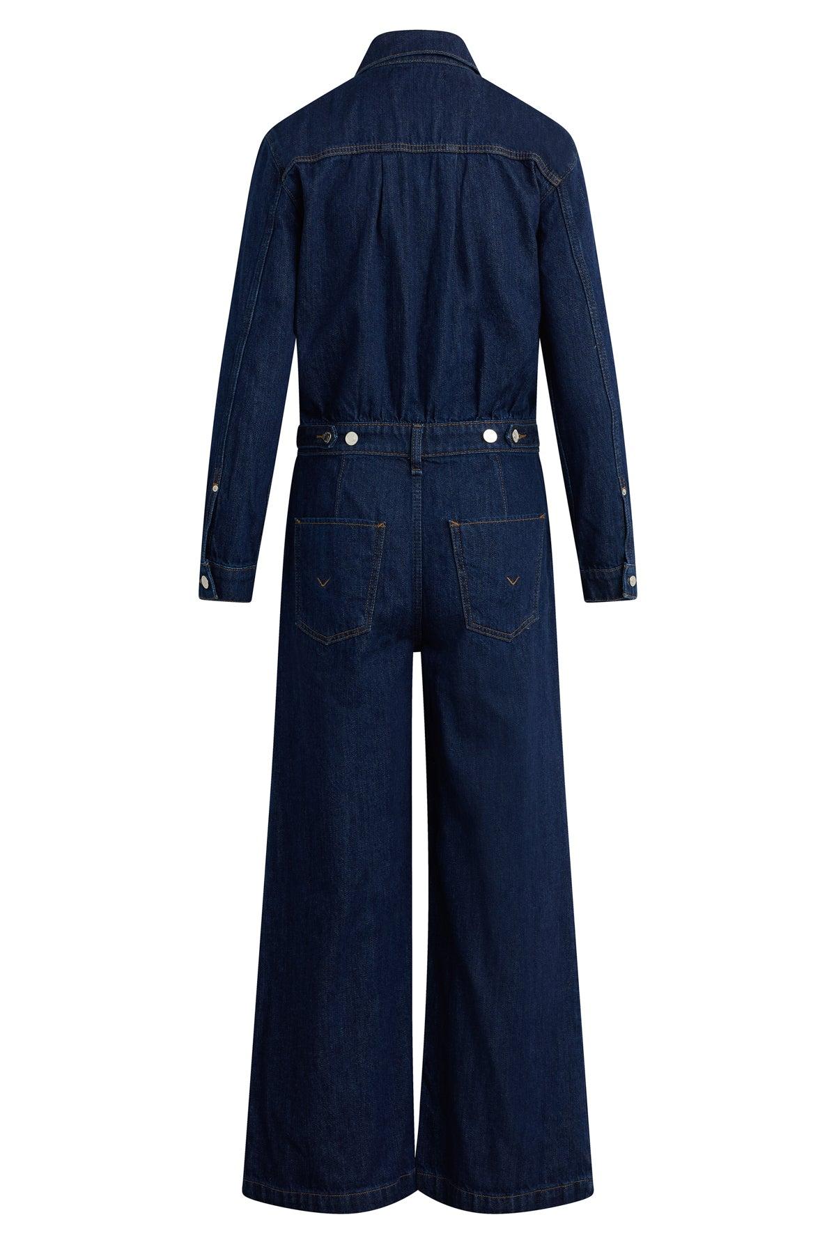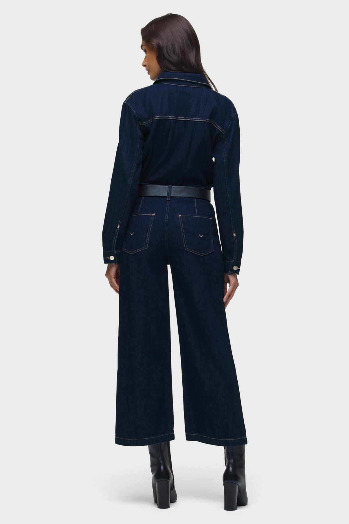 Description Our statement denim piece, the Wide Leg Crop Jumpsuit in Evening Day features a cropped fit on dark rinse, rigid Italian denim. This jumpsuit is finished with a hidden zipper at the front, adjustable button tabs at the back waistband, and a clean finished hem. Product Details Front Rise: 12.5", Leg Opening: 23", Inseam: 26", Chest: 40", Sleeve Length: 23" Fit & Care Content: 100% Cotton Machine wash cold gentle cycle Only non-chlorine bleach when needed Tumble dry low Medium iron if needed