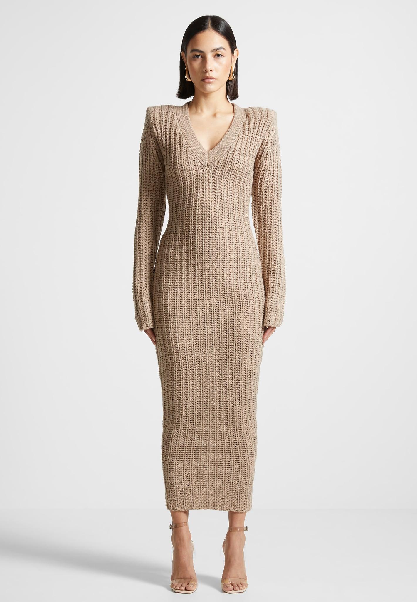 Wide Shoulder Knitted Midaxi Dress - Taupe Female Product Image
