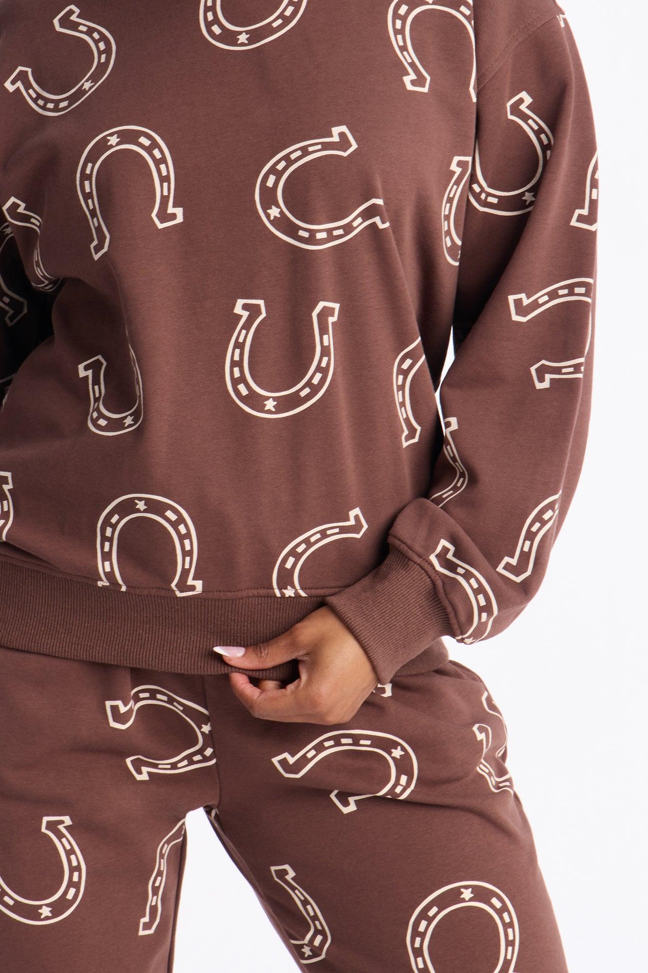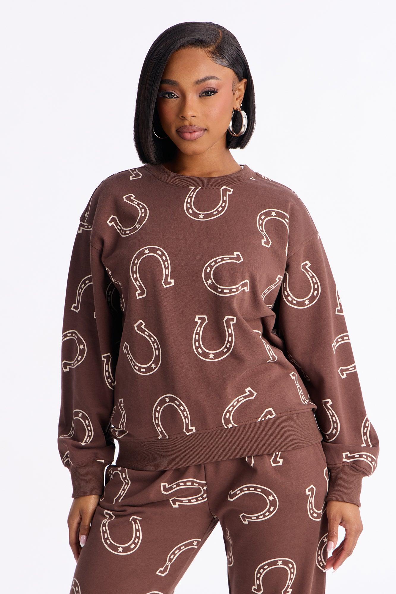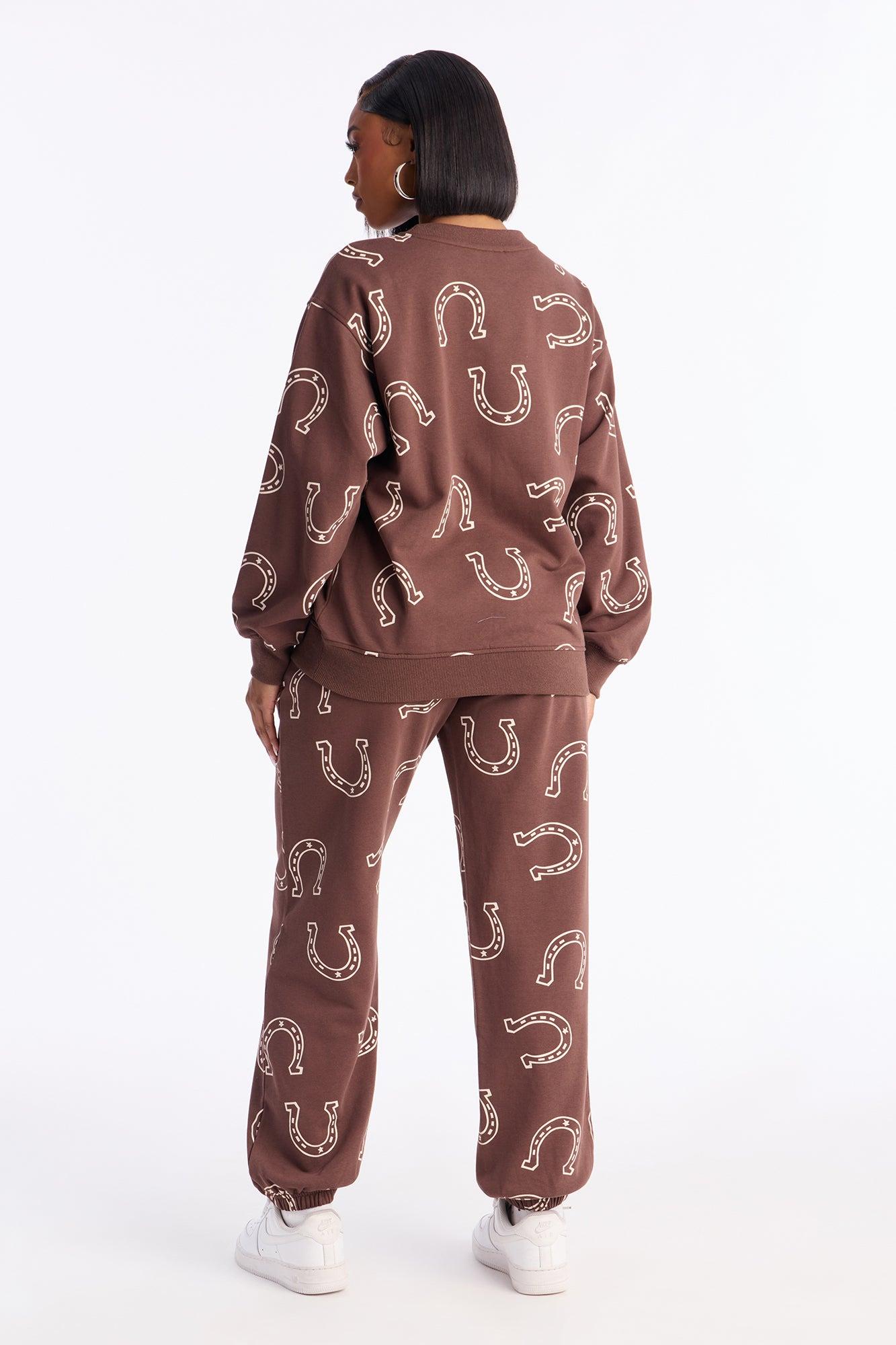 Available In Brown. 2 Piece Ensemble Crewneck And Jogger Pant Set Stretch 29.5" Inseam Elastic Drawstring Waistband Pockets Disclaimer: Due To The Printing Process A Difference In Saturation May Occur. Each Garment Is Unique. Self : 83% Cotton 17% Polyester Contrast : 98% Cotton 2% Spandex Imported California Proposition 65WARNING: Cancer and Reproductive Harm - www.P65Warnings.ca.gov.
