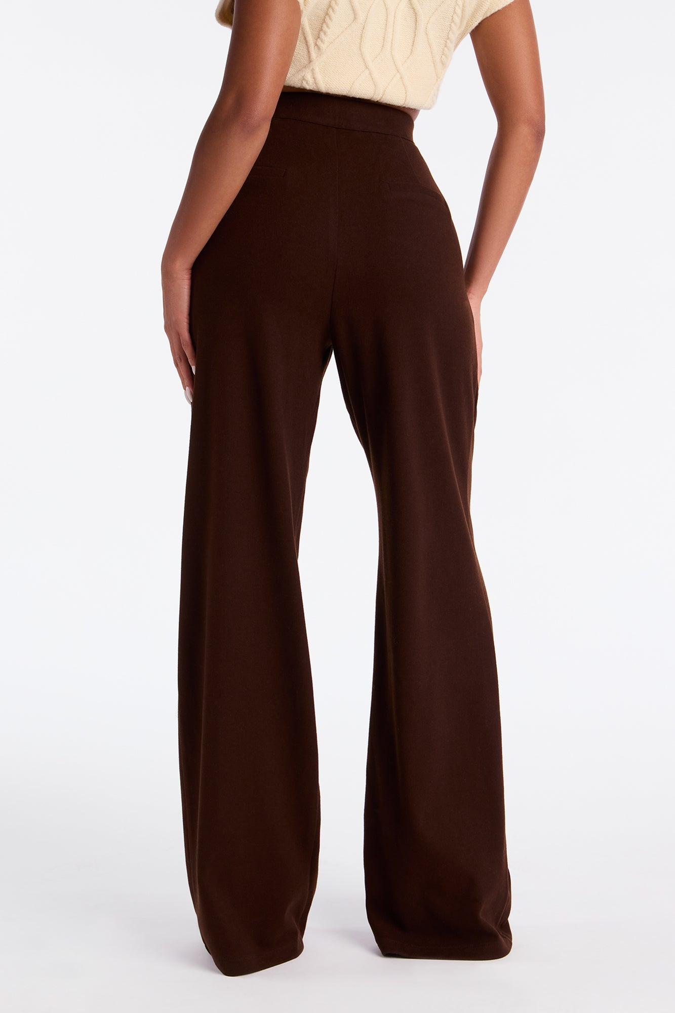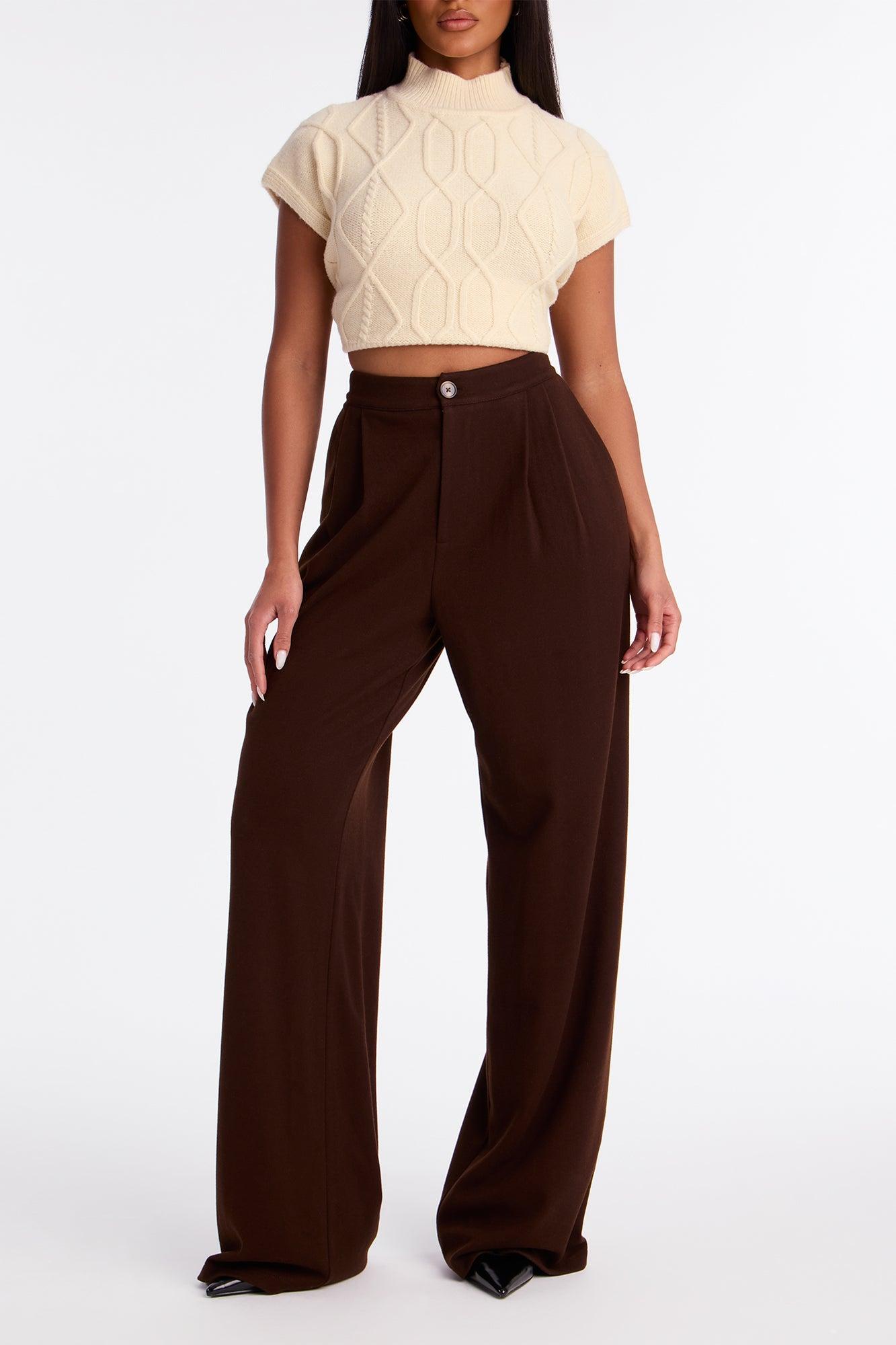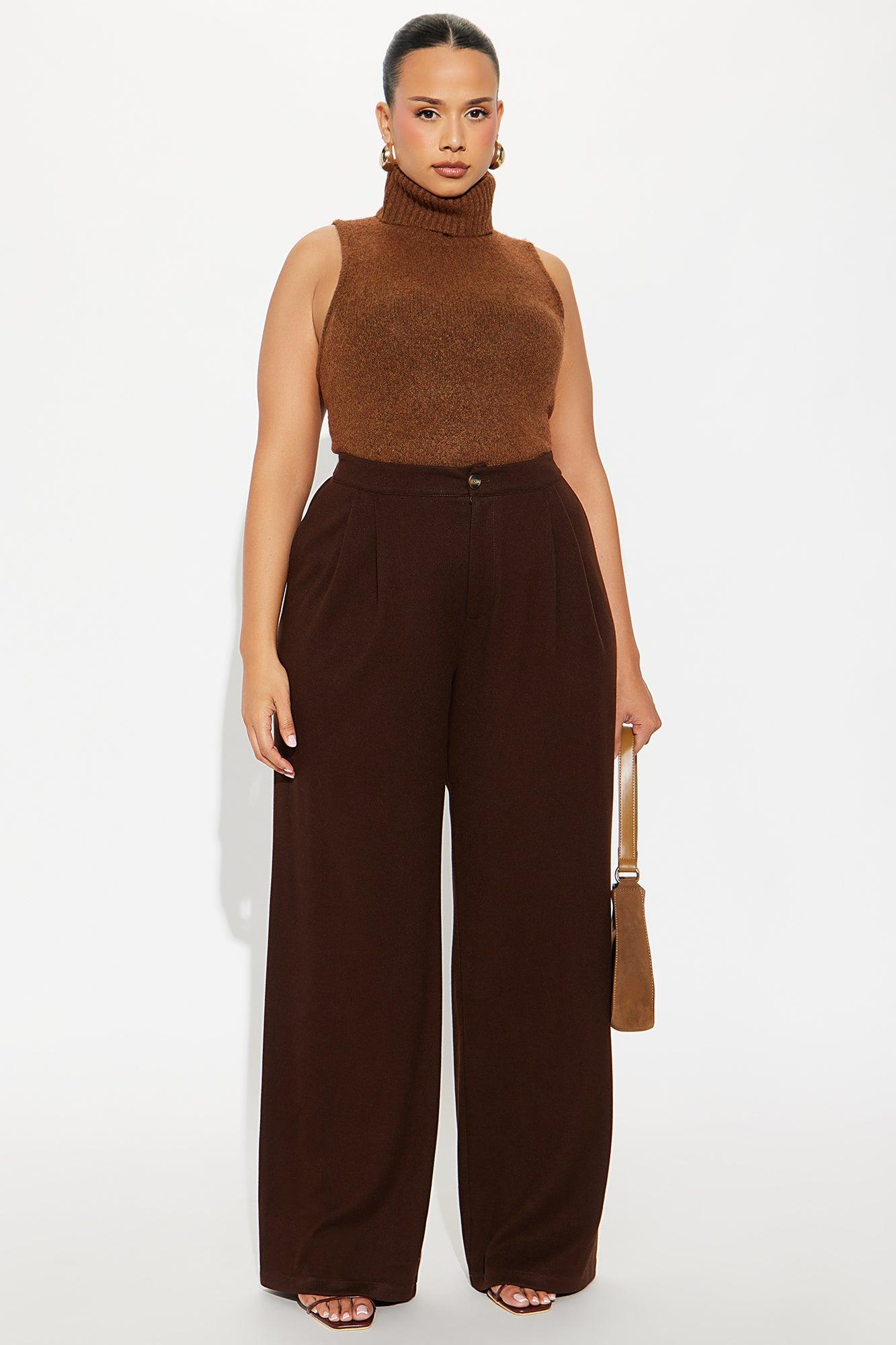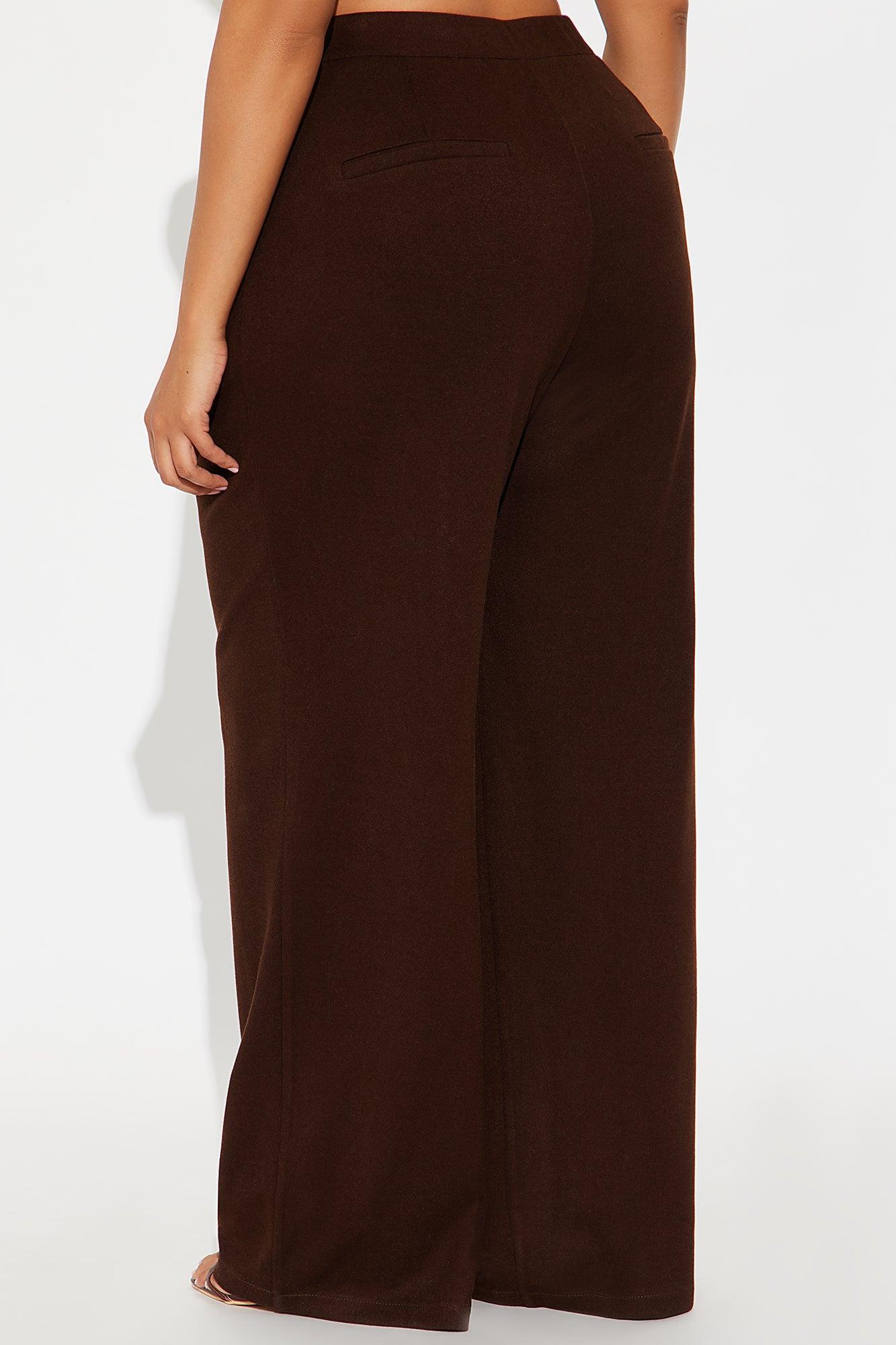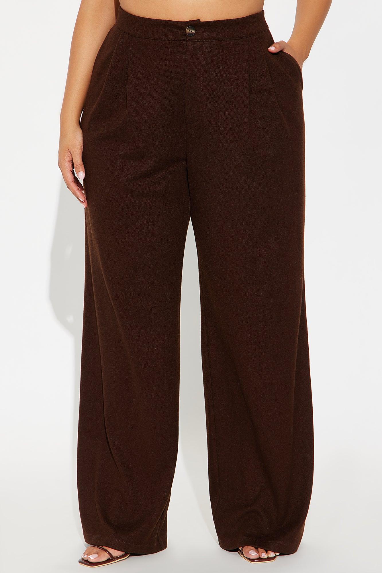 Available In Charcoal And Chocolate. Trouser Pants Button And Zipper Closure Pleated Detail 33" Inseam Wide Leg Faux Back Pockets Self : 54% Polyester 31% Rayon 12% Nylon 3% Spandex Imported California Proposition 65WARNING: Cancer and Reproductive Harm - www.P65Warnings.ca.gov.