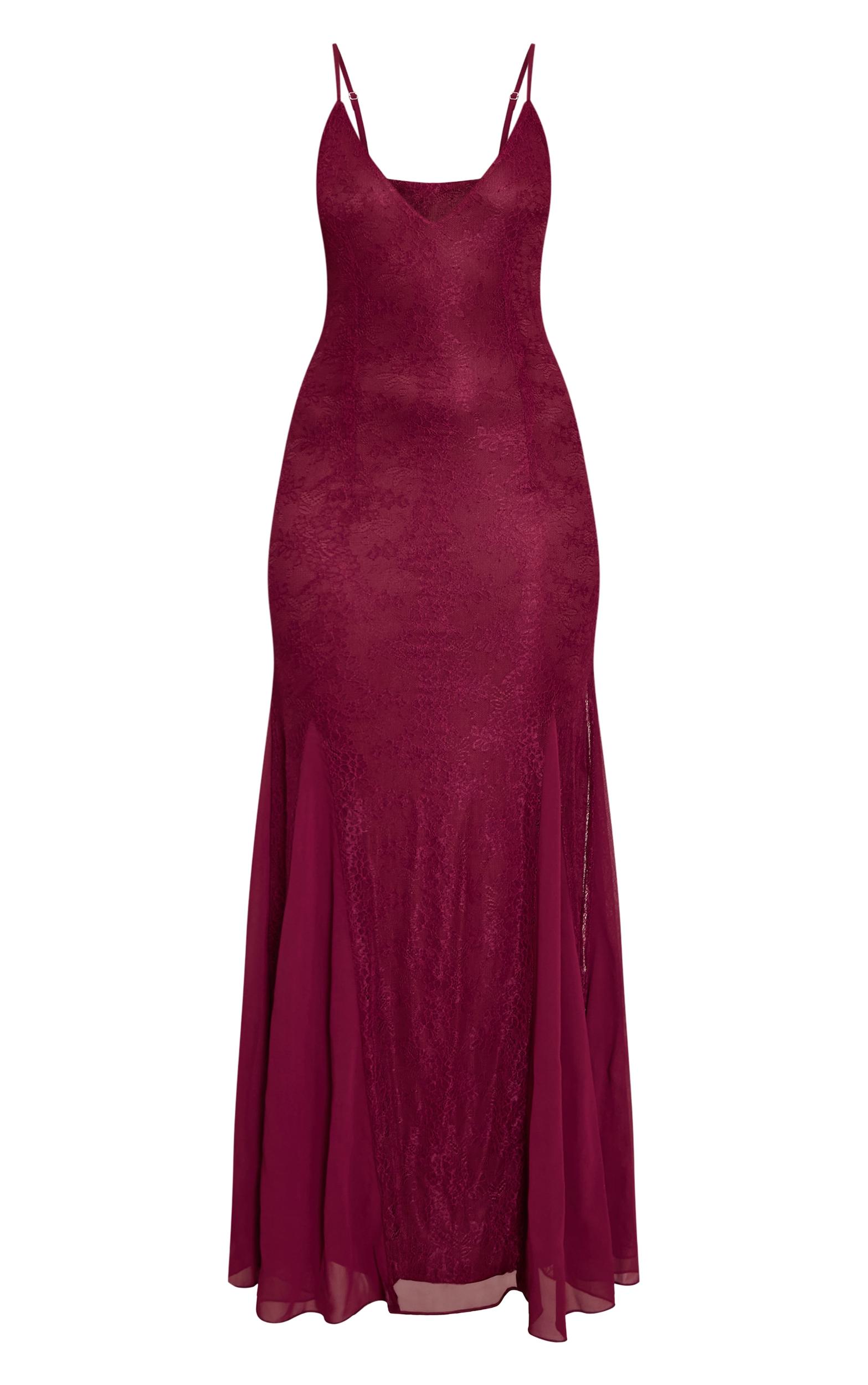 Commanding attention comes effortlessly in a design meticulously crafted for refined evenings. The wine lace godet detail maxi dress defines sophistication with its delicate lace overlay and a deep V-neckline, beautifully framed by slender spaghetti straps. Its bodycon silhouette accentuates the form, flowing gracefully into a dramatic maxi length, enhanced by artful godet inserts that add movement and dimension. Elevate this captivating look with sleek black heeled mules and understated gold earrings, ensuring a confident, cohesive aesthetic. Command any room with an effortless, artful presence that is uniquely yours.Length approx 155cm/61inch (Based on sample size US 4)Model wears size UK 8/ EU 36/ AUS 8/ US 4Model Height - 5ft 9inchp]:!mb-4inch>Brand: PrettyLittleThingCategory: DressesProduct type: Bodycon DressColor: WineMaterial: Stretch LaceOccasion: Occasion