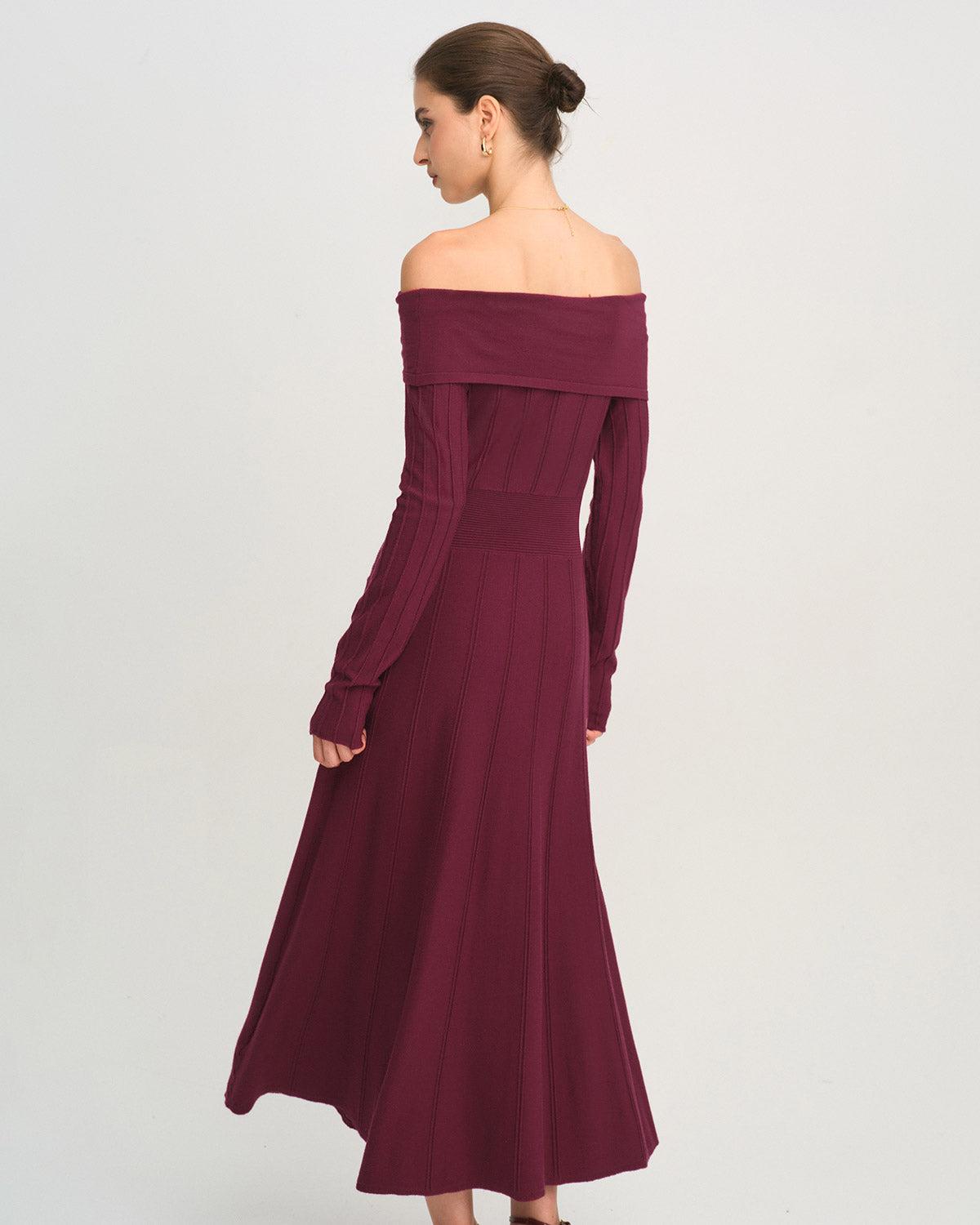 - Occasion: Daily - Style: Elegant - Back Neckline: Strapless - Fabric Stretch: Medium Stretch - Waist: Natural Waisted - Sleeve Length: Long Sleeves - Pattern Type: Solid - Embellishment: Ribbed - Neckline: Off The Shoulder - Dresses Length: Midi - Silhouette: A-Line - Fabric: Viscose 49.3%, Polyamide 27.7%, Polyester 23.0% - Material: Knit