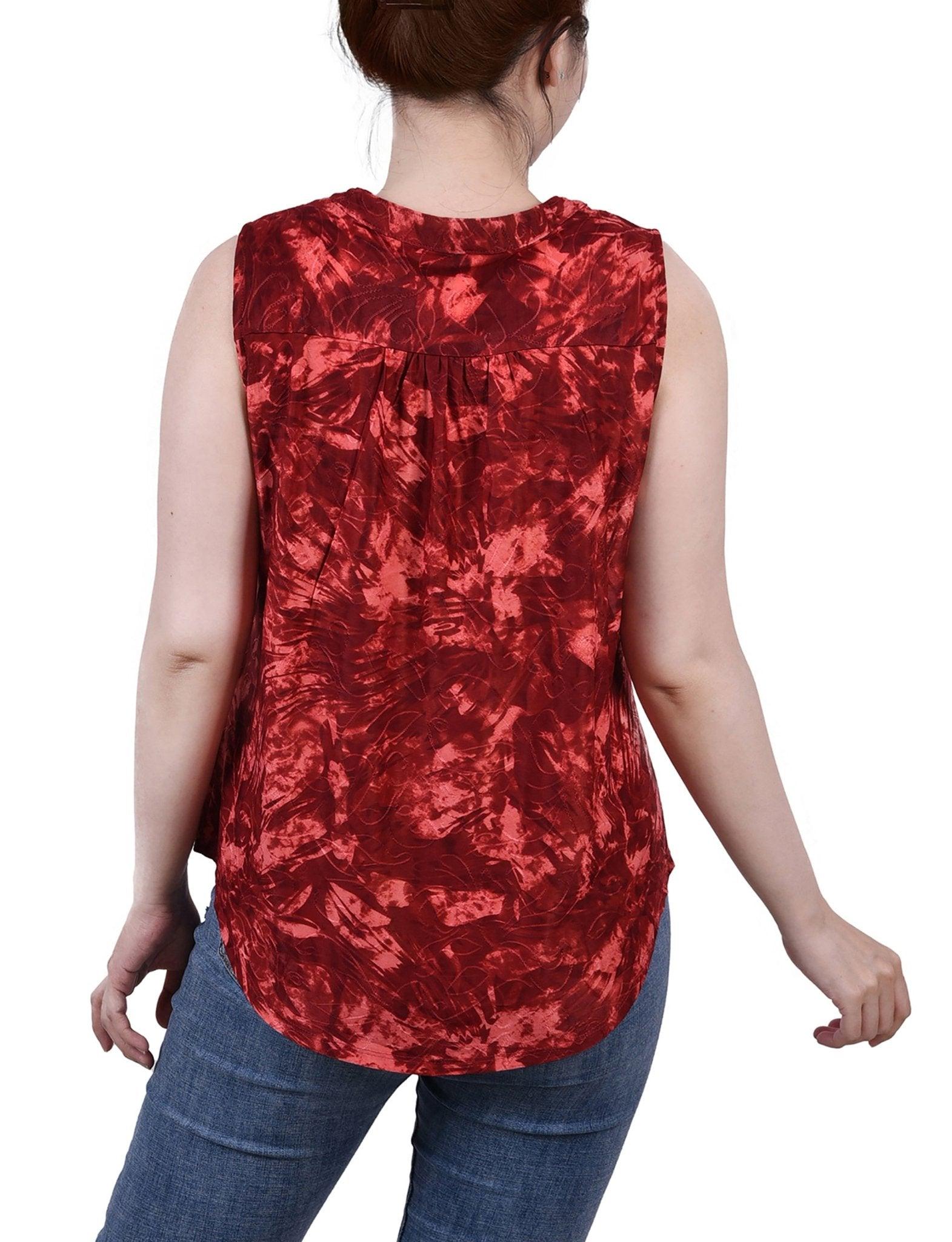 Wine Tie Dye Sleeveless Jacquard Y Neck Top - Petite