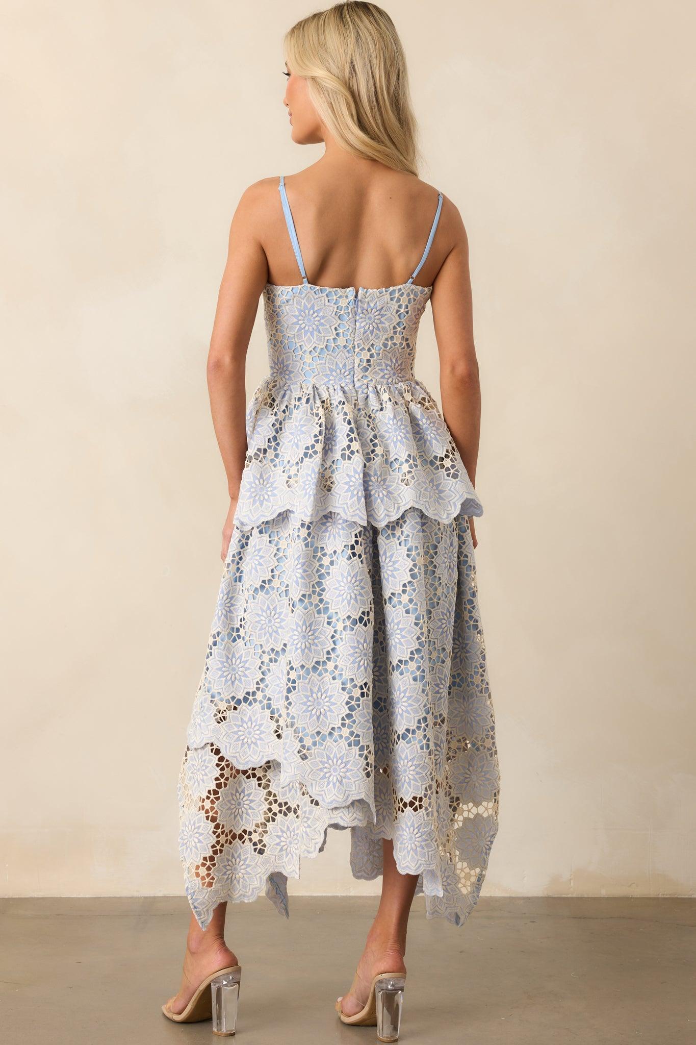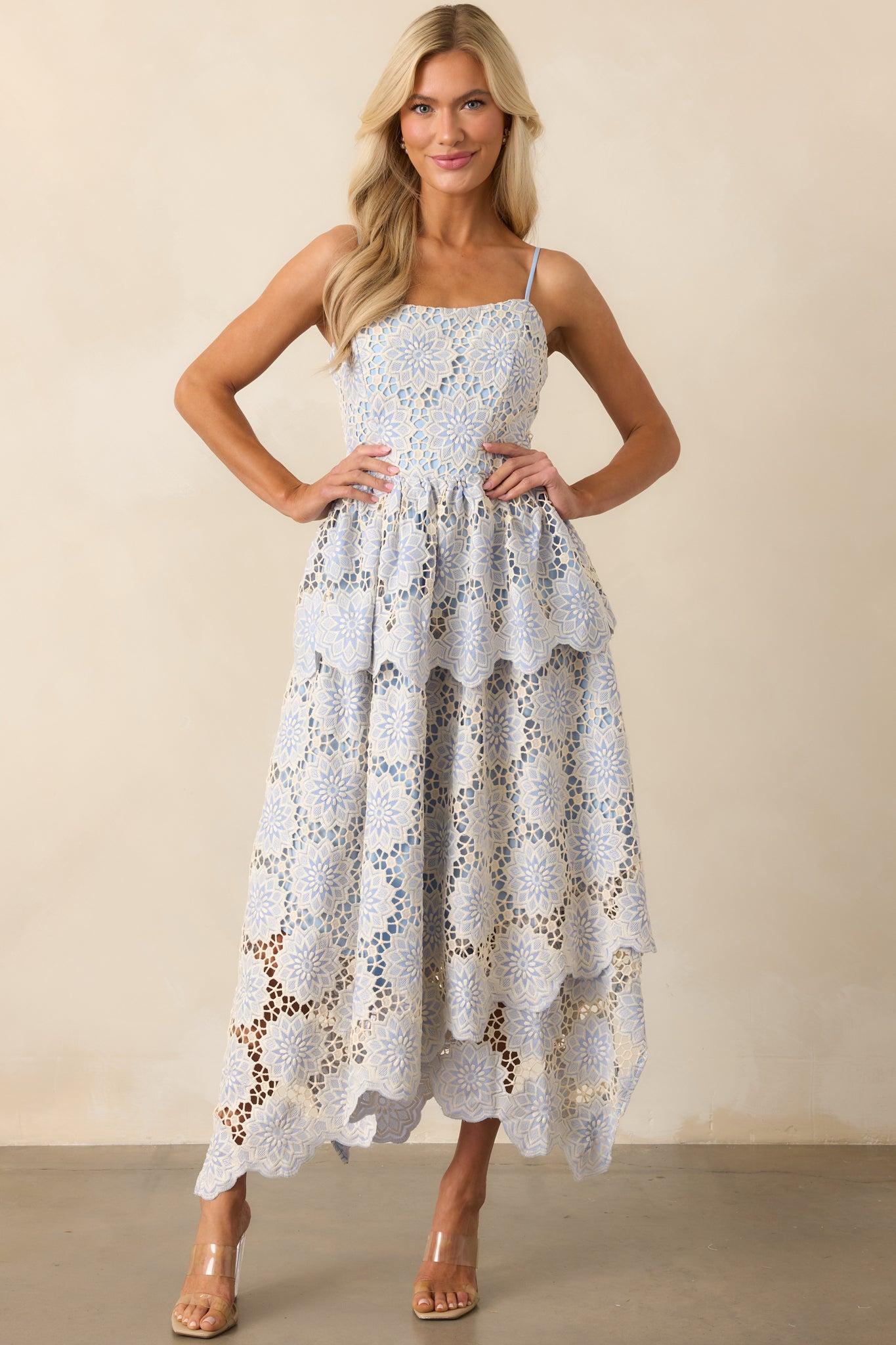 The Within Myself Sky Blue Embroidered Eyelet Asymmetric Maxi Dress exudes a sense of quiet confidence and grace. Its thoughtful design makes it a standout choice for occasions that call for a look both unique and effortlessly sophisticated. This sky blue dress features a slightly rounded square neckline, adjustable spaghetti straps, ivory geometric embroidered eyelet detailing throughout, a tiered skirt, and an asymmetrical layered bottom hem. 100% Polyester Lined: 95% Polyester & 5% Spandex Hand Wash Cold Manufactured in China Designed in The USA Model is 5'6" and Wearing a Size X-Small