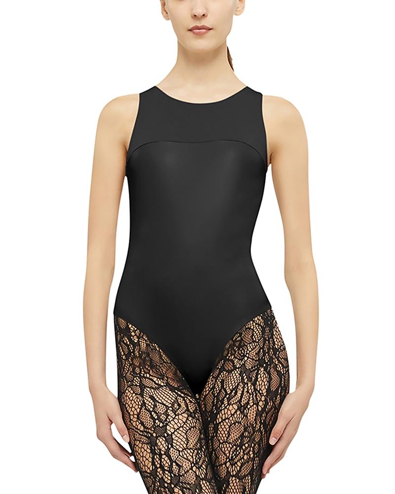From the Eco Vegan Collection. This Wolford bodysuit, constructed in a sleeveless silhouette, features a soft knit chest panel and vegan leatherette bodice. Round neck Sleeveless Back-zip closure Snap gusset 69% viscose/25% polyamide/6% elastane Machine wash Imported SIZE & FIT Model measurements: 510 tall Model is wearing a US size 4. Lingerie - Wolford Hosiery > Wolford > Saks Fifth Avenue > Barneys. Wolford. Color: Black. Size: 12.
