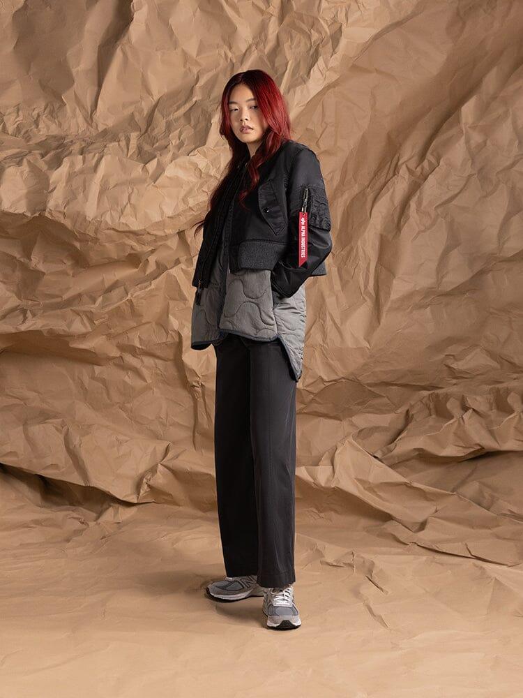 Cropped outer jacket: two exterior flap pockets, MA-1 utility pocket, webbing patch on wearer's left chest, knit cuff, collar, and waistband
