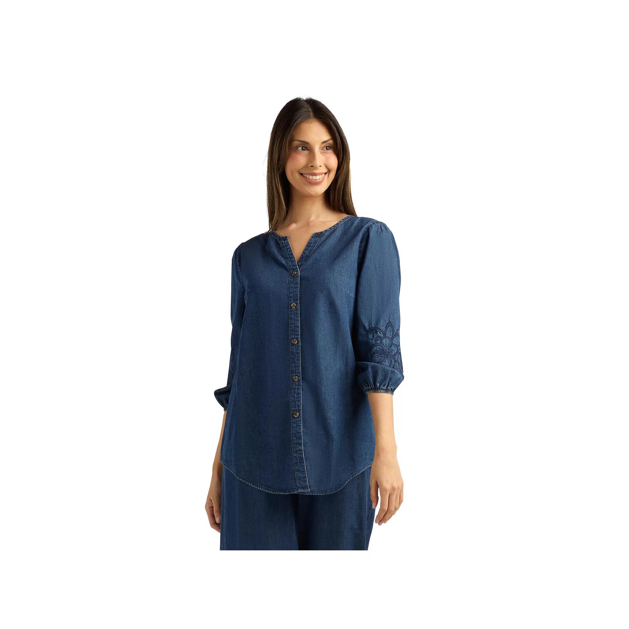 Elevate your casual style with this chic top that combines a flattering embroidered design with trendy three-quarter blouson sleeves. AB Studio brings you a piece that effortlessly transitions from brunch with friends to a relaxed day at home, making every moment a little more stylish and a lot more fun. Click on this WOMEN'S GUIDE to find the perfect fit and more! - https://www.kohls.com/feature/womens-fit-guide.jsp. FEATURES: Woven construction, Embroidered detail on the sleeves. FIT & SIZE: Classic fit, 25-in. length from shoulder to hem, Curved hem. MATERIAL & CARE: Cotton, Machine wash. DETAILS: Button front closure, Split V-neckline, Three-quarter blouson sleeves, Imported. Size: Xxl. Color: Denim. Gender: female. Age Group: adult. Material: OTHER MATERIAL.