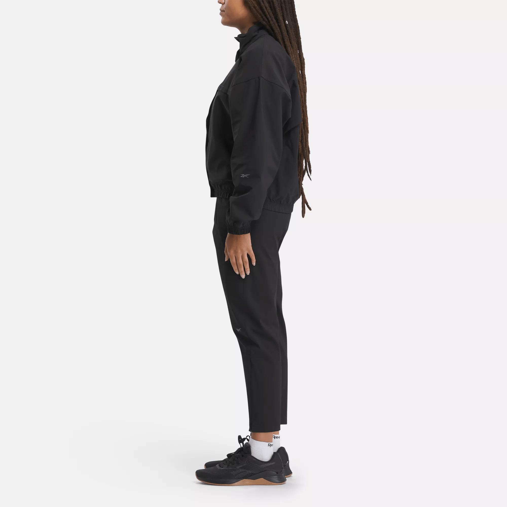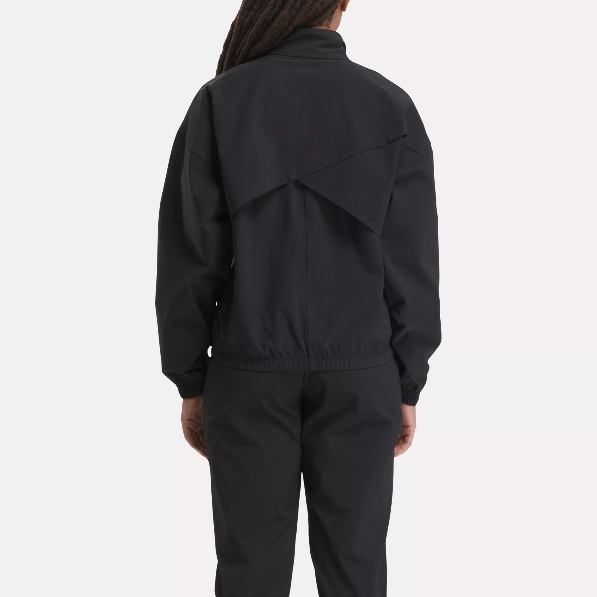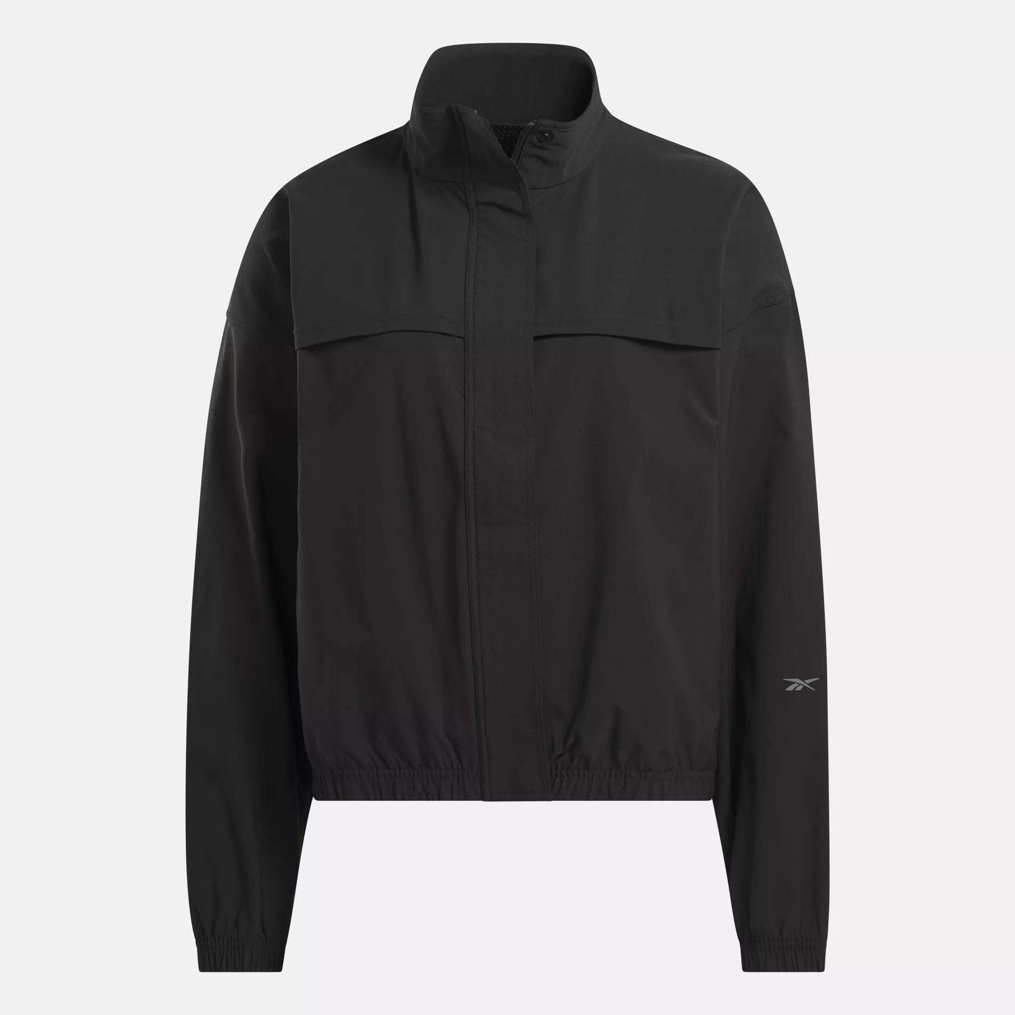 An elevated woven jacket with a relaxed fitLayer this women's Reebok jacket over your workout clothes and head to the gym in sleek, modern style. Made from SkyStretch woven fabric, the jacket has a relaxed fit and clean lines. A mesh back panel keeps the air flowing for comfort when the day heats up.