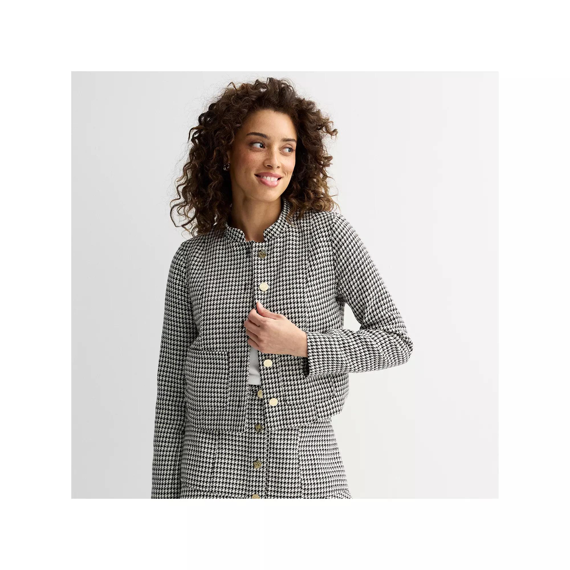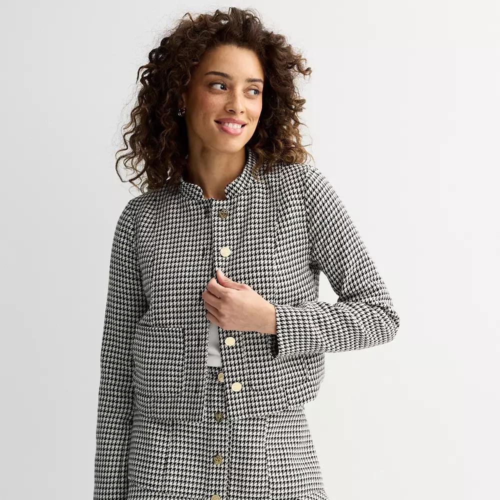 The Women's Draper James Houndstooth Jacket is a timeless layering piece, offering a tailored silhouette and classic pattern for polished style.Click on this WOMEN'S GUIDE to find the perfect fit and more!FEATURES 5 front pockets Lurex Houndstooth Tweed 2 front pockets Button front Long sleeves Fully linedFIT & SIZING Classic jacket 21-in. length from shoulder to hemFABRIC & CARE 97% Polyester, 3% Lurex Lining: 100% Cotton Machine wash and tumble dry low Imported Size: X Large. Color: White Black. Gender: female. Age Group: adult.