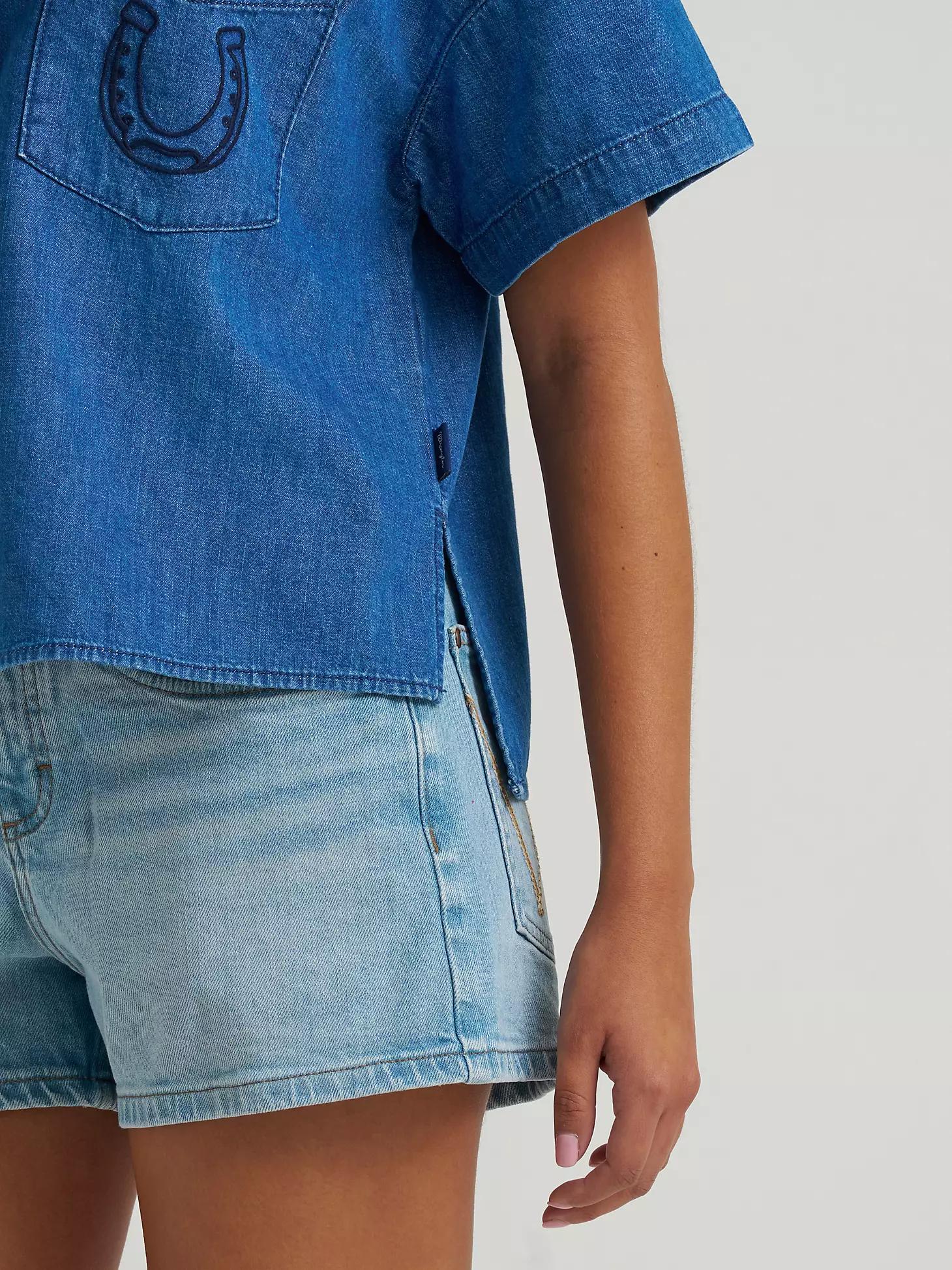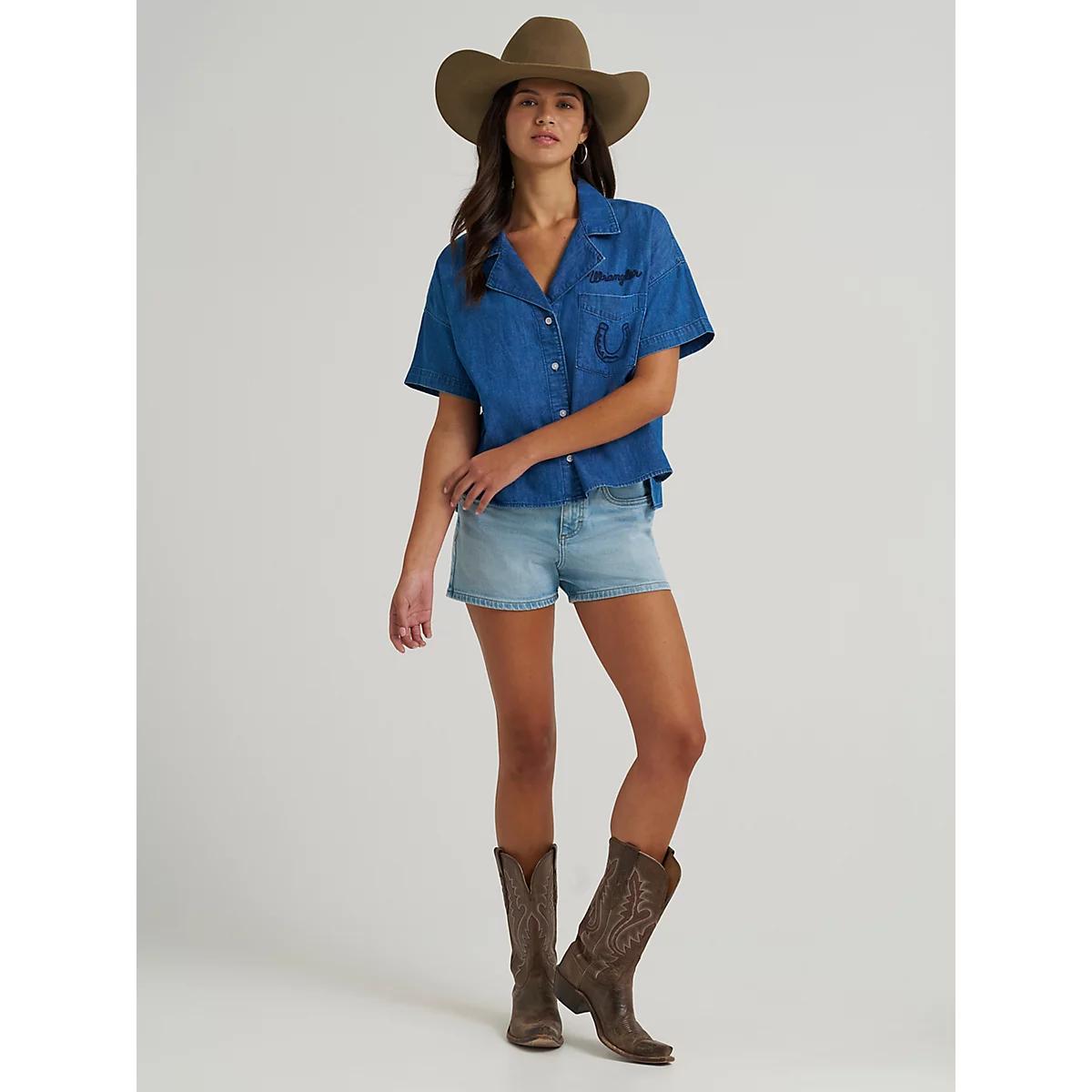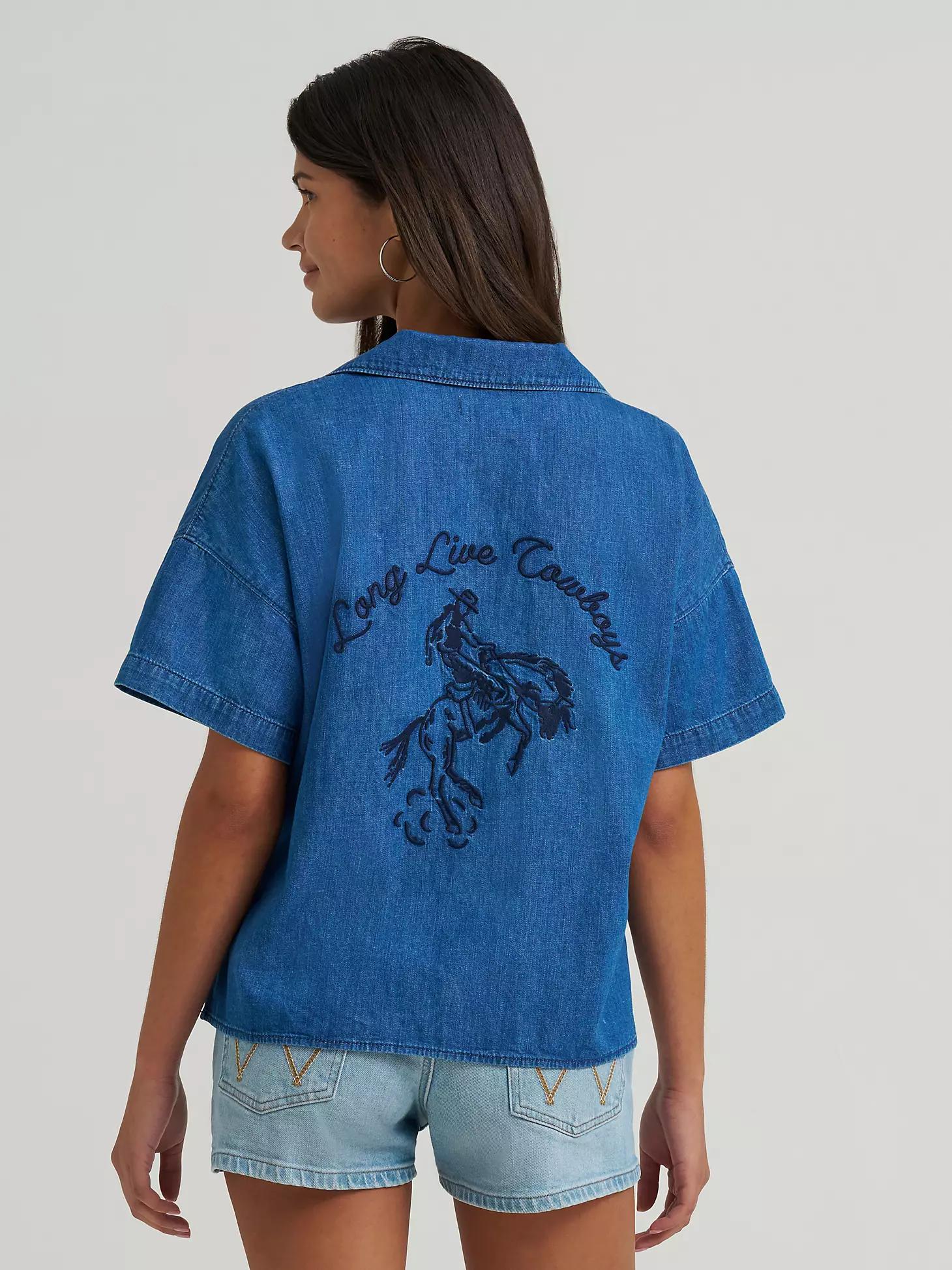 Add a little good luck to every outfit with our Women’s Embroidered Denim Camp Shirt. Blending relaxed, everyday comfort with subtle Western charm, this short-sleeve shirt features delicately stitched horseshoe embroidery across the left chest pocket and a stitched version of the Wrangler® logo just above that for a touch of authenticity. Across the back, you get more embroidered artwork of a bronc rider in honor of the cowboys we love. Crafted from soft denim, this shirt drapes effortlessly and its camp-style silhouette keeps things classically laidback with a wink of Western spirit.