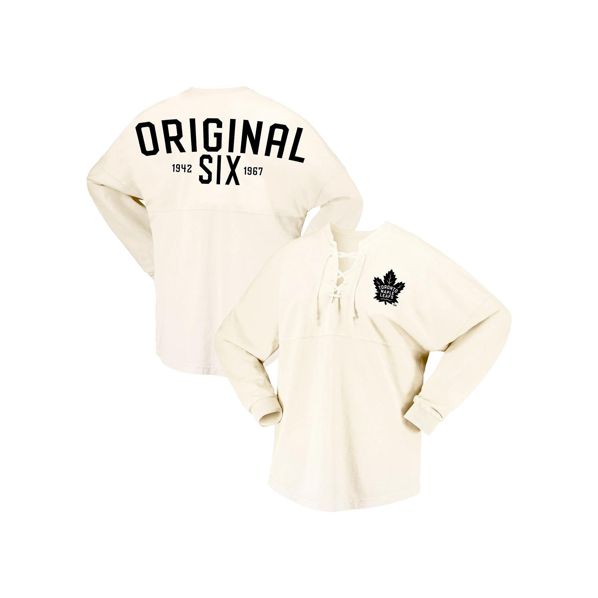 Make a fashion statement while paying tribute to one of NHLs pioneer franchises in this Toronto Maple Leafs Spirit Jersey T-shirt from Fanatics Branded. It features a sporty lace-up neckline, a monochrome Toronto Maple Leafs logo on the front and Original Six graphics displayed across the back. The longer, rounded hem provides a more comfortable fit and feel.Make a fashion statement while paying tribute to one of NHLs pioneer franchises in this Toronto Maple Leafs Spirit Jersey T-shirt from Fanatics Branded. It features a sporty lace-up neckline, a monochrome Toronto Maple Leafs logo on the front and Original Six graphics displayed across the back. The longer, rounded hem provides a more comfortable fit and feel.Officially licensedNotch neckDropped shouldersMachine wash with garment inside out, tumble dry lowImportedBrand: Fanatics BrandedLong sleeveLace-up necklineMaterial: 100% CottonLow-puff screen print graphicsRounded droptail hem Color: Beige Over. Gender: female. Age Group: adult.