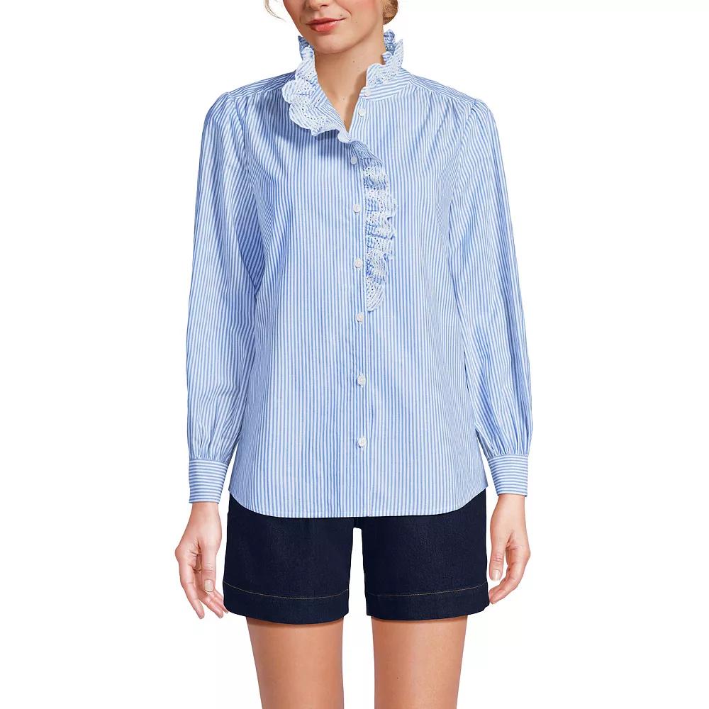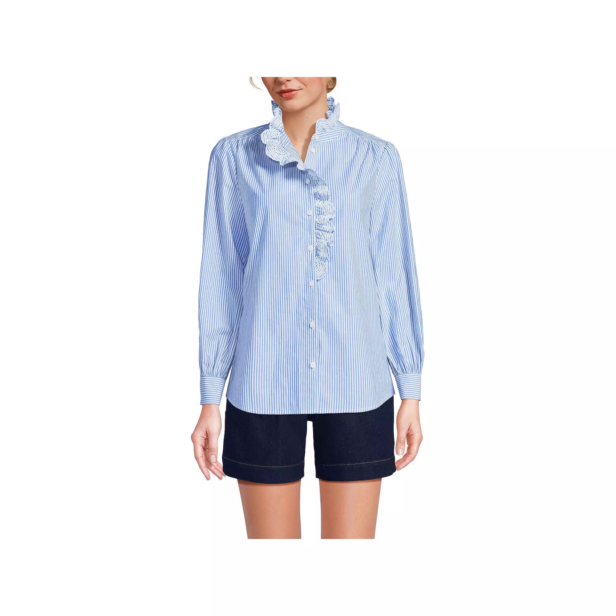 Elevate your wardrobe with this Lands' End shirt that perfectly balances playful ruffles with refined elegance. Its lightweight design and balloon sleeves make it a versatile staple for any occasion, whether you're dressing up for a brunch or keeping it casual with leggings. Click on this WOMEN'S GUIDE to find the perfect fit and more! - https://www.kohls.com/feature/womens-fit-guide.jsp. FEATURES: Jersey knit construction, Ruffled details at the collar and button placket, Lightweight, breathable poplin, Button down front, Button cuffs finish balloon sleeves, Tailored with a back yoke, Curved hem can be tucked or not. FIT & SIZE: Regular fit, 25-in. length from shoulder to hem. MATERIAL & CARE: 100% cotton, Machine wash. DETAILS: Long sleeves, Button cuffs, Imported. /* desktop styles */ #aboutTheBrandTabContent h2 { font: 1.25em 'Gotham 7r', Helvetica, Arial, sans-serif; color: #3e3935; padding-top: .75em; } #aboutTheBrandTabContent p { font: .88em/1.62 'Gotham 5r', Helvetica, Arial, sans-serif; } #aboutTheBrandTabContent a { font: .88em 'Gotham 5r', Helvetica, Arial, sans-serif; } /* mcom styles */ #acc-aboutTheBrand h2 { font: 1.25em 'Gotham 7r', Helvetica, Arial, sans-serif; color: #3e3935; padding-top: .75em; text-align: center; } #acc-aboutTheBrand p{ font: 1.06em/1.62 'Gotham 5r', Helvetica, Arial, sans-serif; width: auto; text-align: center; } #acc-aboutTheBrand a{ font: 1.1em 'Gotham 5r', Helvetica, Arial, sans-serif; width: auto; text-align: center; }. Lands' End makes “Sunday comfort” part of your every day. Here, comfy is found in softer, stronger fabrics made into versatile layers to work for you—wherever life takes you. Comfy is a just-right fit that makes you feel great with the way you look. Comfy exists at Lands' End for everyone, everywhere and with every wear. Shop the Lands' End Collection Now. - https://www.kohls.com/catalog/lands-end.jsp?CN=Brand:Lands%27%20End&icid=20220112-m-lands-end-about-the-brand. Size: Large. Color: Blue White Stripe. Gender: female. Age Group: adult.
