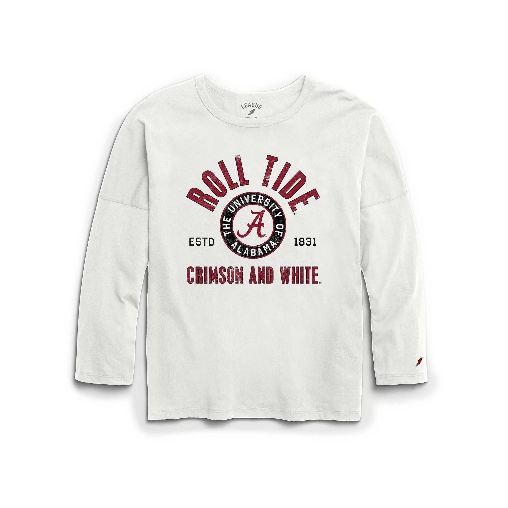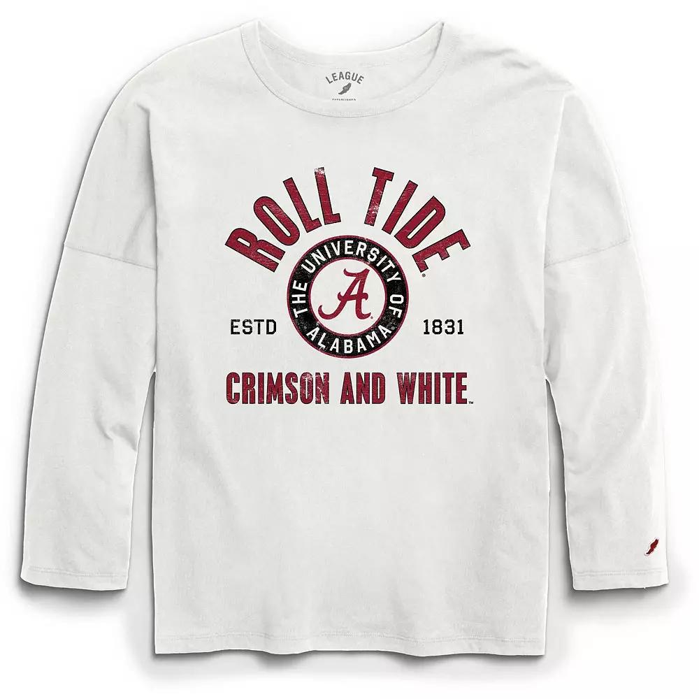 This Clothesline tee from League Collegiate Wear is perfect for game day. It features distressed Alabama Crimson Tide graphics that offer a vintage flair. Dropped shoulders and an oversized design provide a comfortable feel.This Clothesline tee from League Collegiate Wear is perfect for game day. It features distressed Alabama Crimson Tide graphics that offer a vintage flair. Dropped shoulders and an oversized design provide a comfortable feel.PRODUCT FEATURESOfficially licensedMaterial: 100% CottonCrew neckMachine wash, tumble dry lowImportedDropped shouldersBrand: League Collegiate WearDistressed screen print graphicsLong sleeve Color: White. Gender: female. Age Group: adult.