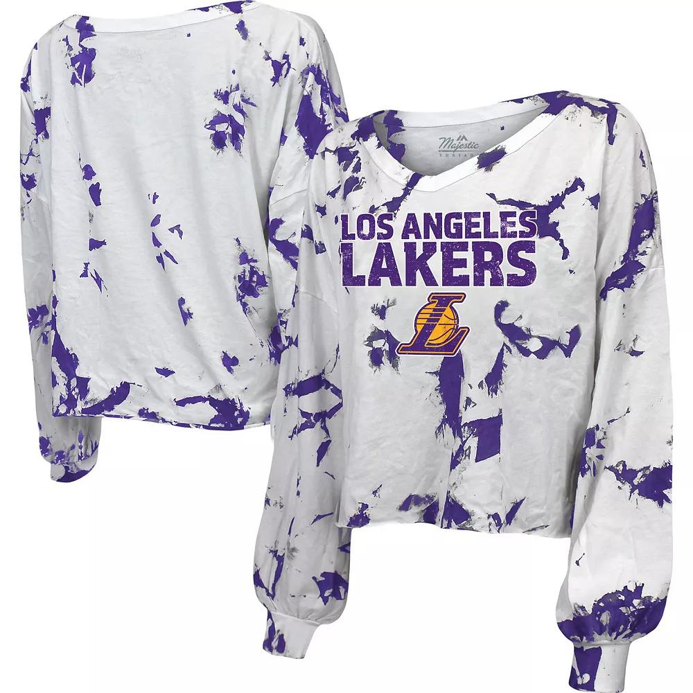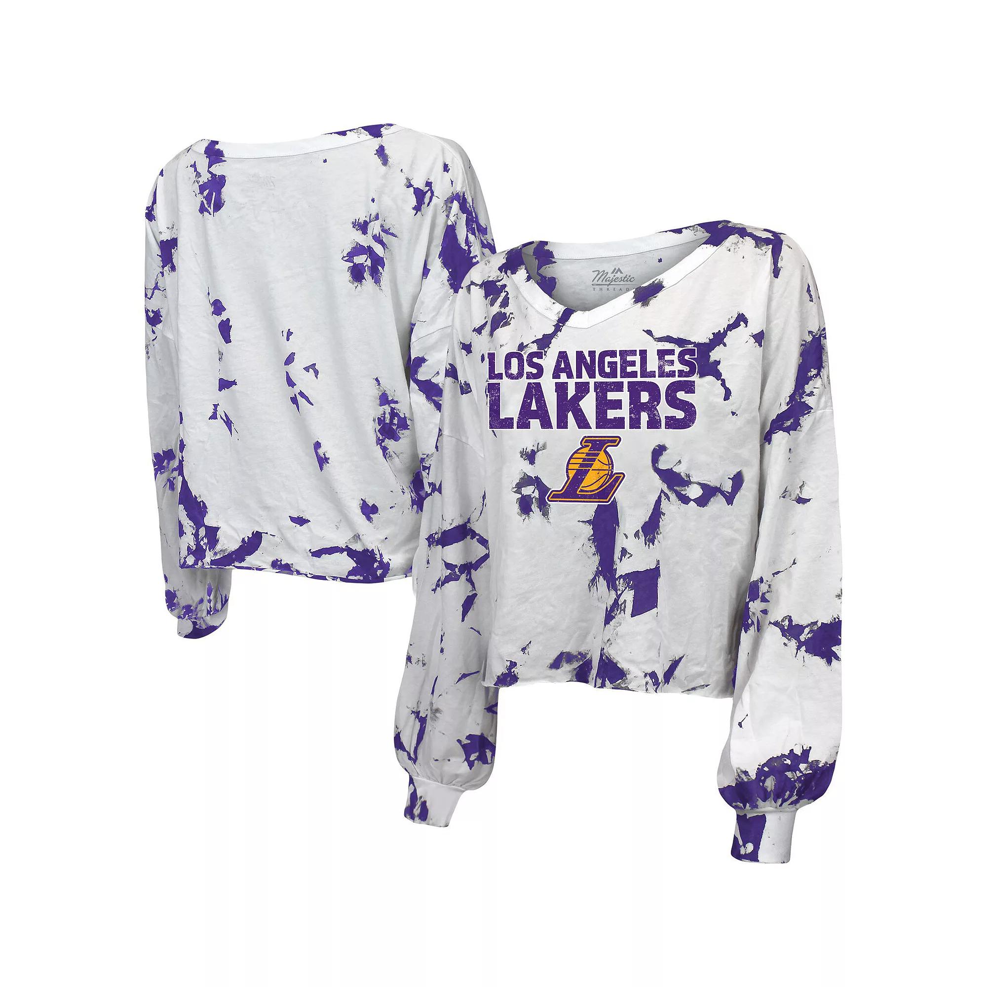 Chic and retro, this Majestic Threads Aquarius T-shirt flexes your Los Angeles Lakers spirit in a charming fashion. The allover tie-dye pattern coordinates with the distressed Los Angeles Lakers graphics for a vintage look. Plus, a wide V-neck lets you change up how you wear this flattering top, while the puffed sleeves add a trendy touch.Chic and retro, this Majestic Threads Aquarius T-shirt flexes your Los Angeles Lakers spirit in a charming fashion. The allover tie-dye pattern coordinates with the distressed Los Angeles Lakers graphics for a vintage look. Plus, a wide V-neck lets you change up how you wear this flattering top, while the puffed sleeves add a trendy touch.Officially licensedTie-dye pattern varies on each T-shirtBrand: Majestic ThreadsV-neckLong sleeveTagless CollarPuffed sleevesCropped fitRaw-edge hemMaterial: 100% CottonMachine wash, tumble dry low Color: White. Gender: female. Age Group: adult.