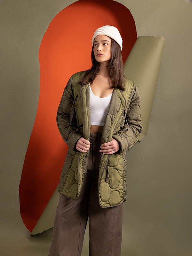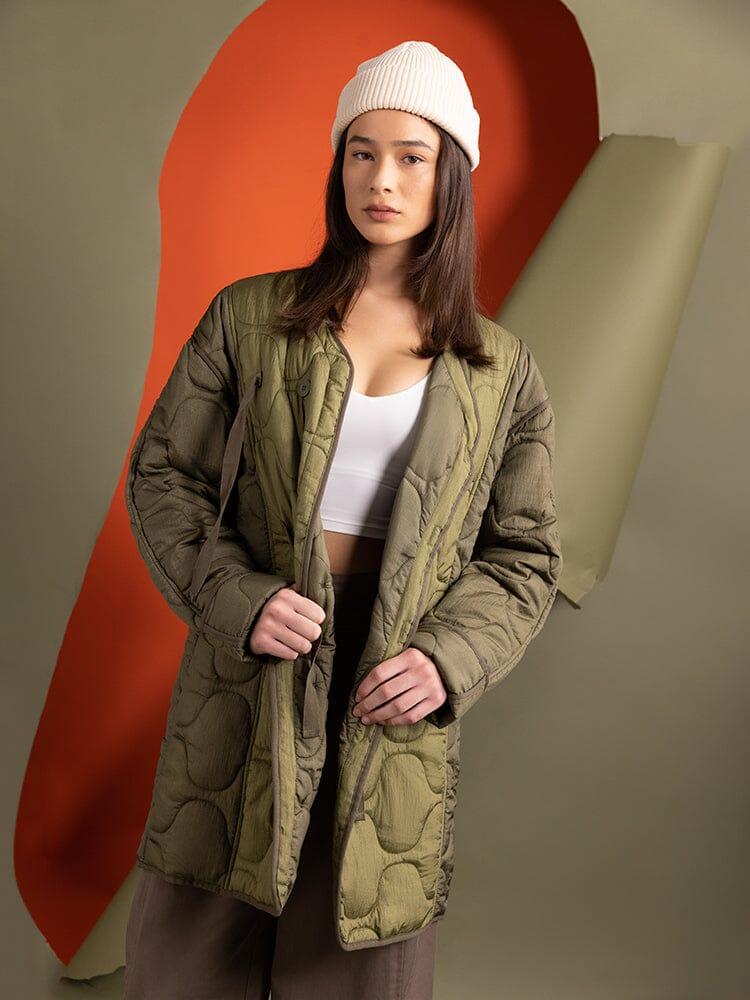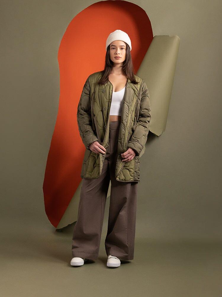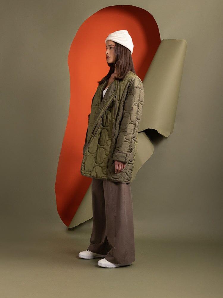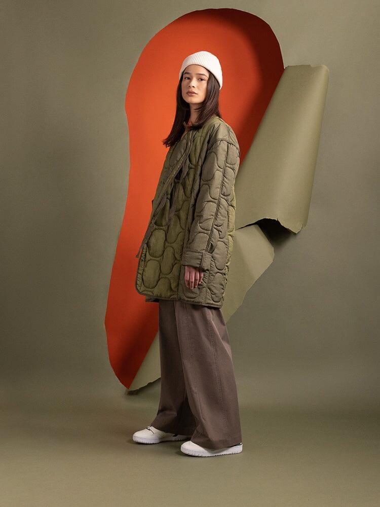 Colors marked down are final sale. Items on final sale cannot be returned or exchanged. Cannot be combined with other discounts or promotions. Go for baggy and cozy with this warm nylon liner, complete with onion quilting and a button-down closure. Pair with our wide leg trousers to lean into the layering trend of the season. FEATURES Fully lined Horizontal onion quilted through and through Asymmetrical center front button closure Cotton herringbone tape ties Tonal binding at seams MODEL INFO Size: Small