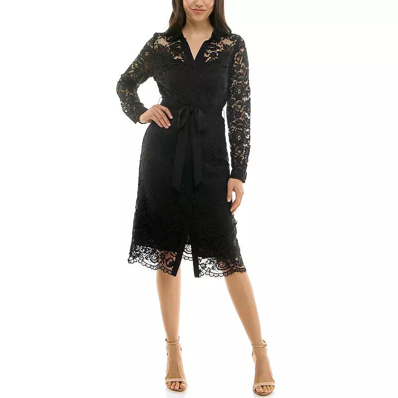 Embrace timeless elegance with this stunning lace shirtdress from Nanette Lepore. Designed to gracefully flatter any silhouette, it features a refined placket and a self-tie belt that accentuates your waist, making it perfect for both casual outings and special occasions alike. Click on this WOMEN'S GUIDE to find the perfect fit and more! - https://www.kohls.com/feature/womens-fit-guide.jsp. FEATURES: Lace construction, Flounce hem, Button front, Barrel cuffs, Long sleeves, Front-tie sash, Fully lined, Collared neckline. FIT & SIZING: Shirtdress, 43-in. length from shoulder to hem, Midi length hits below the knee. FABRIC & CARE: Nylon, rayon, Polyester lining, Machine wash and tumble dry low, Imported. Size: 12. Color: Very Black. Gender: female. Age Group: adult. Material: COTTON BLEND.