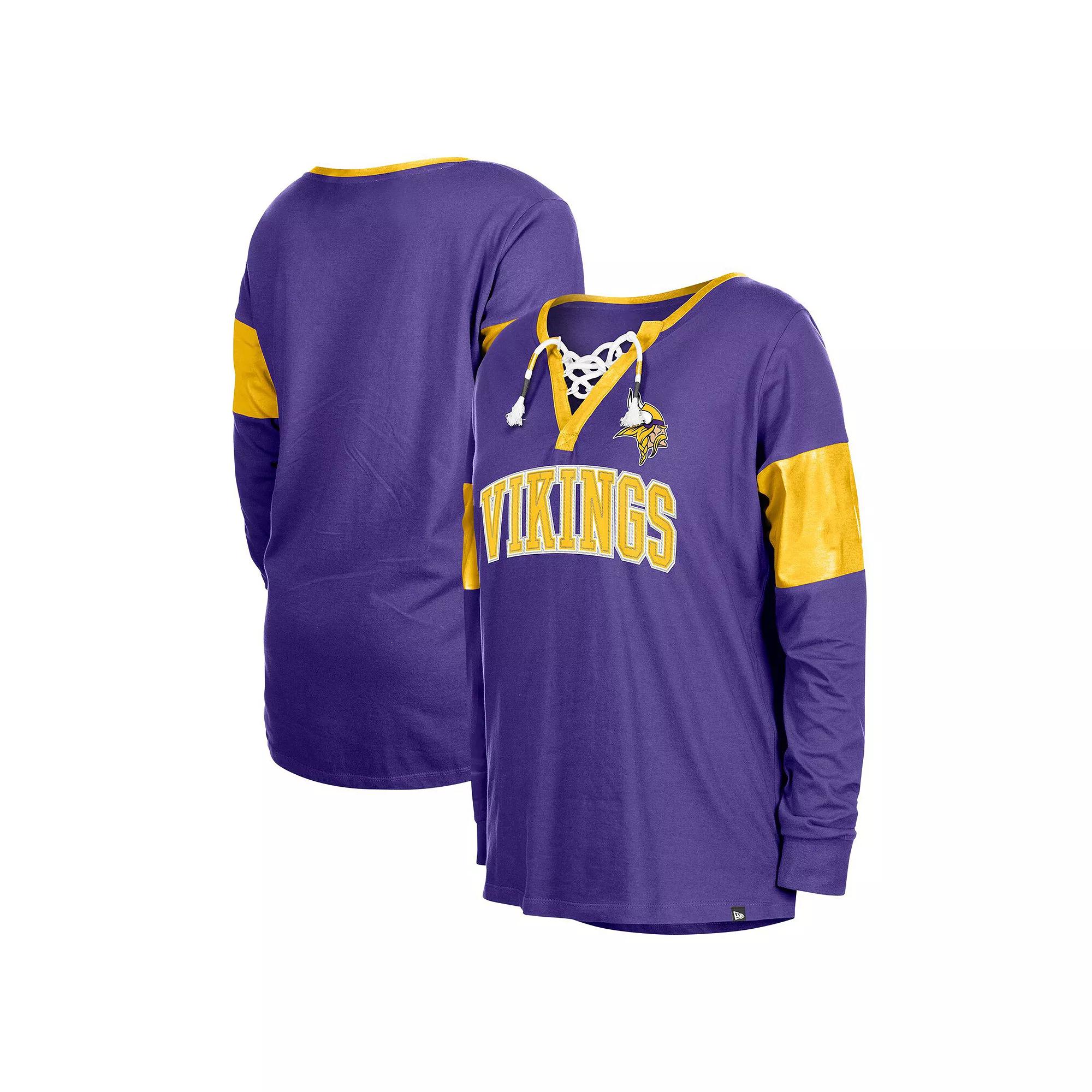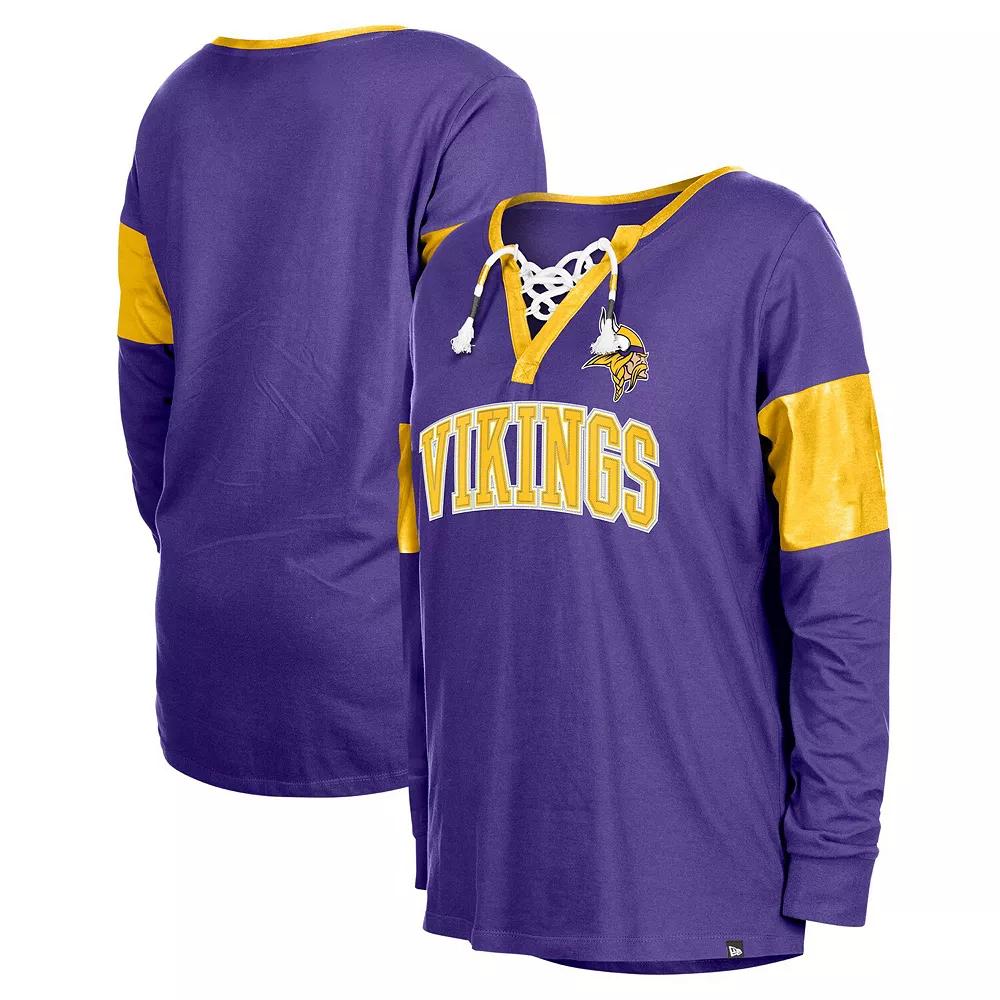 Enhance your Minnesota Vikings game day style with this unique New Era Lace-Up Notch-Neck Long Sleeve T-Shirt. Featuring a notch neck with lace-up detail, this tee adds a touch of style to your game-day look. The contrast-color sleeve inserts and rounded droptail hem create a flattering silhouette, while the team name across the front proudly displays your Minnesota Vikings fandom.Enhance your Minnesota Vikings game day style with this unique New Era Lace-Up Notch-Neck Long Sleeve T-Shirt. Featuring a notch neck with lace-up detail, this tee adds a touch of style to your game-day look. The contrast-color sleeve inserts and rounded droptail hem create a flattering silhouette, while the team name across the front proudly displays your Minnesota Vikings fandom.PRODUCT FEATURESMaterial: 100% CottonMachine wash, tumble dry lowOfficially licensedImportedLong sleeveNotch neck with lace-up detailLace-upRounded droptail hemTackle twill team name across the frontBrand: New EraContrast-color sleeves insets sewn in Color: Purple. Gender: female. Age Group: adult.