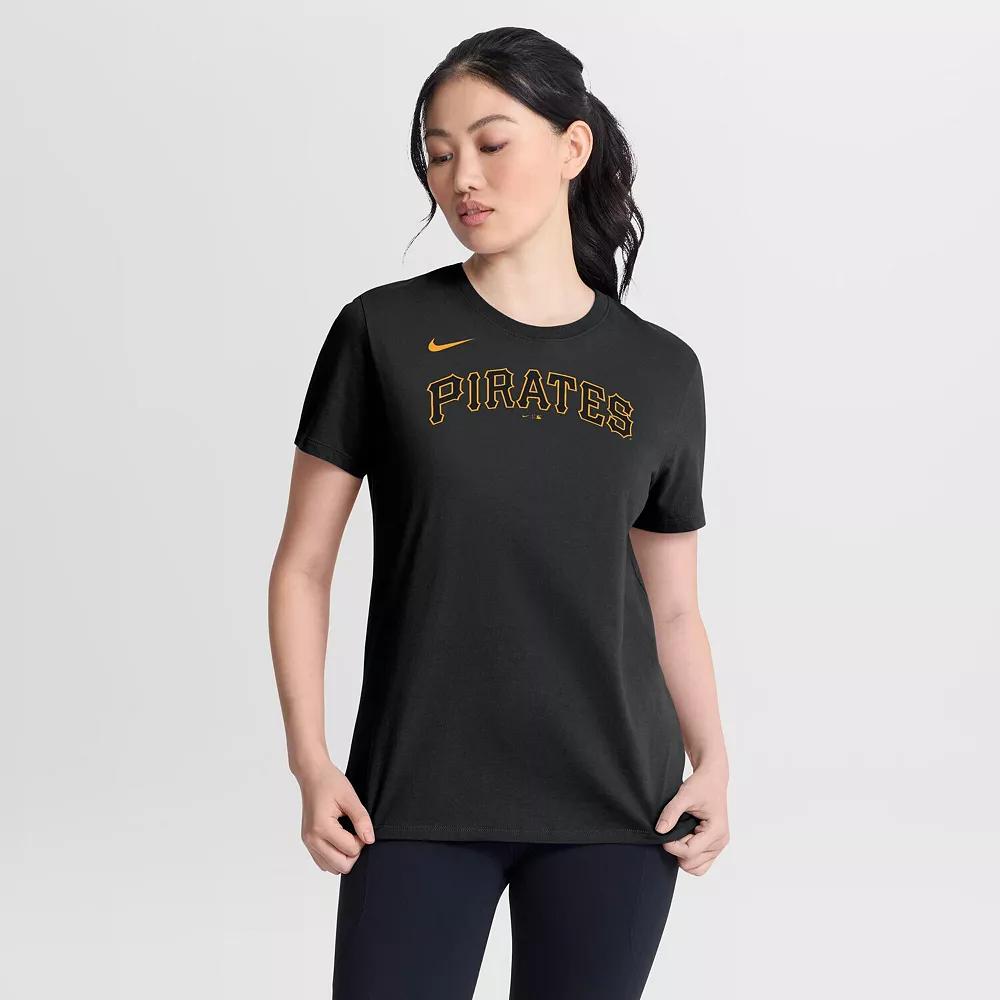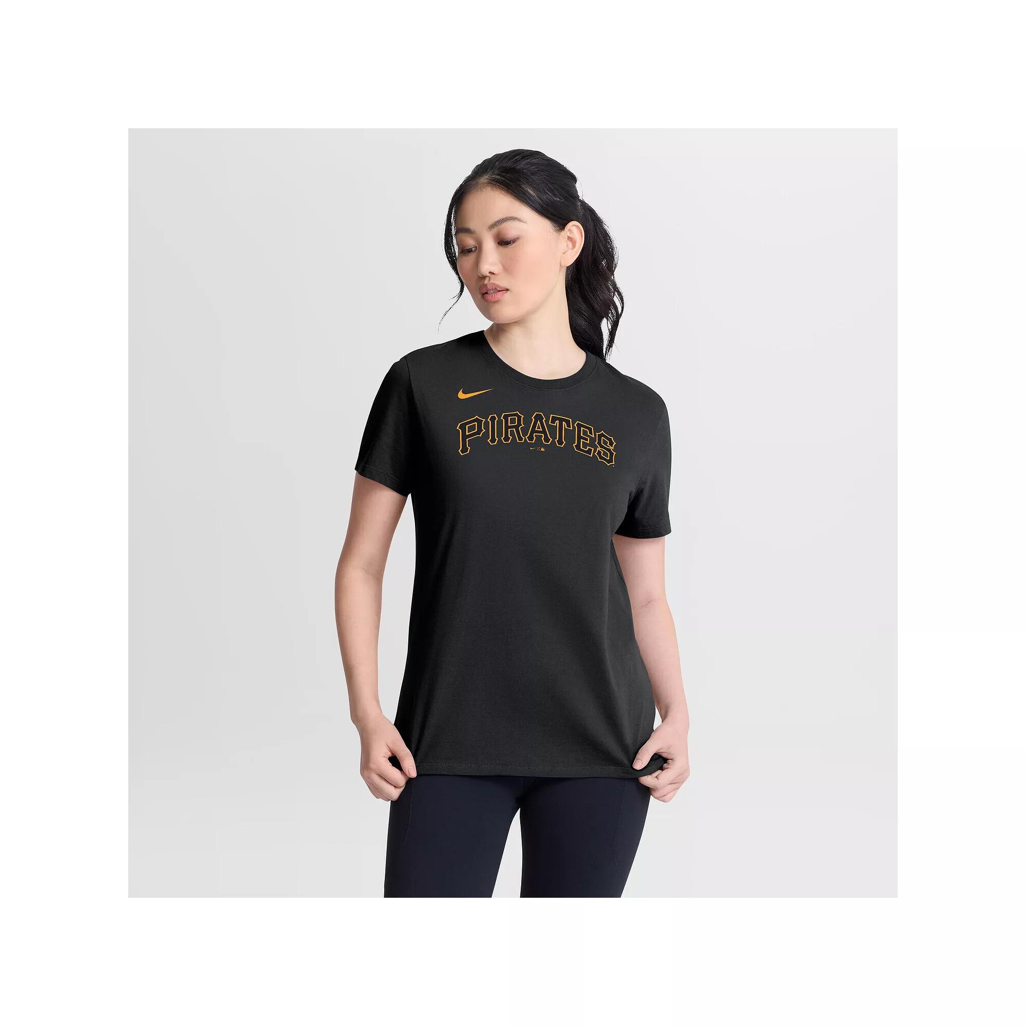 Refresh your casual Pittsburgh Pirates apparel with this Wordmark T-Shirt by Nike. It features the team wordmark printed on the front of lightweight jersey fabric. The traditional fit makes this Pittsburgh Pirates tee ideal for everyday wear. Material: 90% Cotton/10% Organic Cotton. Brand: Nike. Standard Fit: Easy and traditional. Machine wash, tumble dry low. Short sleeve. Jersey fabric has a lightweight feel (150gsm). Officially licensed. Team wordmark screen printed across the front. Imported. Crew neck. Model is wearing size S and is 5'9. Color: Black. Gender: female. Age Group: adult.