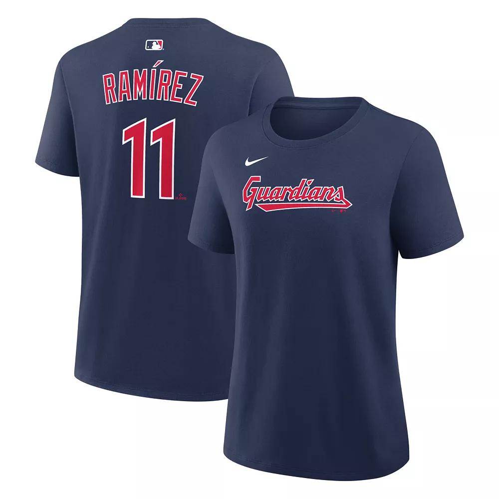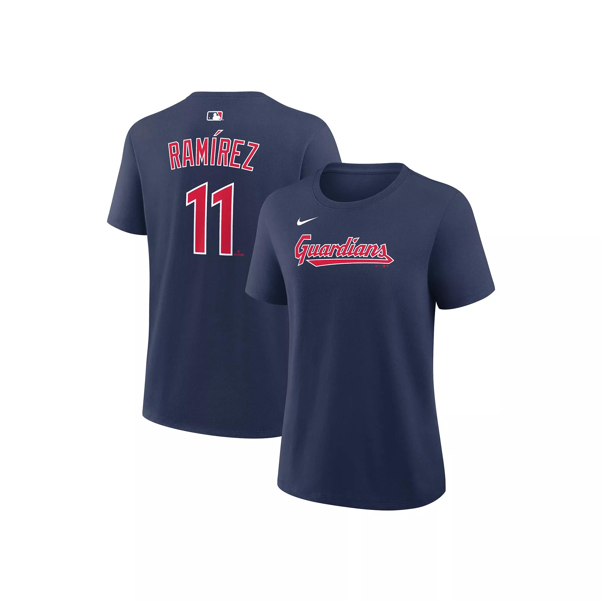 Spotlight your favorite Cleveland Guardians player with this Jos Ramrez Name & Number T-Shirt from Nike. Its jersey-like design features the team wordmark printed on the front and player details displayed across the back. Midweight cotton fabric keeps you comfortable as you root for the Cleveland Guardians in this Jos Ramrez tee. Brand: Nike. Jersey fabric has a midweight feel (155gsm). Machine wash, tumble dry low. Jersey Color Style: Home. Short sleeve. Screen printed team wordmark. Imported. Officially licensed. Material: 100% Cotton. Crew neck. Standard Fit: Not too tight or loose over your body. Nameplate and number on the back are inspired by official jerseys. Color: Grd Navy. Gender: female. Age Group: adult.
