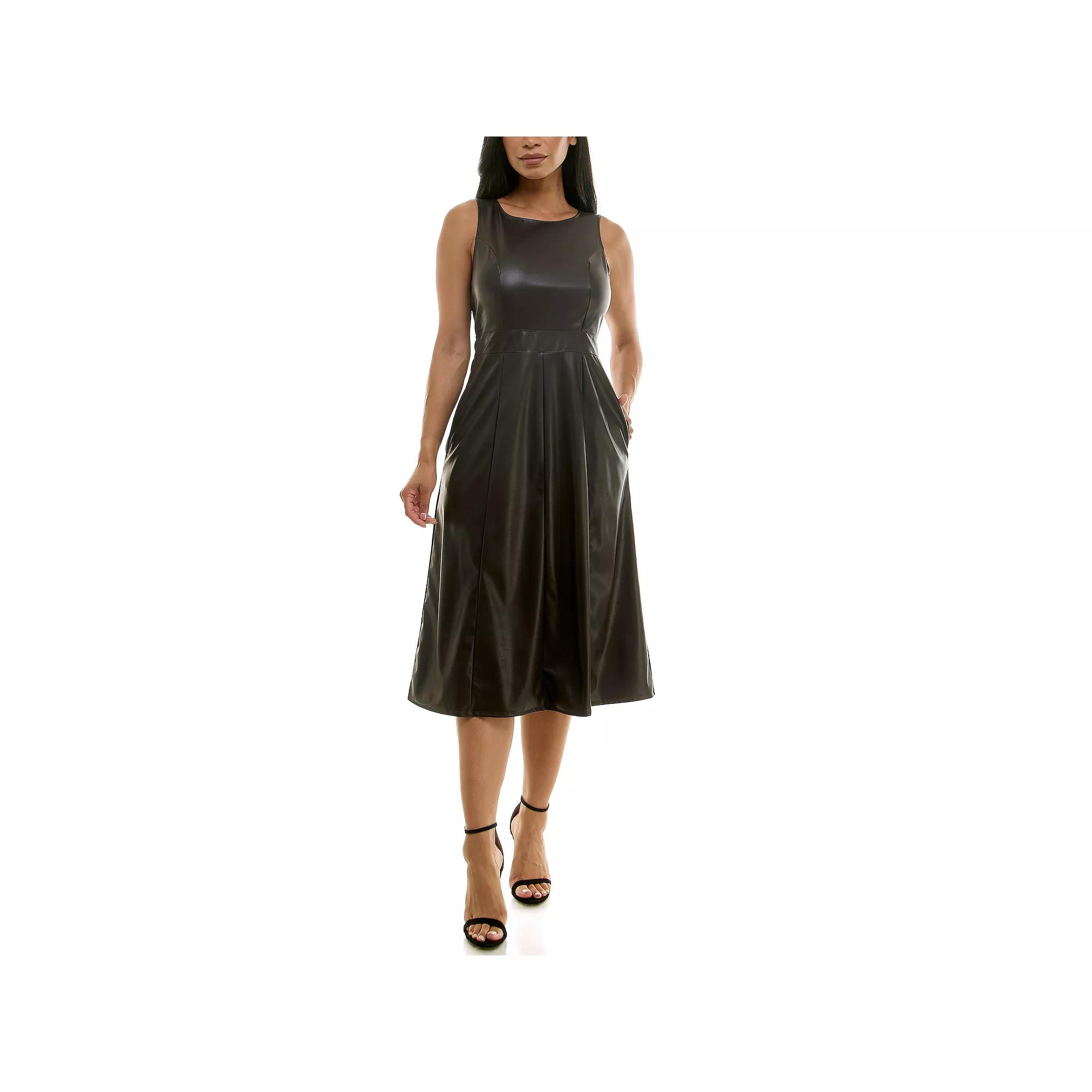 This womens faux leather fit and flare midi dress from Nina Leonard is sure to quickly become a favorite in your wardrobe.Click on this WOMENS GUIDE to find the perfect fit and more! This womens faux leather fit and flare midi dress from Nina Leonard is sure to quickly become a favorite in your wardrobe. Click on this WOMENS GUIDE to find the perfect fit and more! FEATURES Fit & flare silhouette Zipper closure Scoopneck Sleeveless Waistband and pleated flare skirt 2 pockets Soft, faux leather construction UnlinedFIT & SIZING True to size 46-in. length from shoulder to hem Midi length hits below the kneeFABRIC & CARE Polyester, spandex Machine wash Imported Size: Small. Color: Black. Gender: female. Age Group: adult.