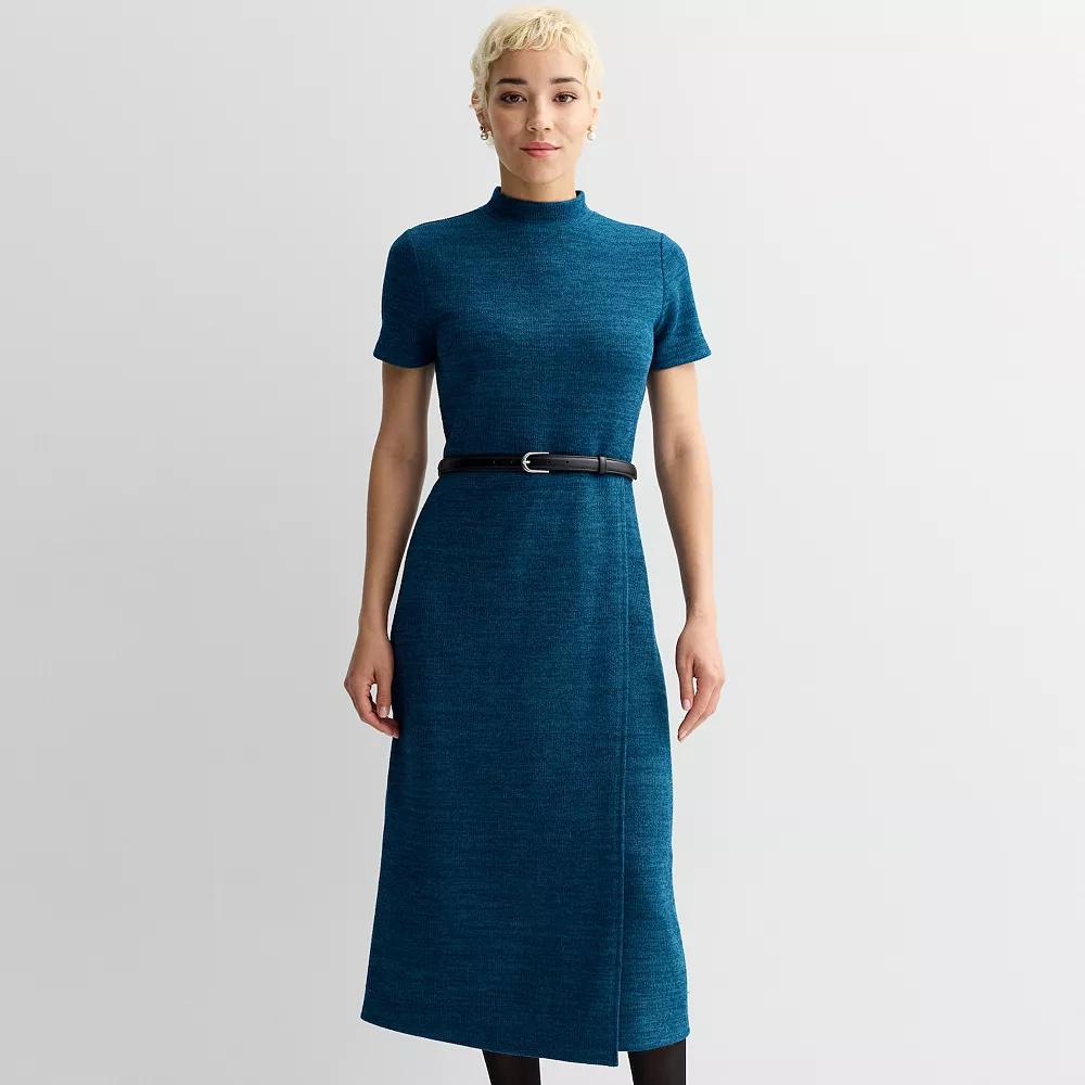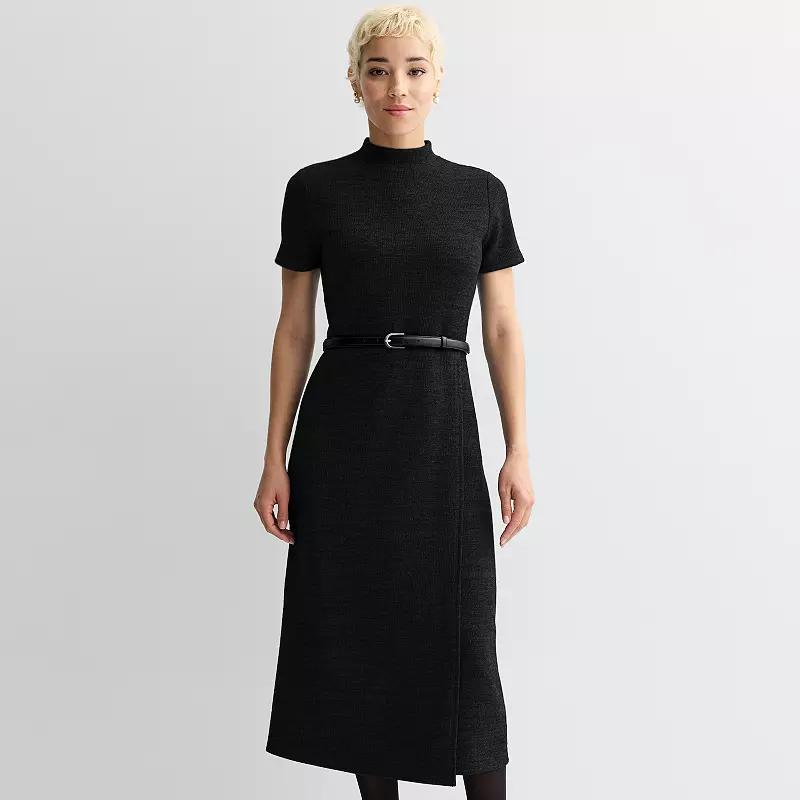 Step into effortless style with this chic midi dress that blends comfort and sophistication like a pro. Perfect for everything from casual brunches to office meetings, it beautifully flatters your silhouette while keeping you at ease all day long—because who says you can't look fabulous while feeling fabulous? Click on this WOMEN'S GUIDE to find the perfect fit and more! - https://www.kohls.com/feature/womens-fit-guide.jsp. FEATURES: Ribbed texture for added style, Soft feel enhances comfort. FIT & SIZE: Sweaterdress styling, Midi length hits below the knee, Fitted through the hip and thigh. MATERIAL & CARE: Body: polyester, spandex, Unlined, Machine wash. DETAILS: Button closure, Coordinating belt, Turtleneck, Short sleeves, Imported. Size: L Petite. Color: Mineral Black. Gender: female. Age Group: adult. Material: OTHER MATERIAL.