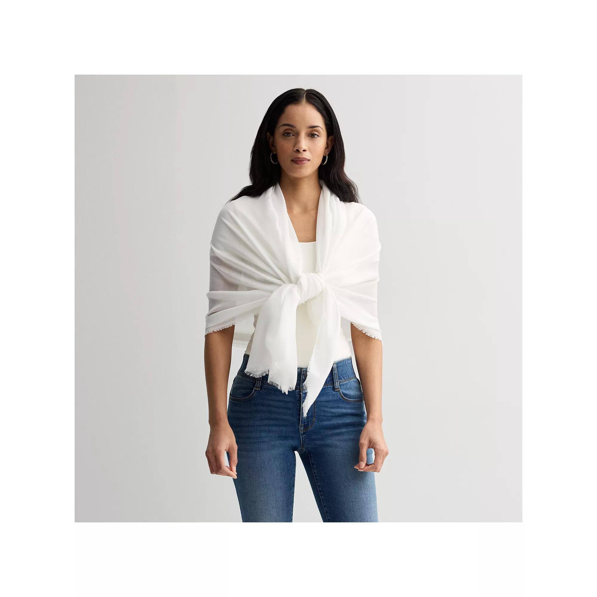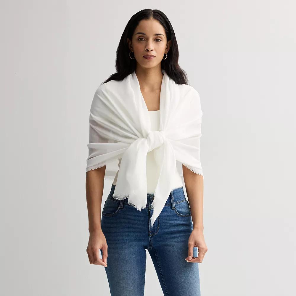 Take your look to a whole new level with this womens solid oversized gauze wrap scarf from Nine West. How do you accessorize? Check out our ACCESSORIES GUIDE for essential tips to elevate your style with must-have accessories.Take your look to a whole new level with this womens solid oversized gauze wrap scarf from Nine West. How do you accessorize? Check out our ACCESSORIES GUIDE for essential tips to elevate your style with must-have accessories.FEATURES Oversized wrap scarf silhouette 0.5-in. self fringe all 4 sides LightweightFIT & SIZING 37W x 72L One size fits mostFABRIC & CARE Polyester Hand wash Imported Color: White. Gender: female. Age Group: adult.