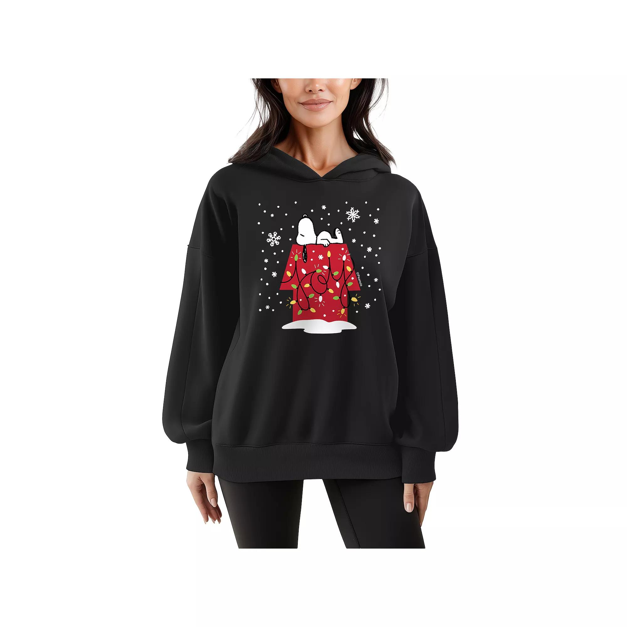 Get ready to unleash your inner child while staying cozy with this adorable hoodie. Featuring the beloved Snoopy wrapped in holiday cheer, it's perfect for snuggling up during those chilly evenings or making a stylish statement while out and about. Click on this WOMEN'S GUIDE to find the perfect fit and more! - https://www.kohls.com/feature/womens-fit-guide.jsp. FEATURES: Cozy attached hood for added warmth, Stylish design with festive graphics. FIT & SIZE: Oversized fit. MATERIAL & CARE: Body: Cotton, polyester, fleece, Machine wash. DETAILS: Crewneck, Long sleeves, Imported. Size: Large. Color: Black. Gender: female. Age Group: adult.