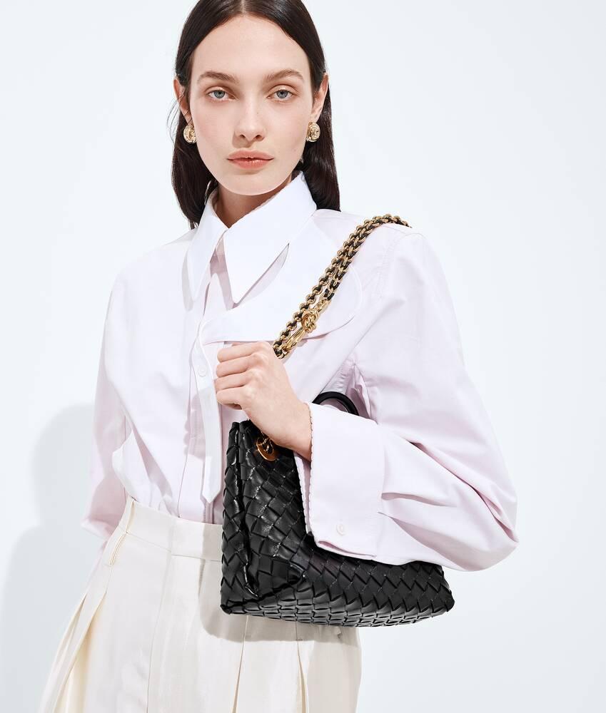 • Small Intrecciato leather top handle bag with sliding cross-body chain• Compartmented interior with one zippered pocket, two open pockets• Magnetic closure
