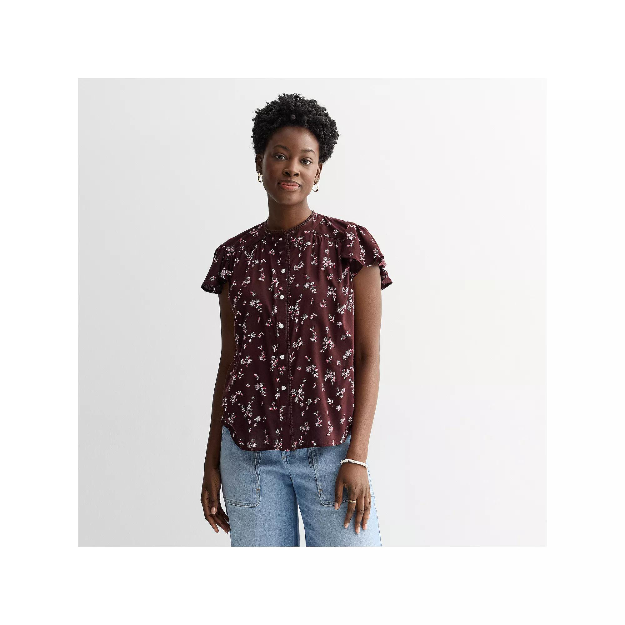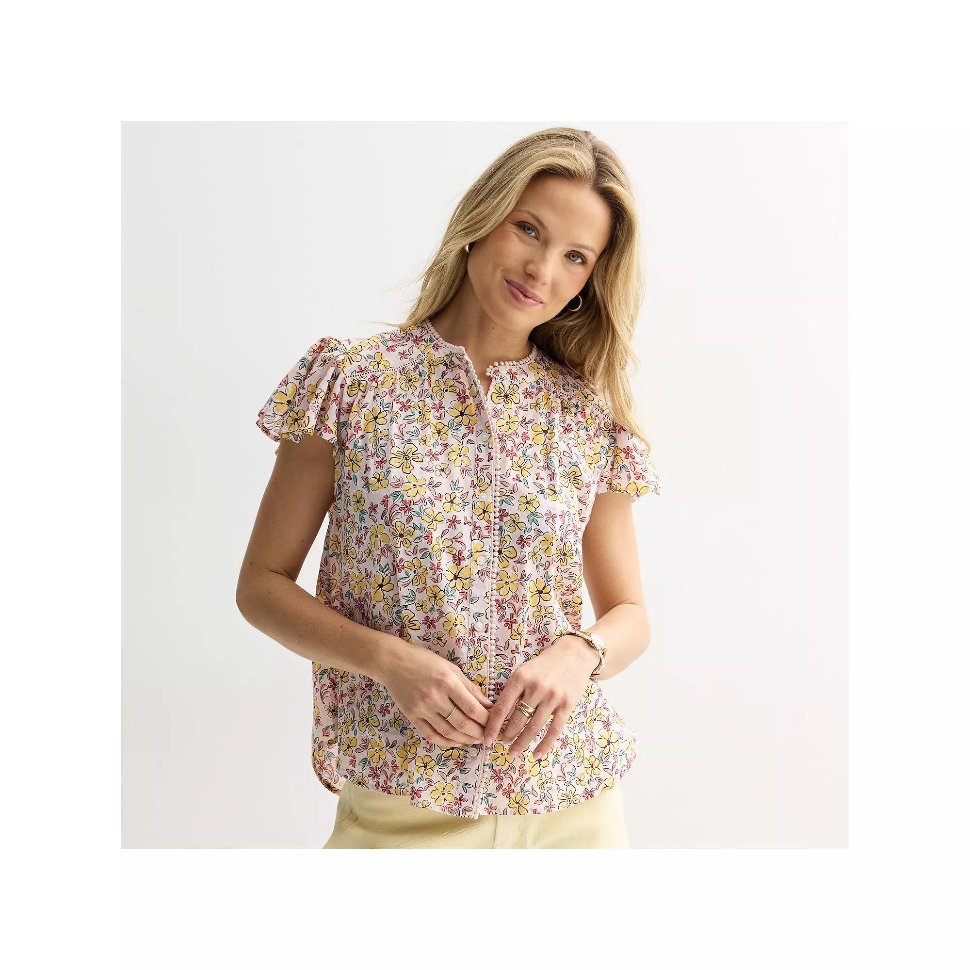Refresh your spring wardrobe with this women's Sonoma Goods For Life button front popover. Click on this WOMEN'S GUIDE to find the perfect fit and more! - https://www.kohls.com/feature/womens-fit-guide.jsp. FEATURES: Ladder lace at shoulder, Pom pom lace at placket. FIT & SIZE: Loose fit, 25 1/4-in. length from shoulder to hem, High-low hem. MATERIAL & CARE: Cotton, modal, Unlined, Machine wash and tumble dry low. DETAILS: Button front, Short sleeves, Ruffle sleeves, Imported. Size: Small. Color: Pink Yellow Floral. Gender: female. Age Group: adult. Material: COTTON / MODAL.
