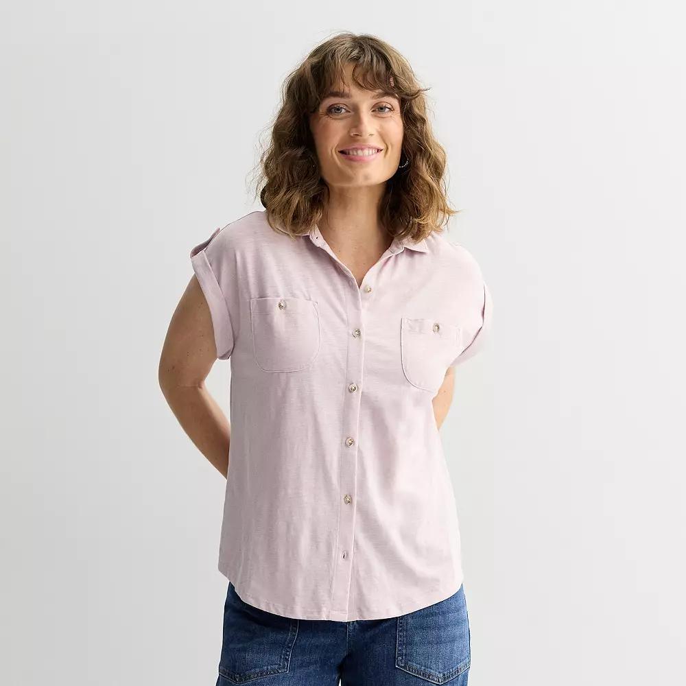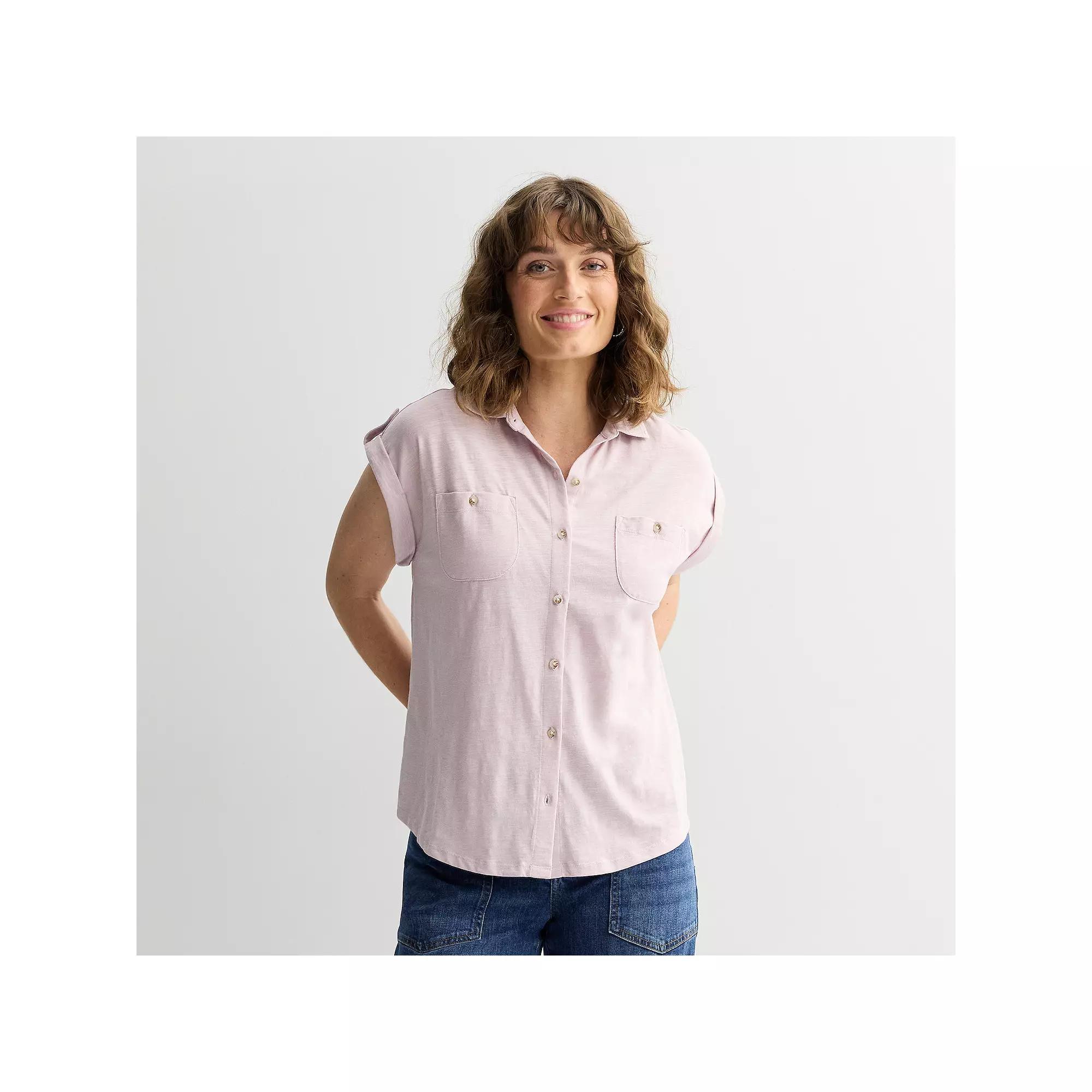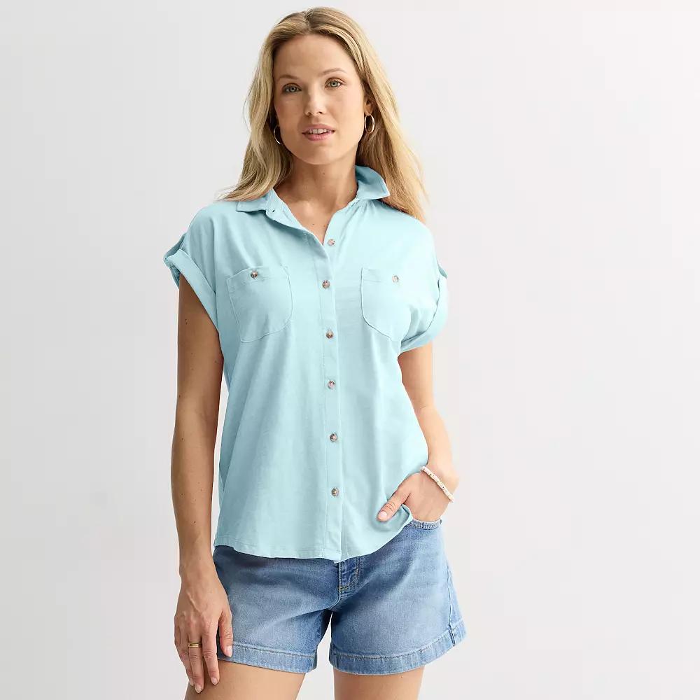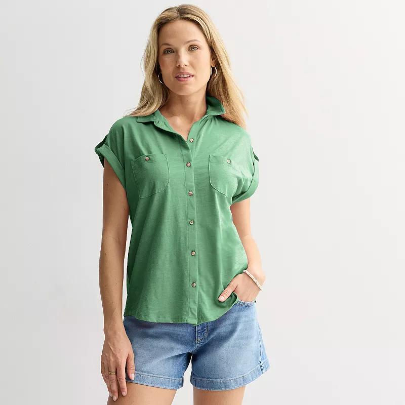 Enjoy comfort and style with this bright Sonoma Good For Life top. With a lovely knit construction and 2 front pockets, you will wonder how you ever lived without this piece. Click on this WOMEN'S GUIDE to find the perfect fit and more! - https://www.kohls.com/feature/womens-fit-guide.jsp. FEATURES: Knit construction. FIT & SIZE: 27 1/4-in. length from shoulder to hem, Shirttail hem. MATERIAL & CARE: Cotton, polyester, Unlined, Machine wash. DETAILS: Button closure, Collared neckline, Short dolman sleeves, Sewn-rolled cuffs, 2 front pockets, Imported. RESPONSIBLE Supports more sustainable cotton farming. Size: Medium. Color: Suede Green. Gender: female. Age Group: adult. Material: COTTON BLEND.